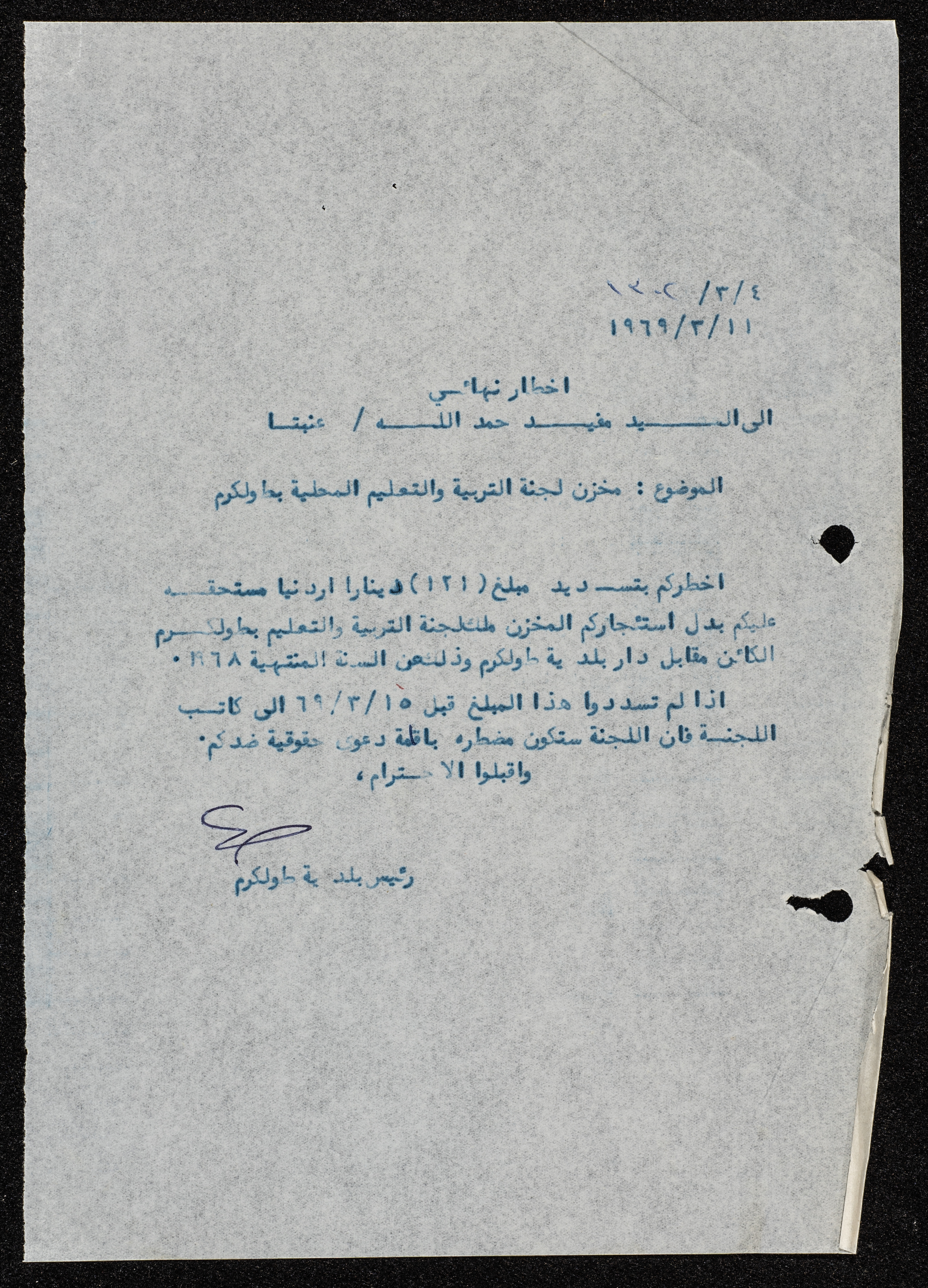 A payment notice from the education tax committee to Mufid Hamdallah to pay the rent on one of the committee's storehouses he is renting, for the year 1968.