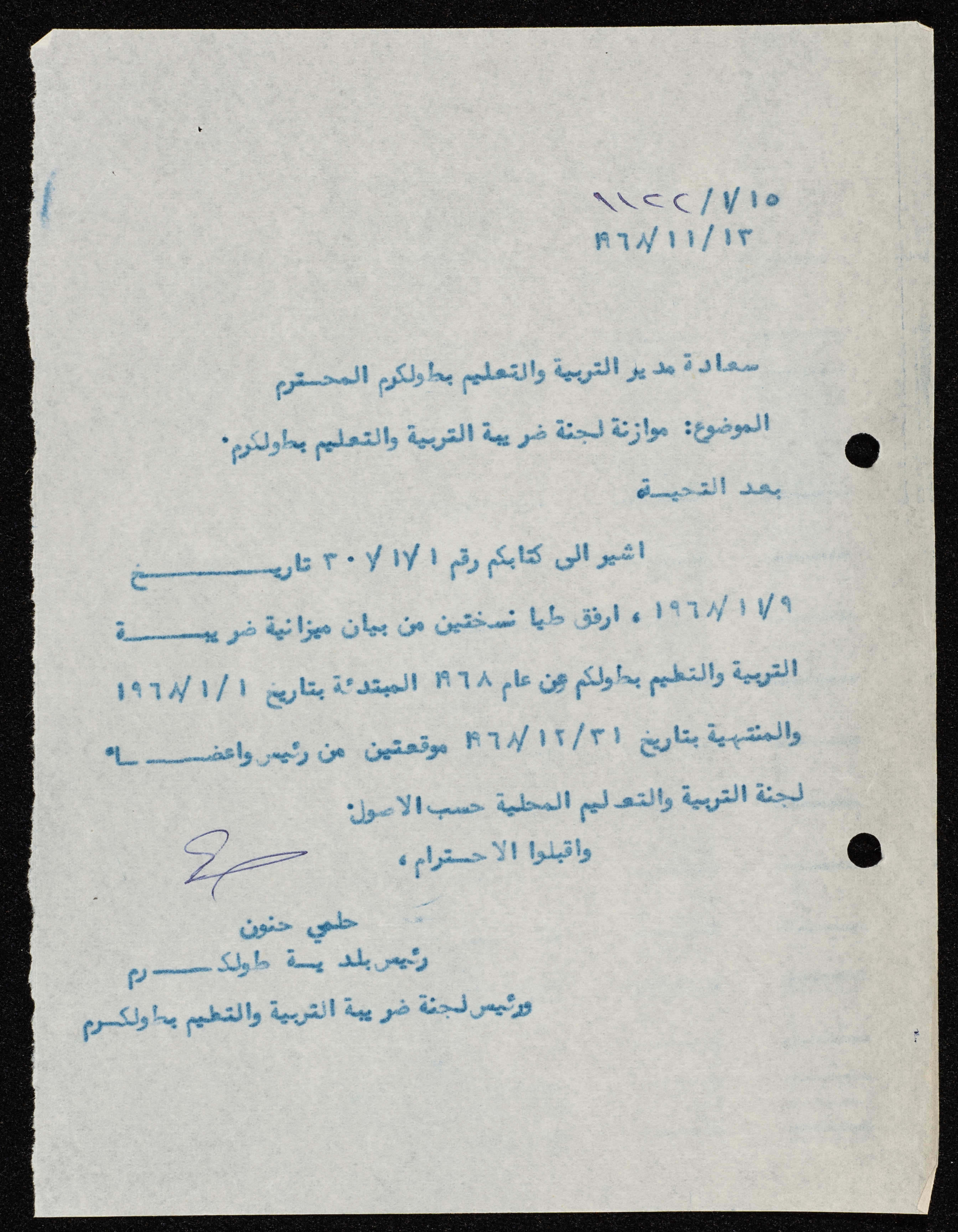 A letter from the mayor of Tulkarm, Hilmy Hannun to the education director in Tulkarm, attached to the letter is two copies of the budget statement of the education tax committee 1968.