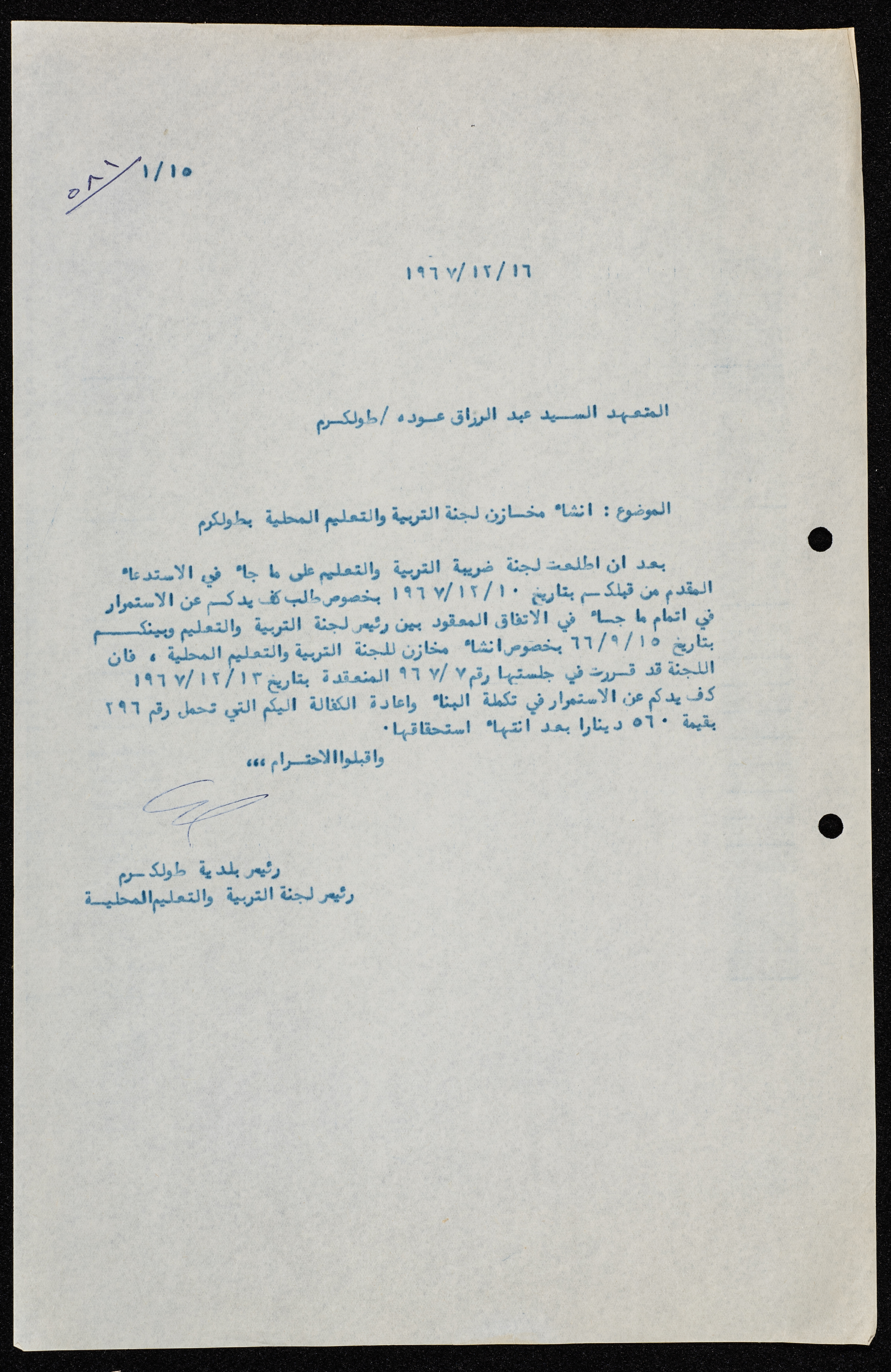 A letter from the mayor of Tulkarm, Hilmy Hannun to the contractor, ʿabdur-Razzaq ʿodeh, telling him that the committee has decided to stop him from building the storehouses of the education tax committee.