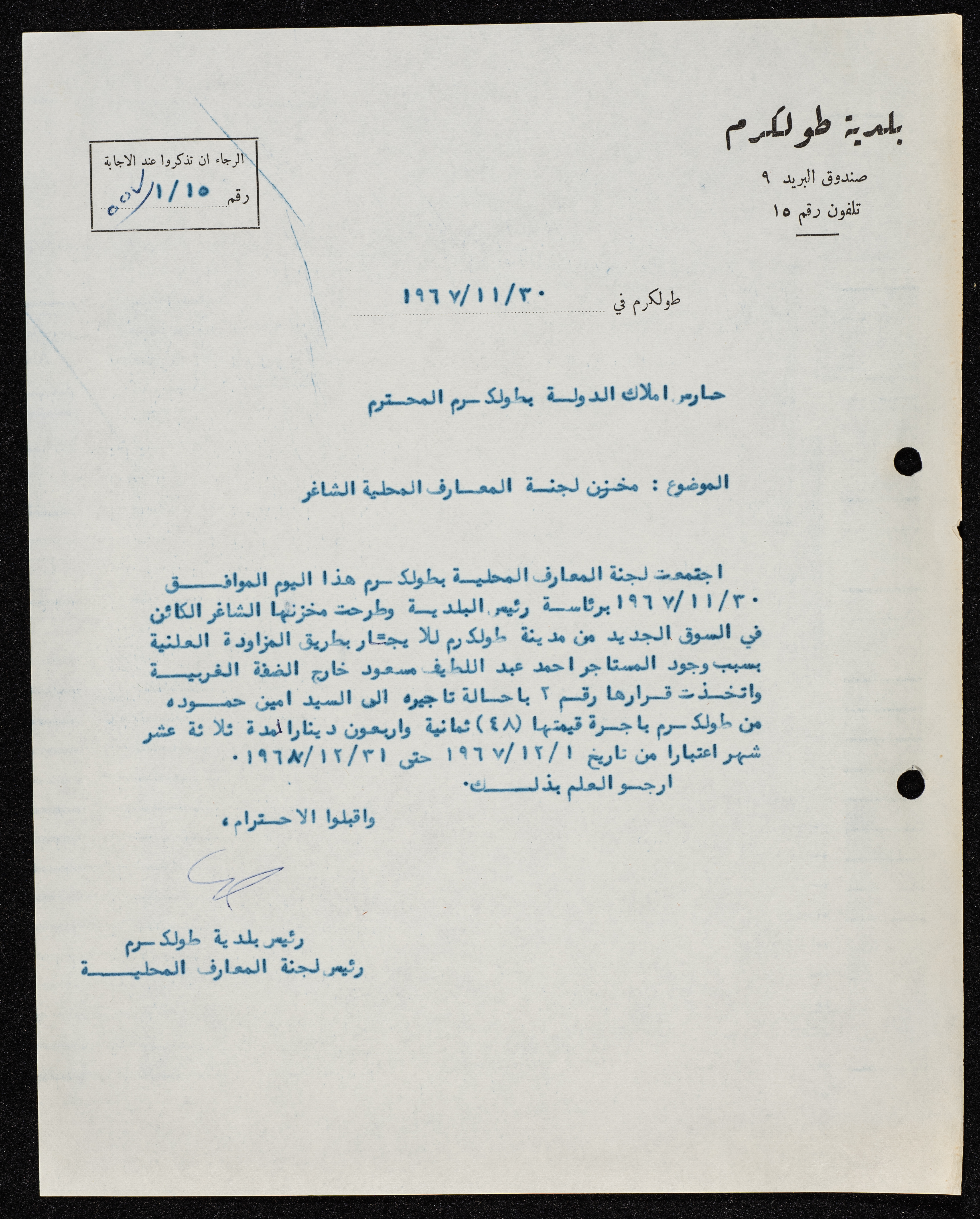 A letter by the mayor of Tulkarm, Hilmy Hannun to the state property guard, discussing the subject of the vacant committee storehouse.
