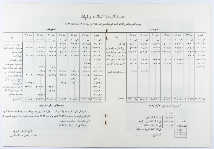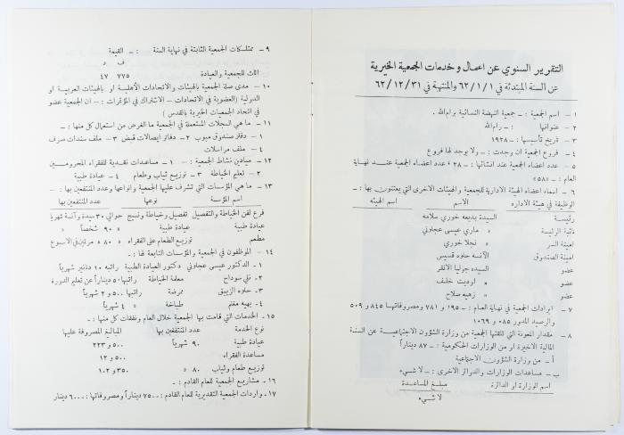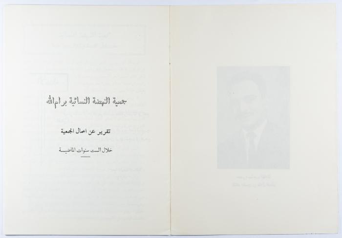 كتيّب بعنوان "جمعية النهضة النسائية" صادر عن جمعية النهضة النسائية في رام الله، عام 1962. يتناول الكتيّب عدة قضايا ذات صلة بالجمعية من قبيل نشاطاتها وعضواتها وميزانياتها للأعوام 1957- 1962.
