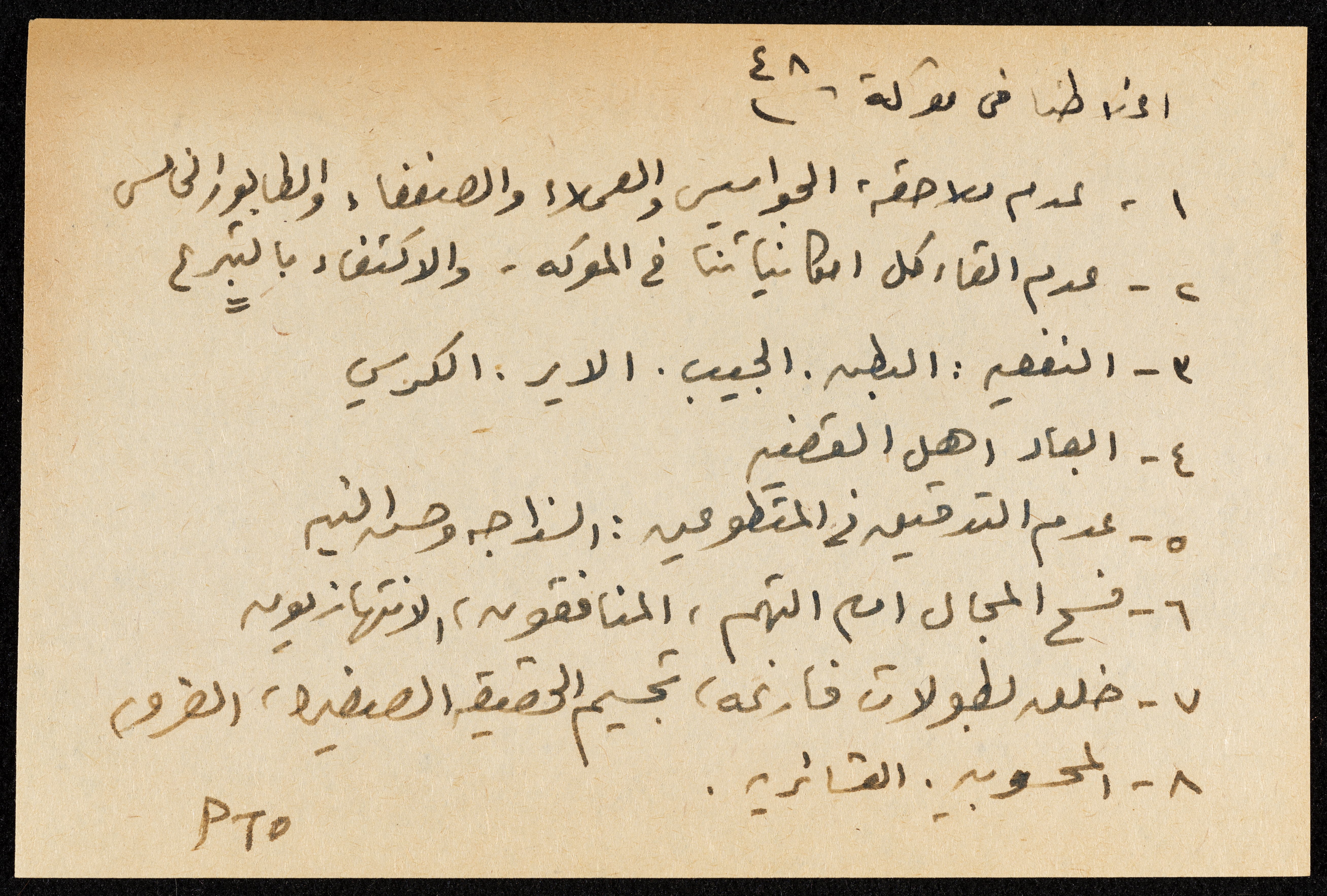 صورة لقصاصة ورقية ملونة ومكتوبة بخط اليد باللغة العربية ومعنونة بأغلاطنا في معركة 48 ،وفيها عدة نقاط عن الأغلاط التي وقع فيها الفلسطينيون.