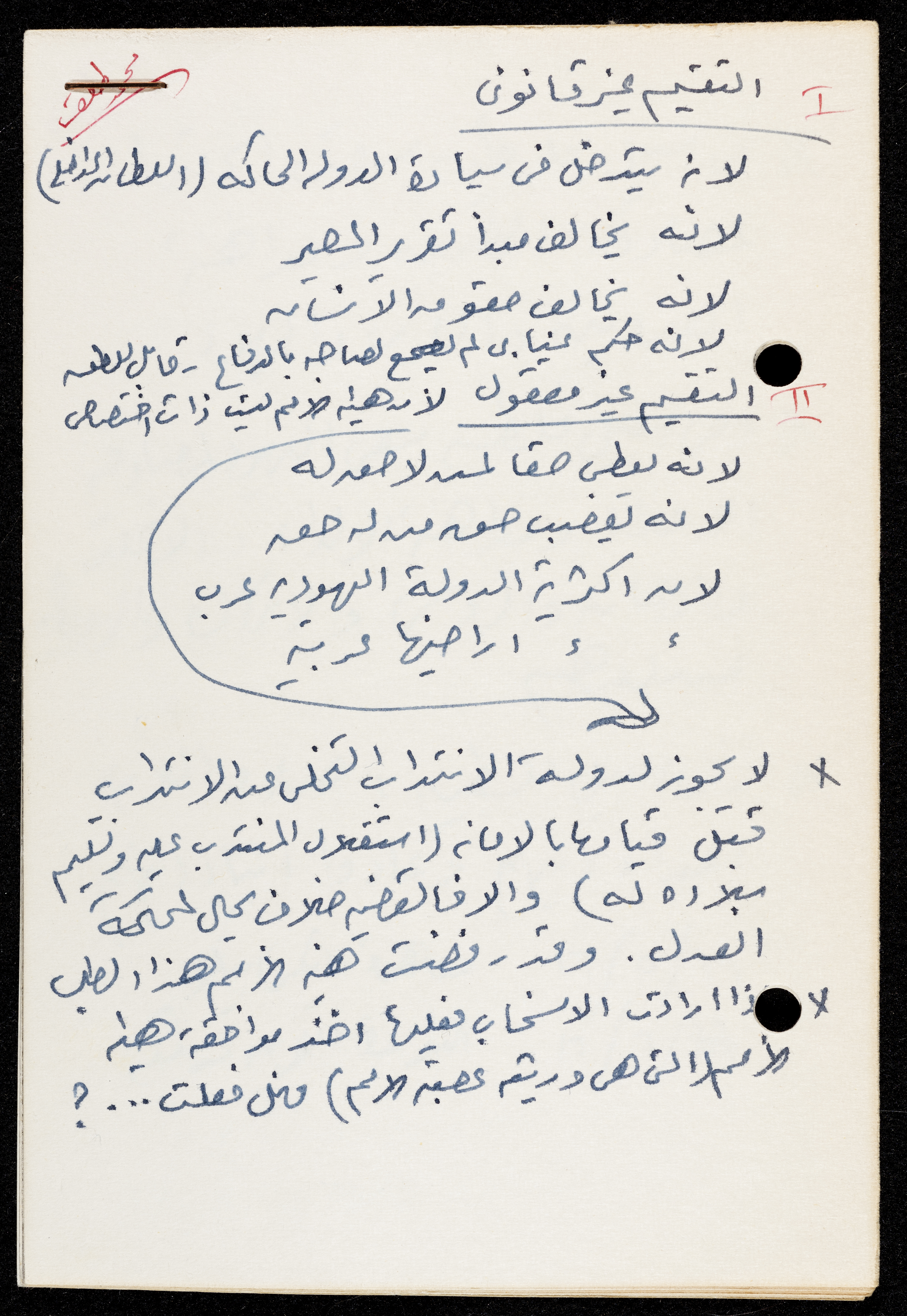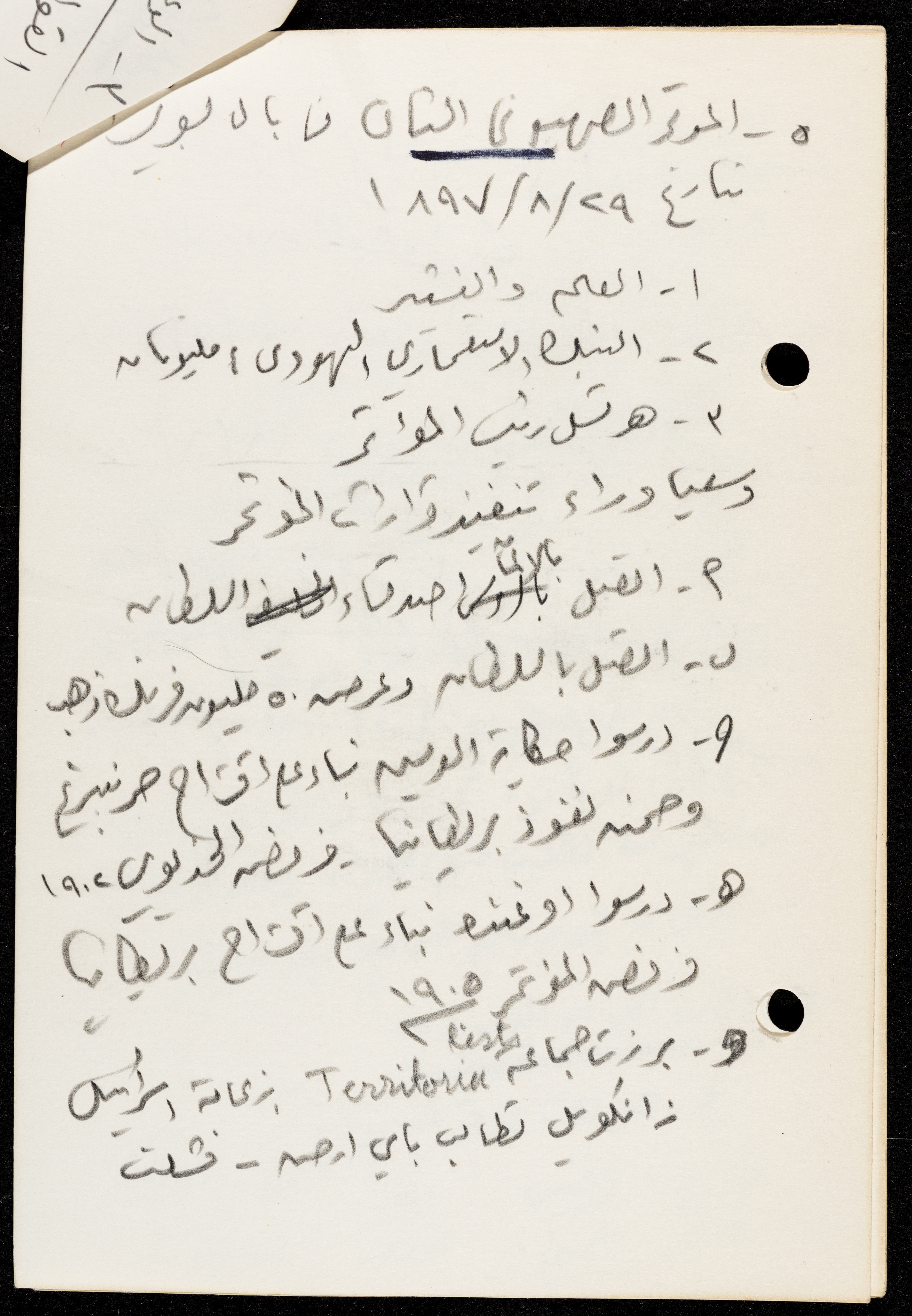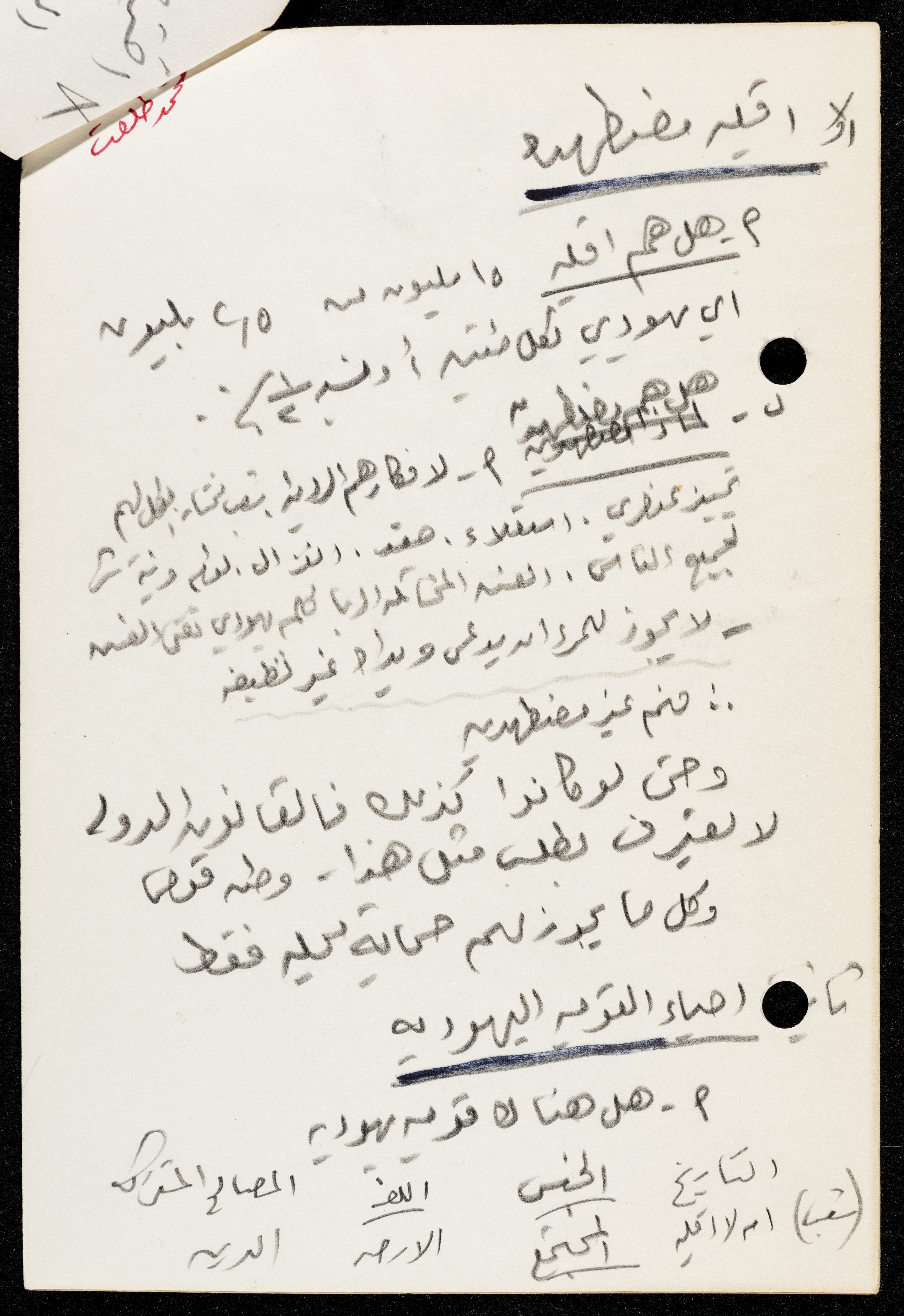 صورة ملونة لورقة بيضاء كتبت بخط اليد باللغة العربية بعنوان التقسيم غير قانوني،وفيها نقاط تتعلق بالانتداب البريطاني.