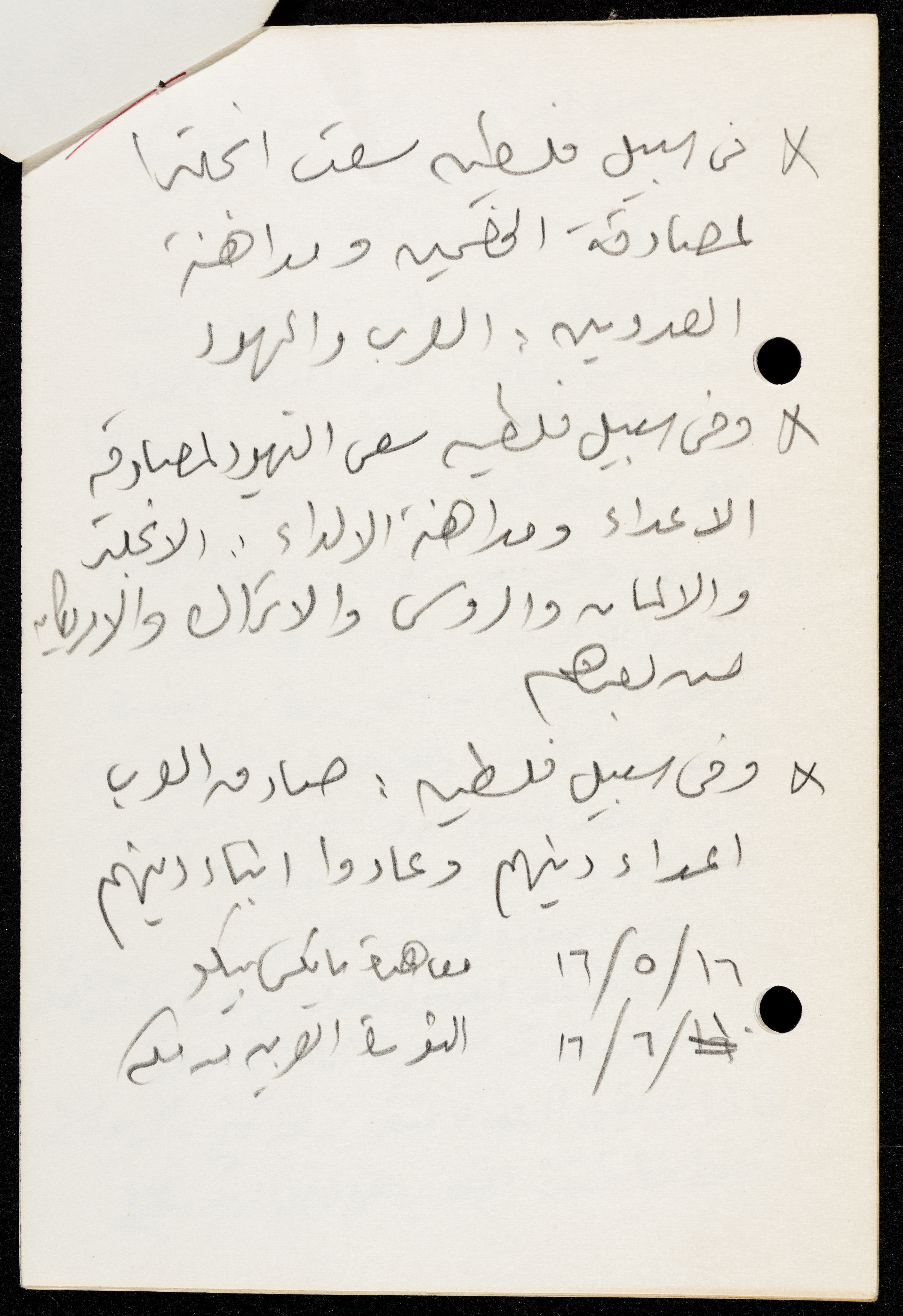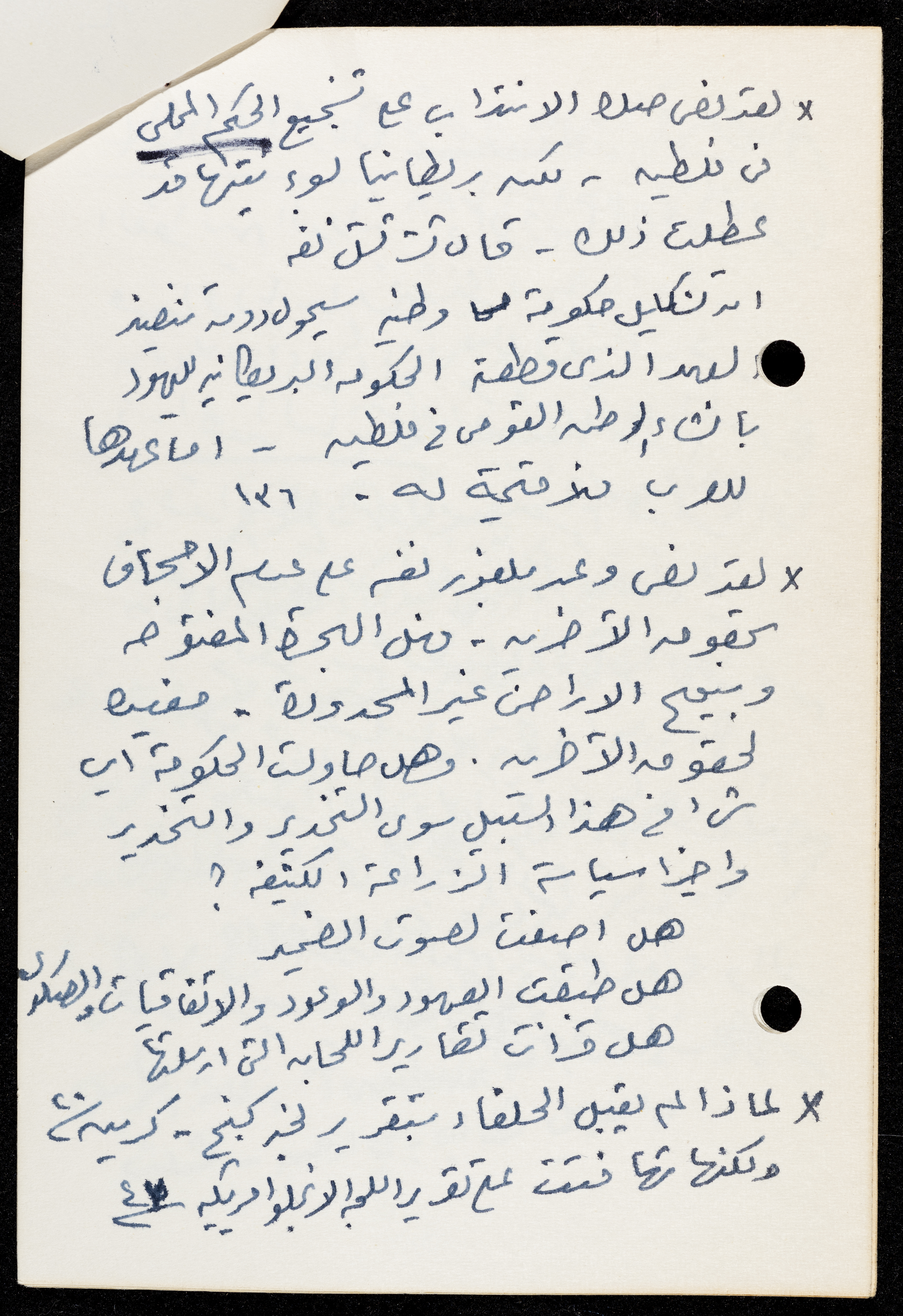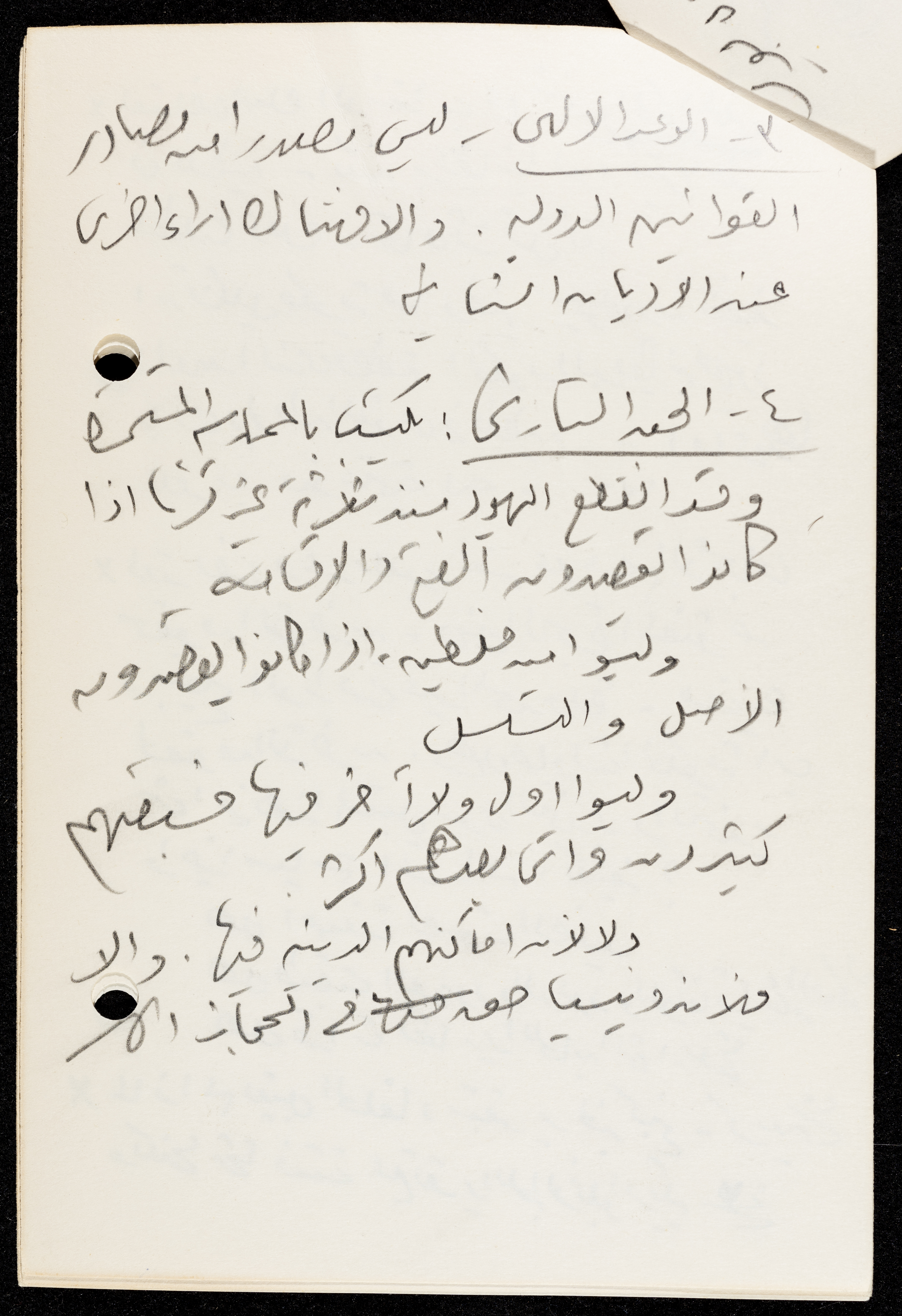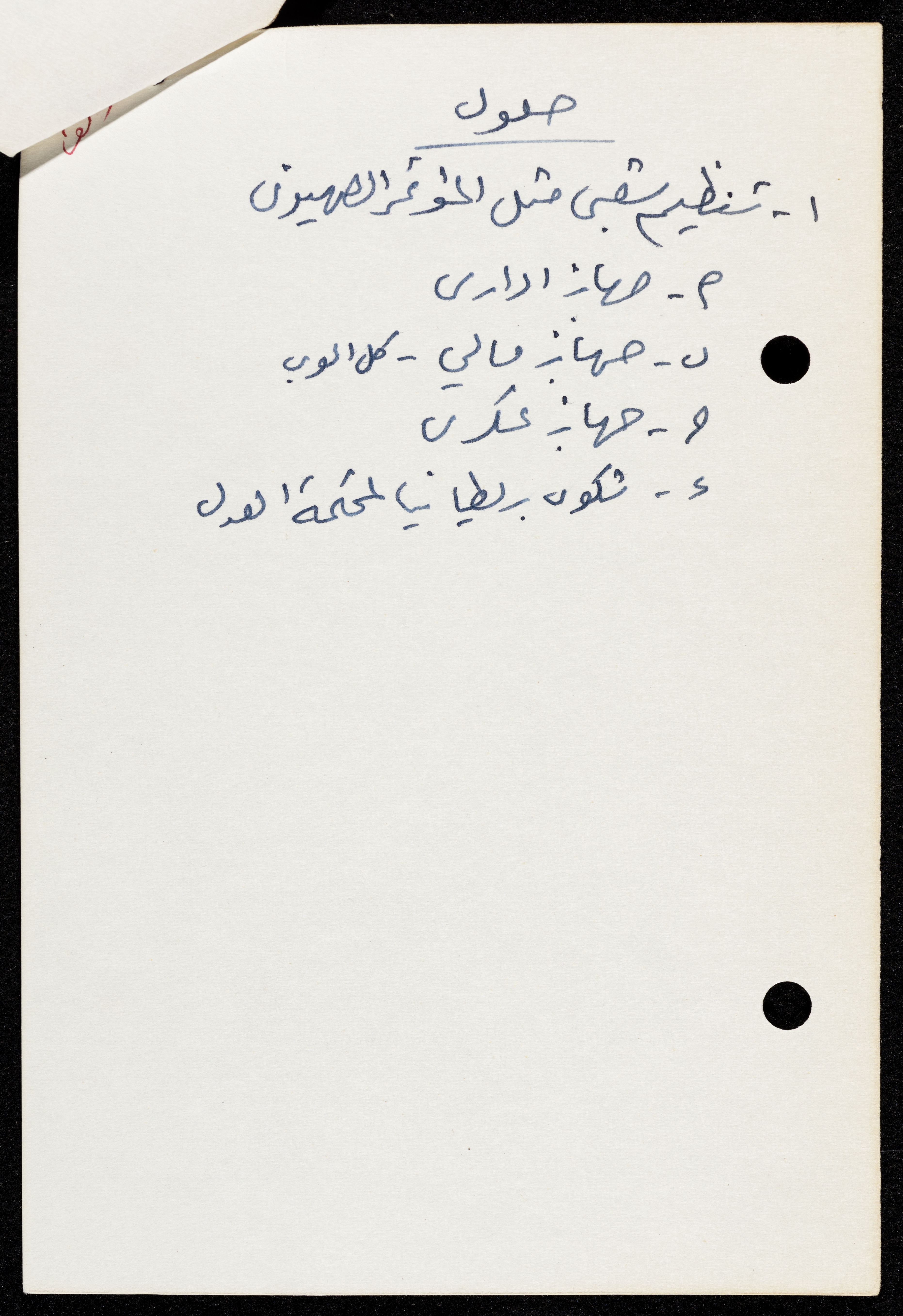 صورة ملونة لورقة بيضاء كتبت بخط اليد باللغة العربية بعنوان التقسيم غير قانوني،وفيها نقاط تتعلق بالانتداب البريطاني.