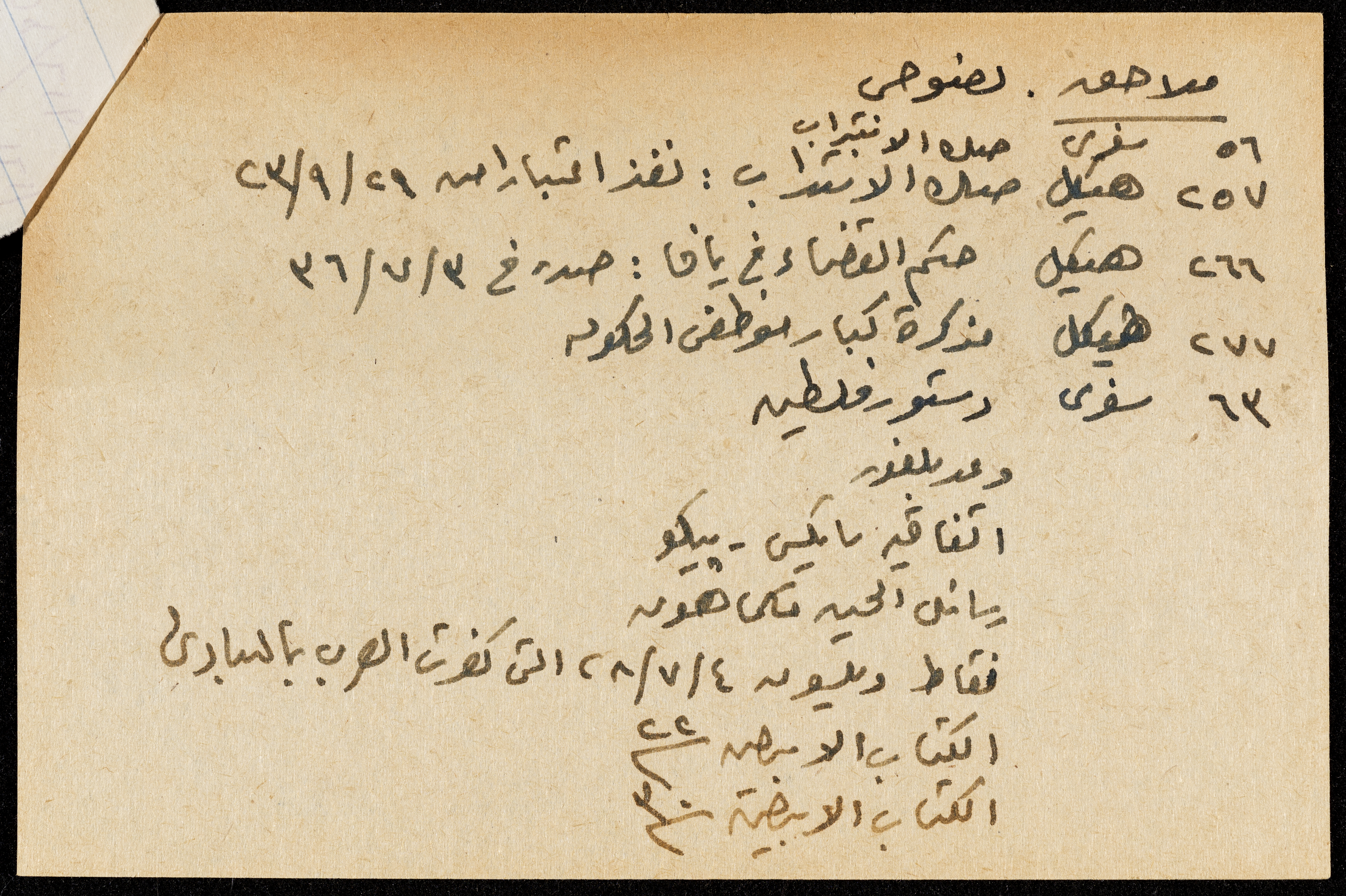 صورة ملونة لقصاصة ورقية كتبت بخط اليد باللغة العربية بعنوان:نصوص وملاحق،وفيها معاهدة سايكس بيكو،،صك الانتداب،وعود انجلترا للحسين.
