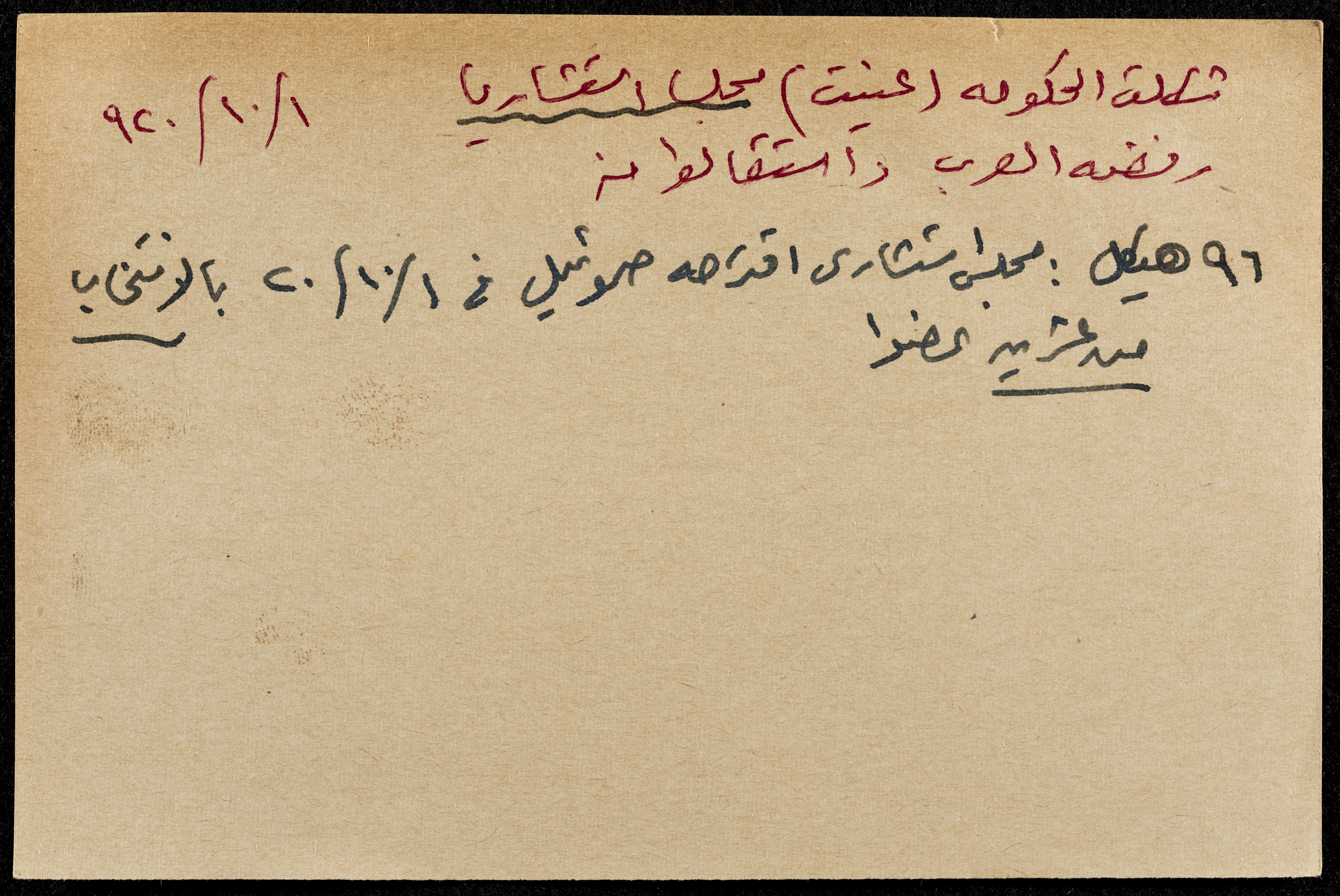 صورة ملونة لقصاصة ورقية كتبت بخط اليد باللغة العربية بعنوان:الحكومة شكلت مجلسا استشاريا،وهو ما اقترحه صموئيل وقوبل بالرفض من قبل العرب واستقالوا منه عام 1920.