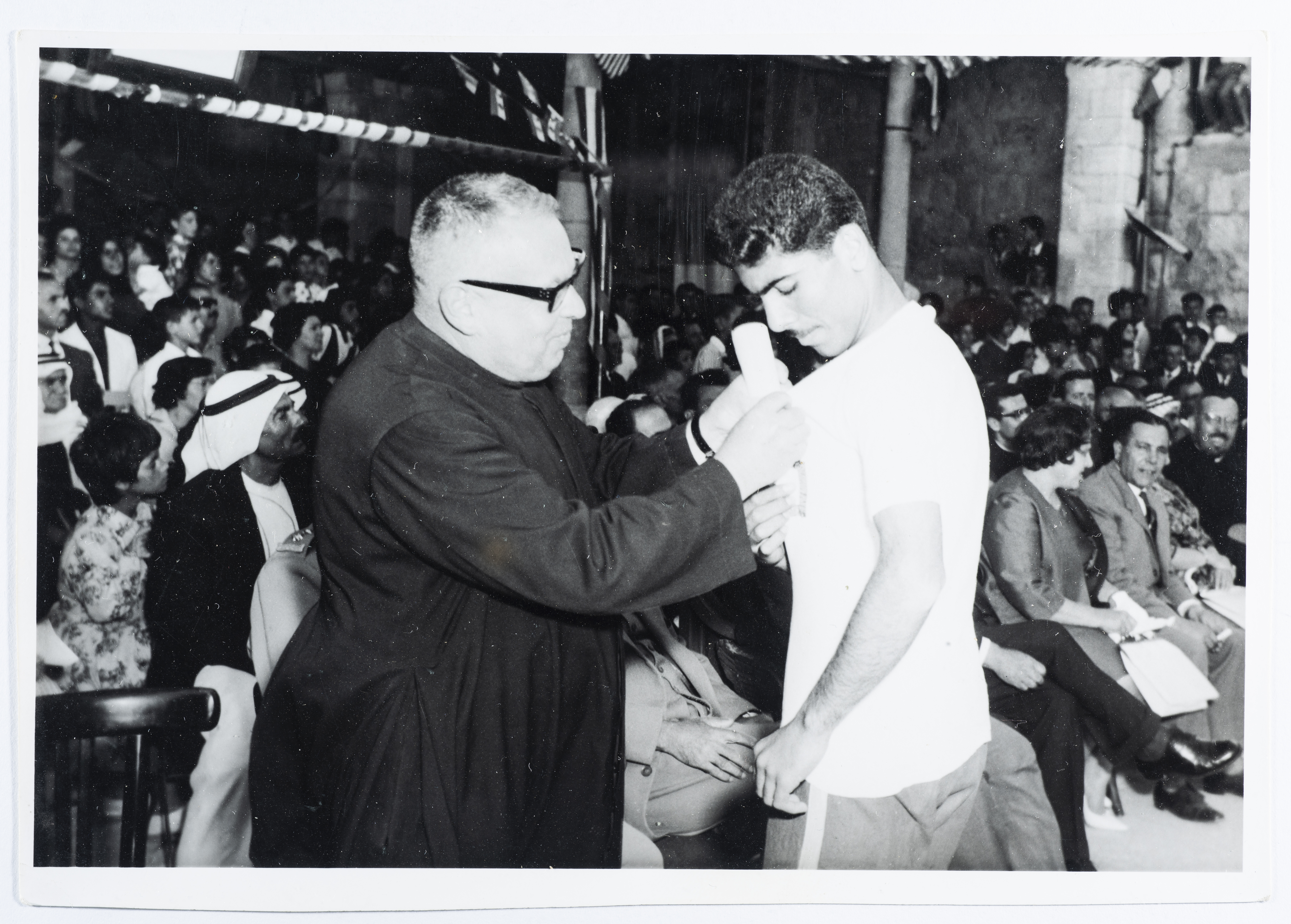 Issued by Saman Sahar Photo Studio, this black-and-white postcard features a shot from a sports event.