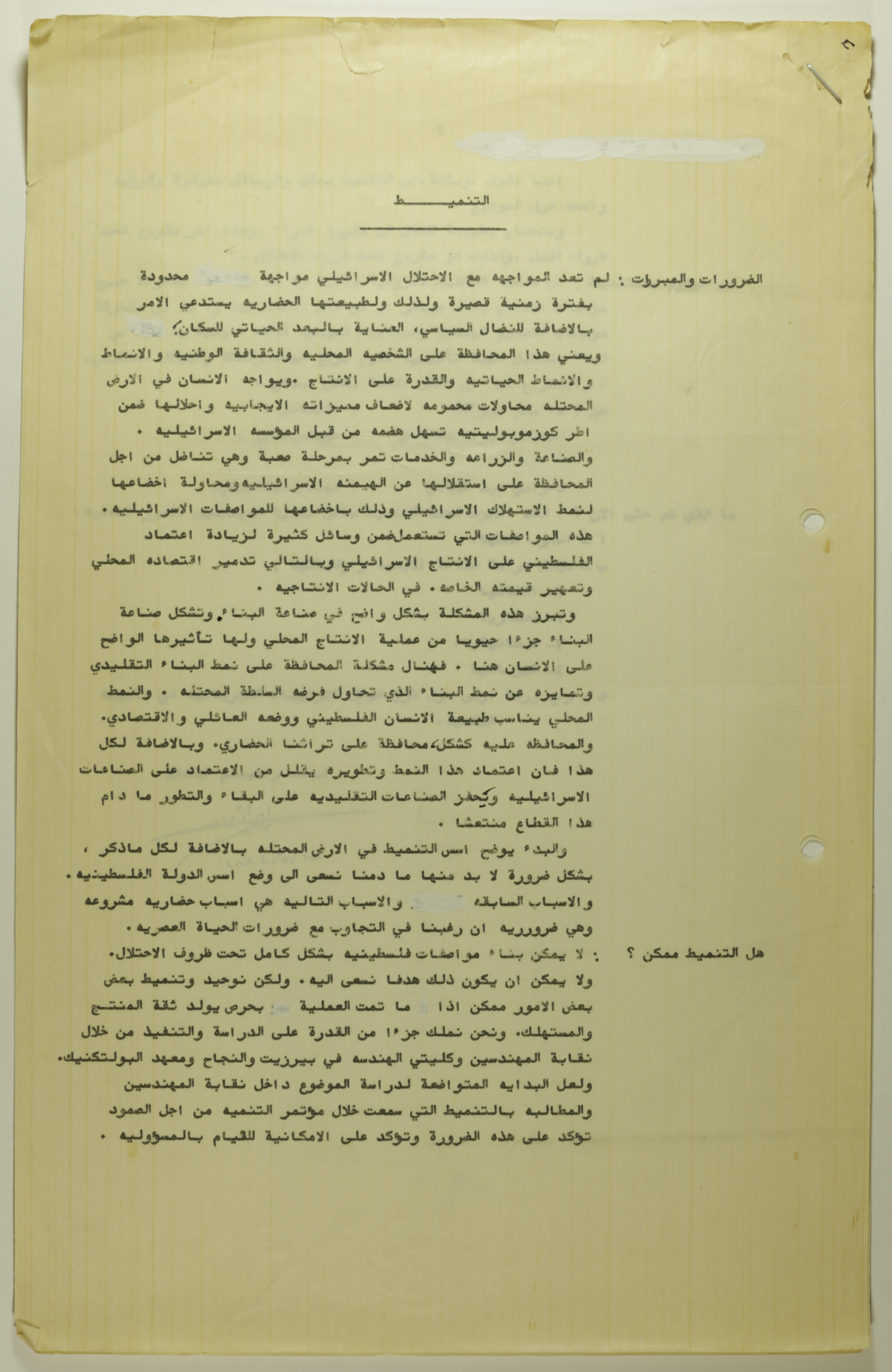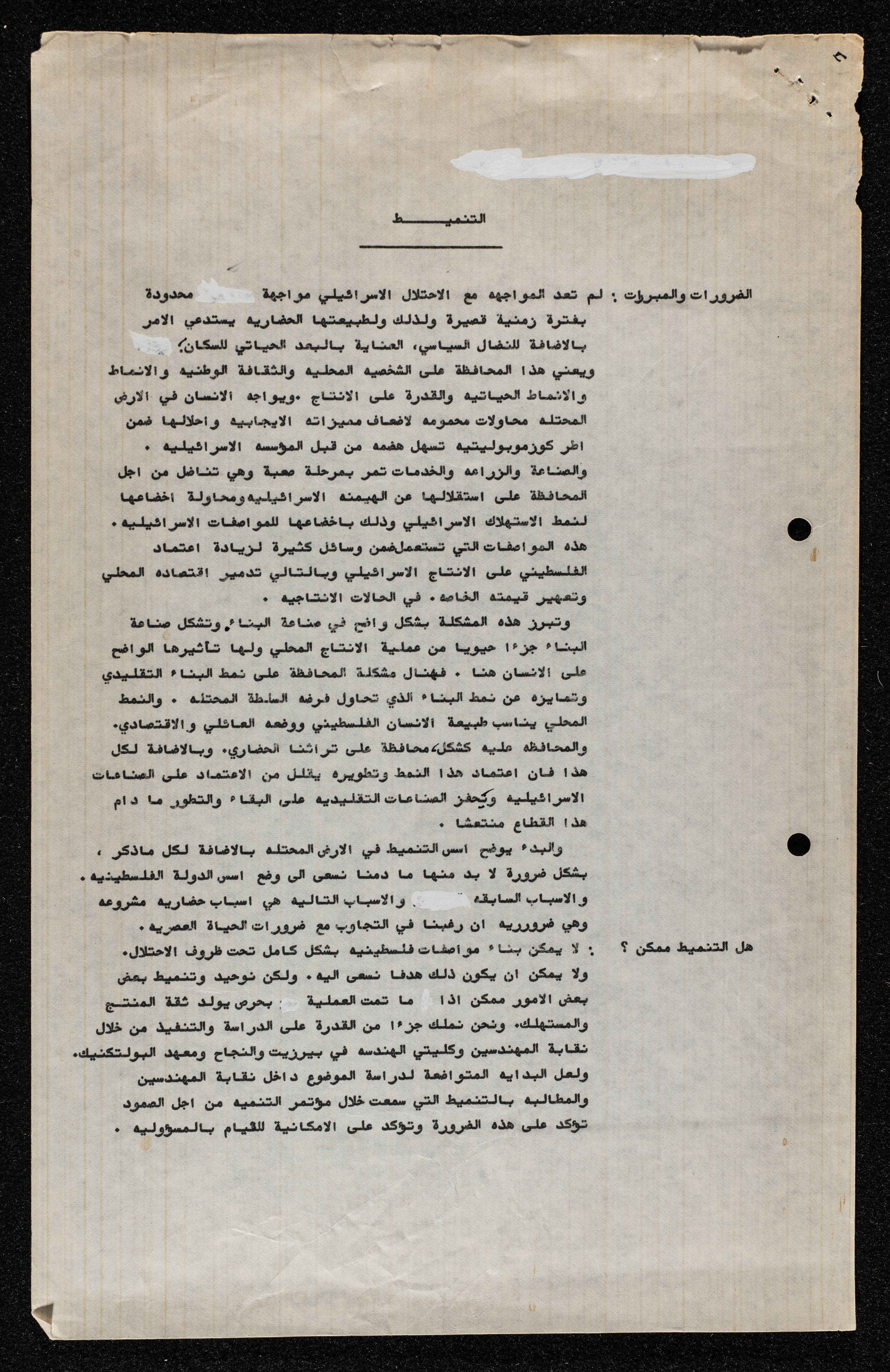 مادة مطبوعة باللغة العربية، وهي مقالة بعنوان " التنميط "، من صفحتين، كتبت في تاريخ 15 شباط 1982.
