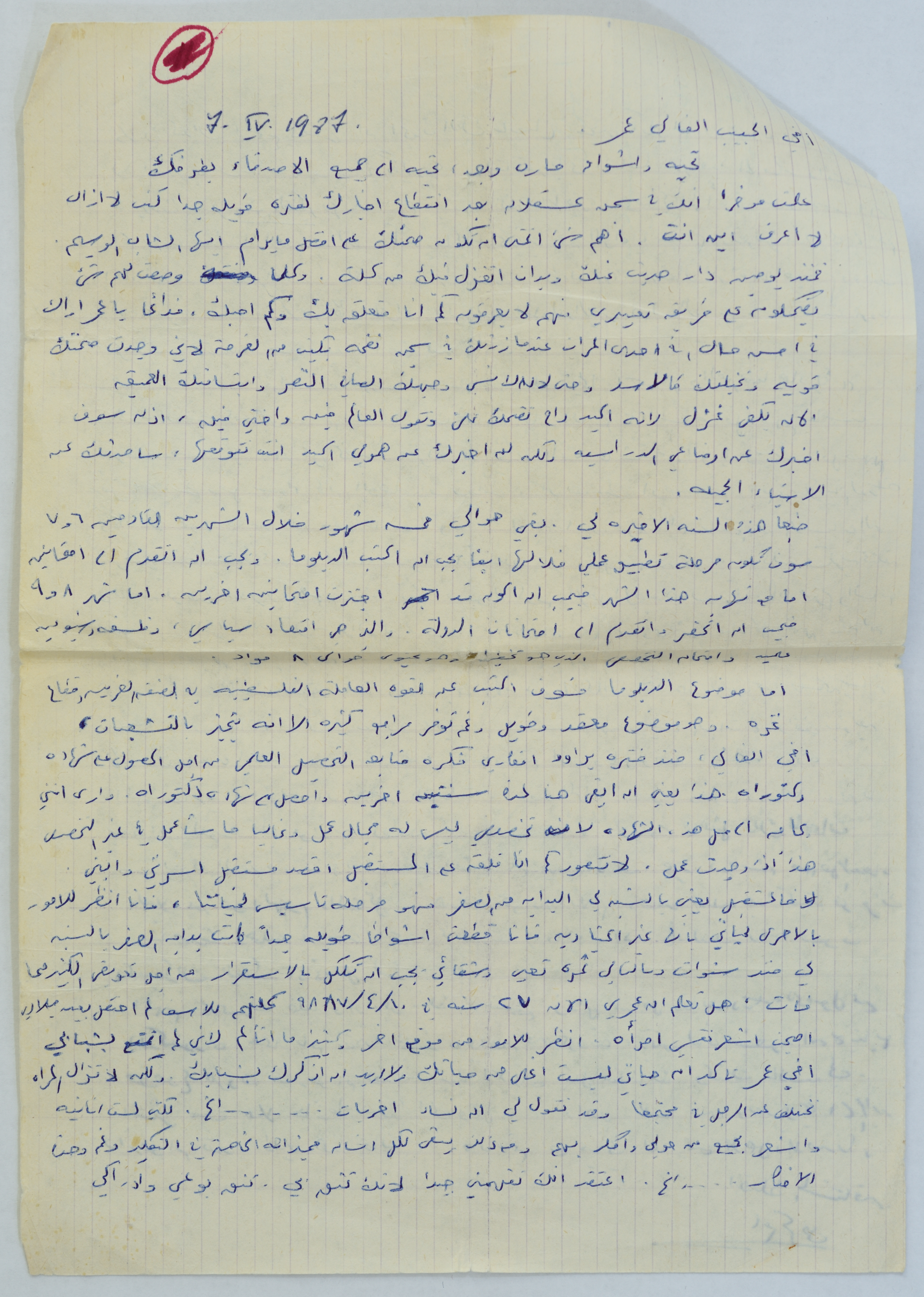 Sent in 1987, this document shows a letter from Amal al-Qasim to her brother Omar al-Qasim in Jerusalem, where she talked about the Palestinian working force.
