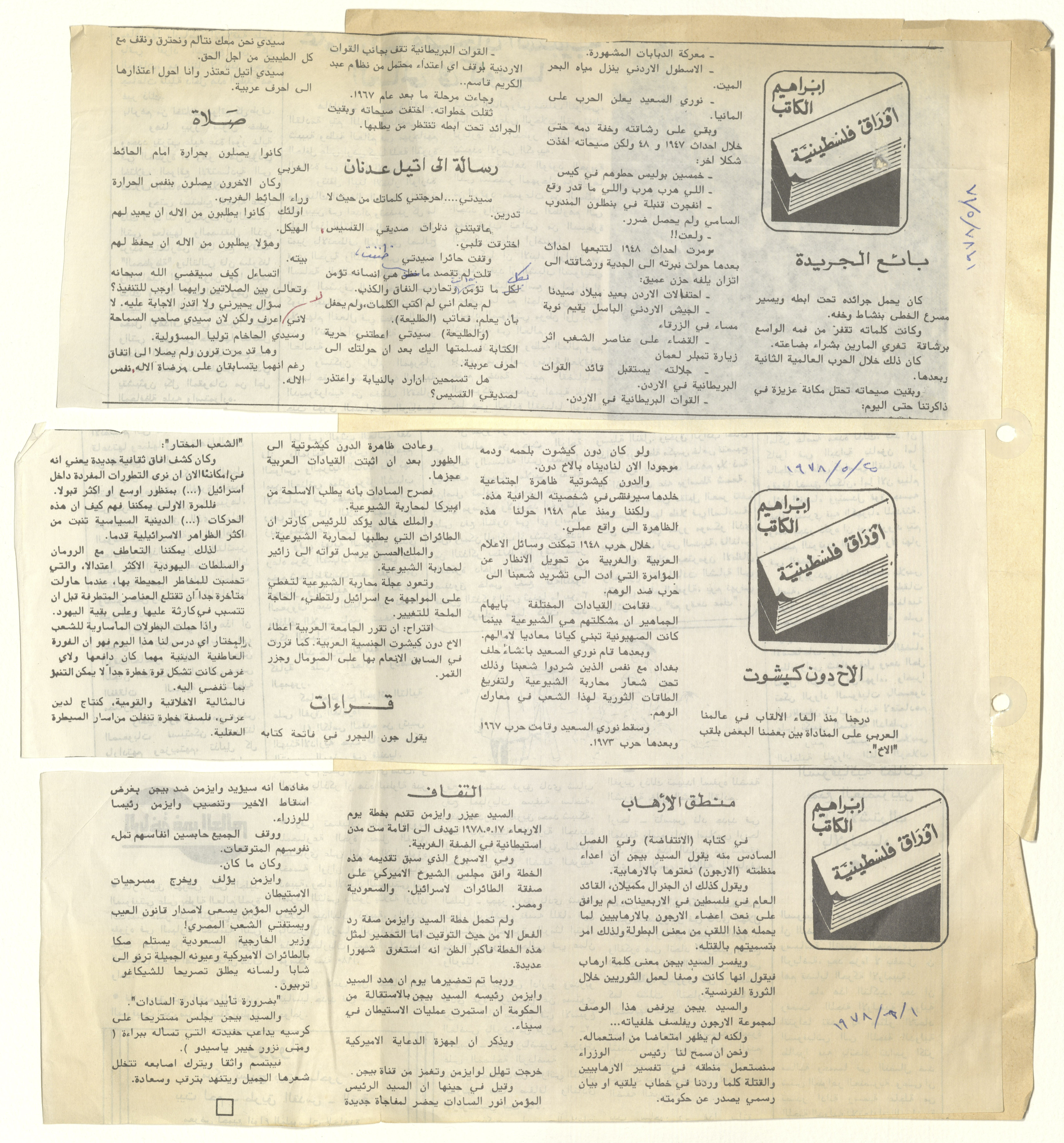 This document contains three newspaper clippings of the writings of Ibrahim ad-Daqqaq under the section Palestinian Papers. The first one was published on May 18, 1978, and it includes the titles "The Newspaper Hawker," "A Letter to Etel ʿadnan," and "A Prayer." The second was published on May 25, 1978, and it includes the titles "Brother Don Quixote" and "Readings." The third was published on June 1, 1978, and it includes the titles "The Logic of Terrorism" and "A Twist."