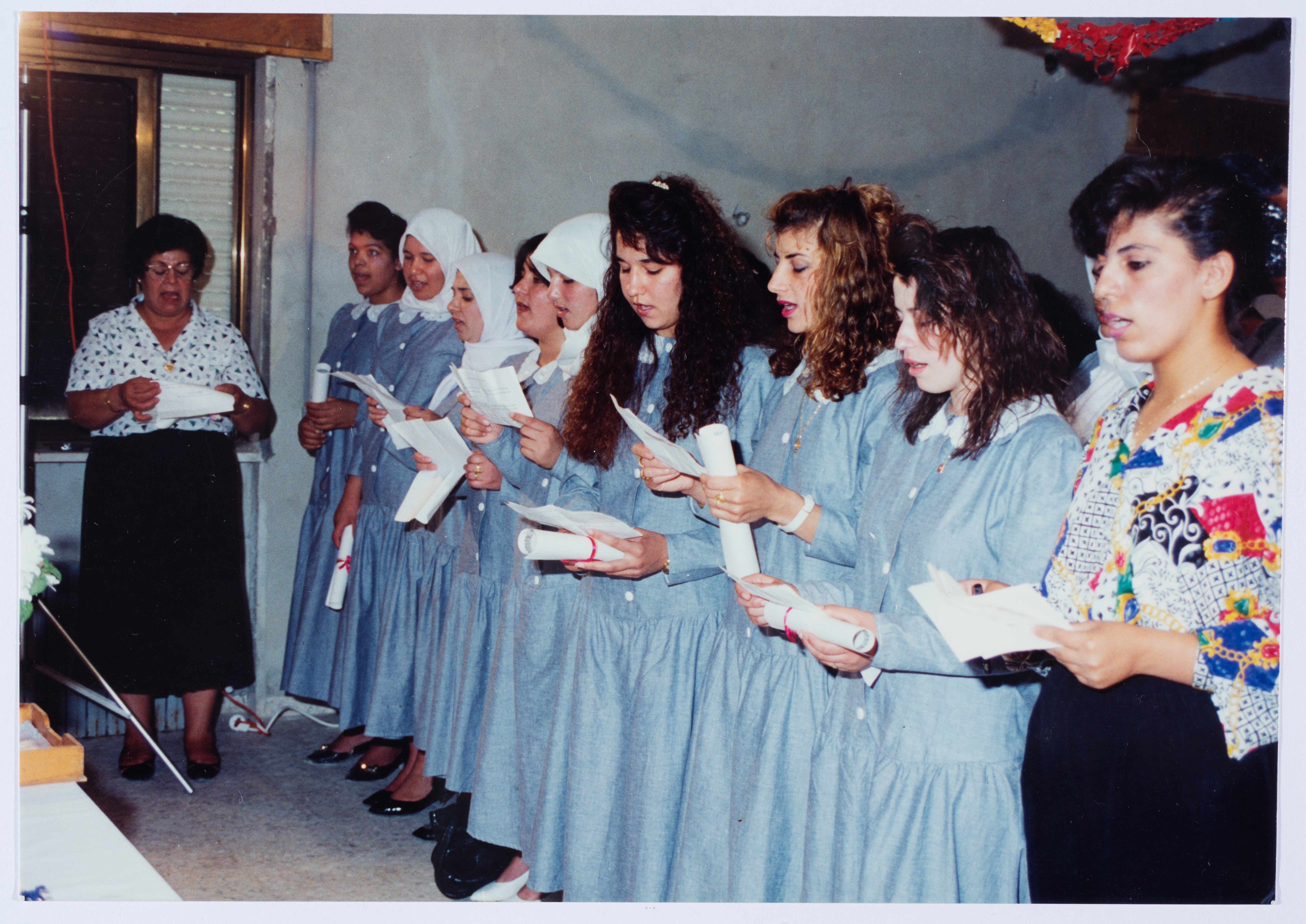 صورة ملونة، من تسليم شهادات التخرج للطالبات في دورة الخياطين في جمعية مخيم قلنديا النسائية التعاونية.