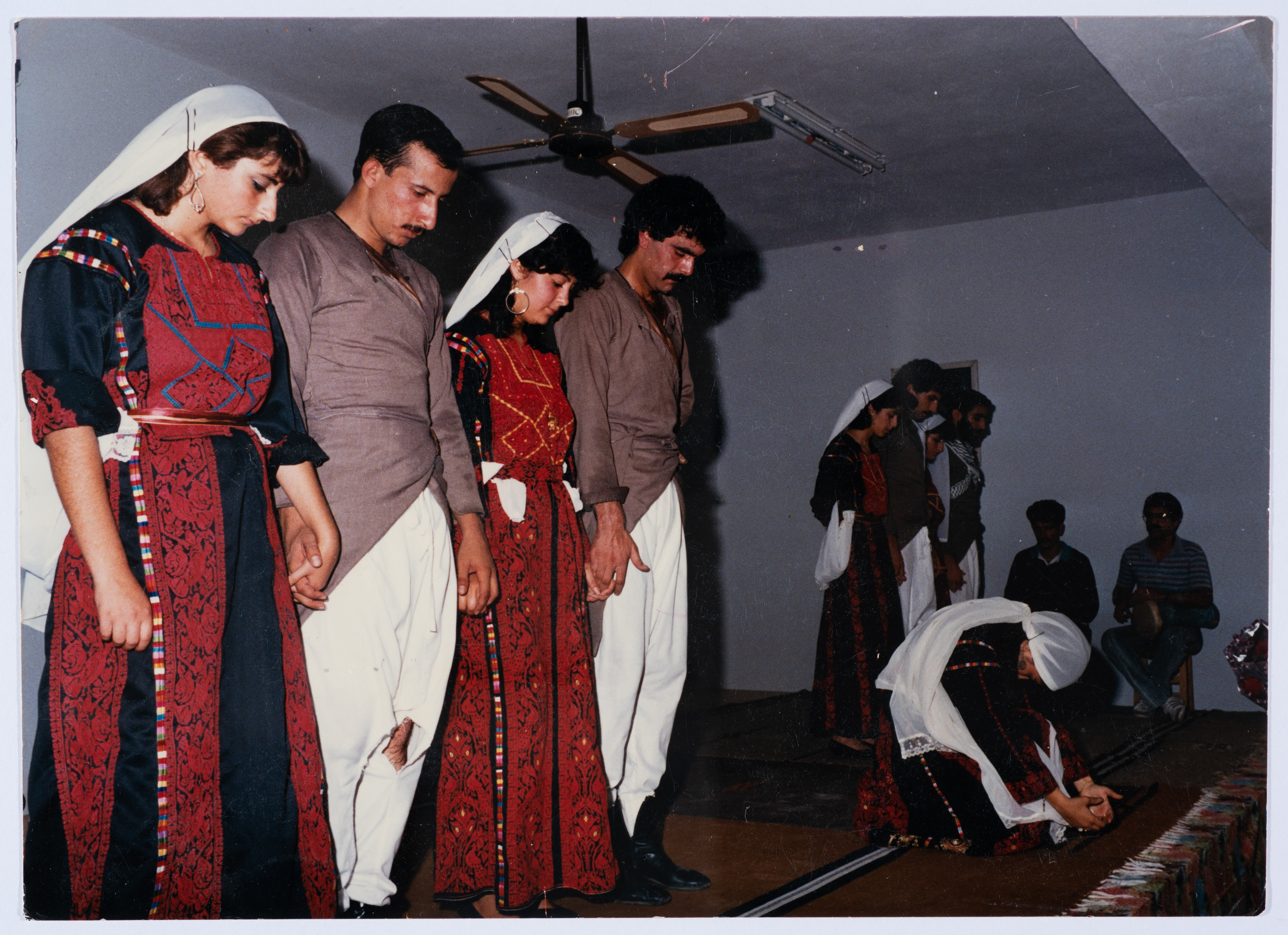 صورة ملونة، من مشاركة فرقة الشهيد شرف الطيبي من جامعة بيرزيت باحتفال أُقيم في جمعية مخيم قلنديا النسائية التعاونية، بمناسبة تخرج فوج من طالبات الجمعية.