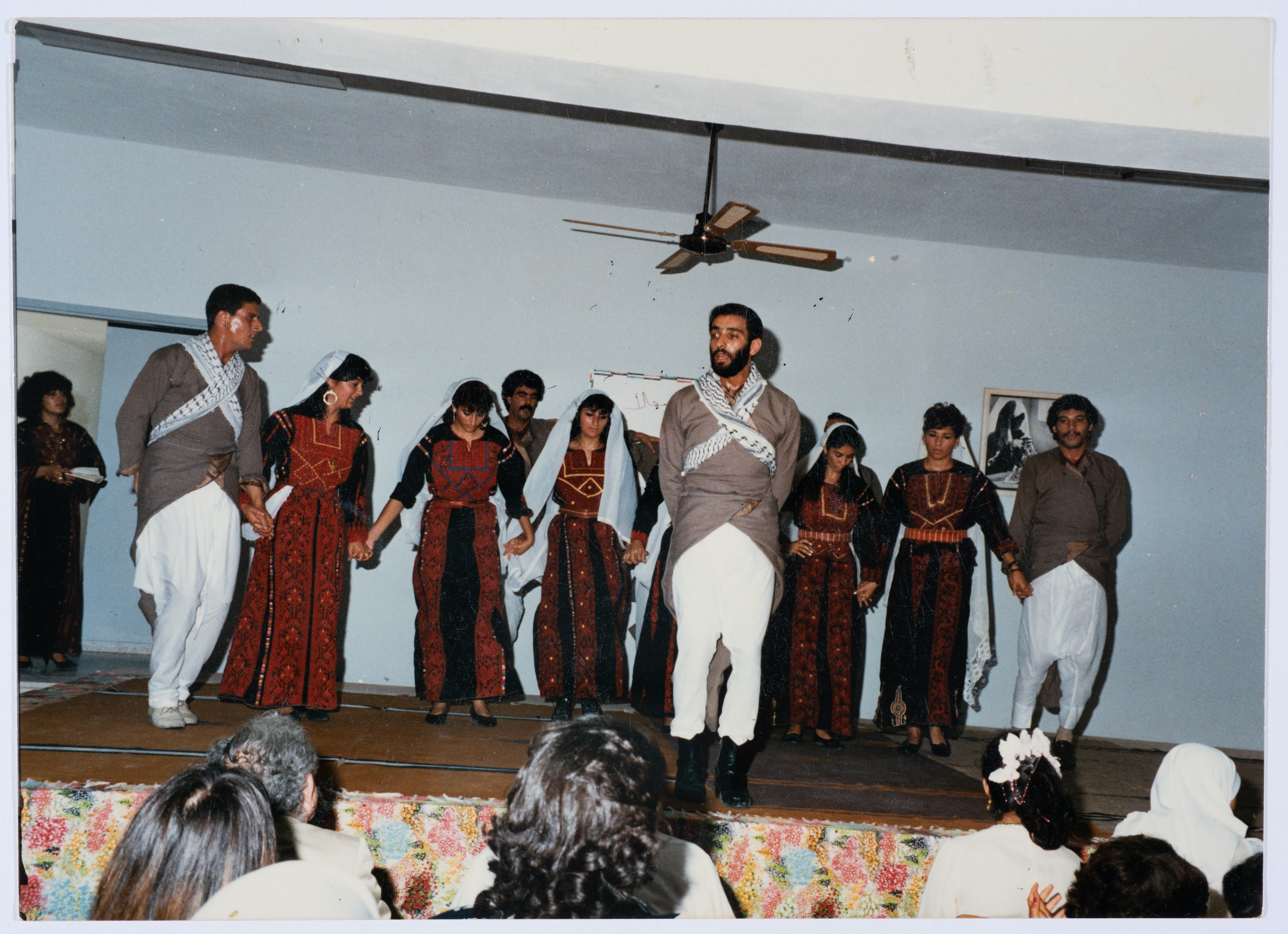 صورة ملونة، من مشاركة فرقة الشهيد شرف الطيبي من جامعة بيرزيت باحتفال أُقيم في جمعية مخيم قلنديا النسائية التعاونية، بمناسبة تخرج فوج من طالبات الجمعية.
