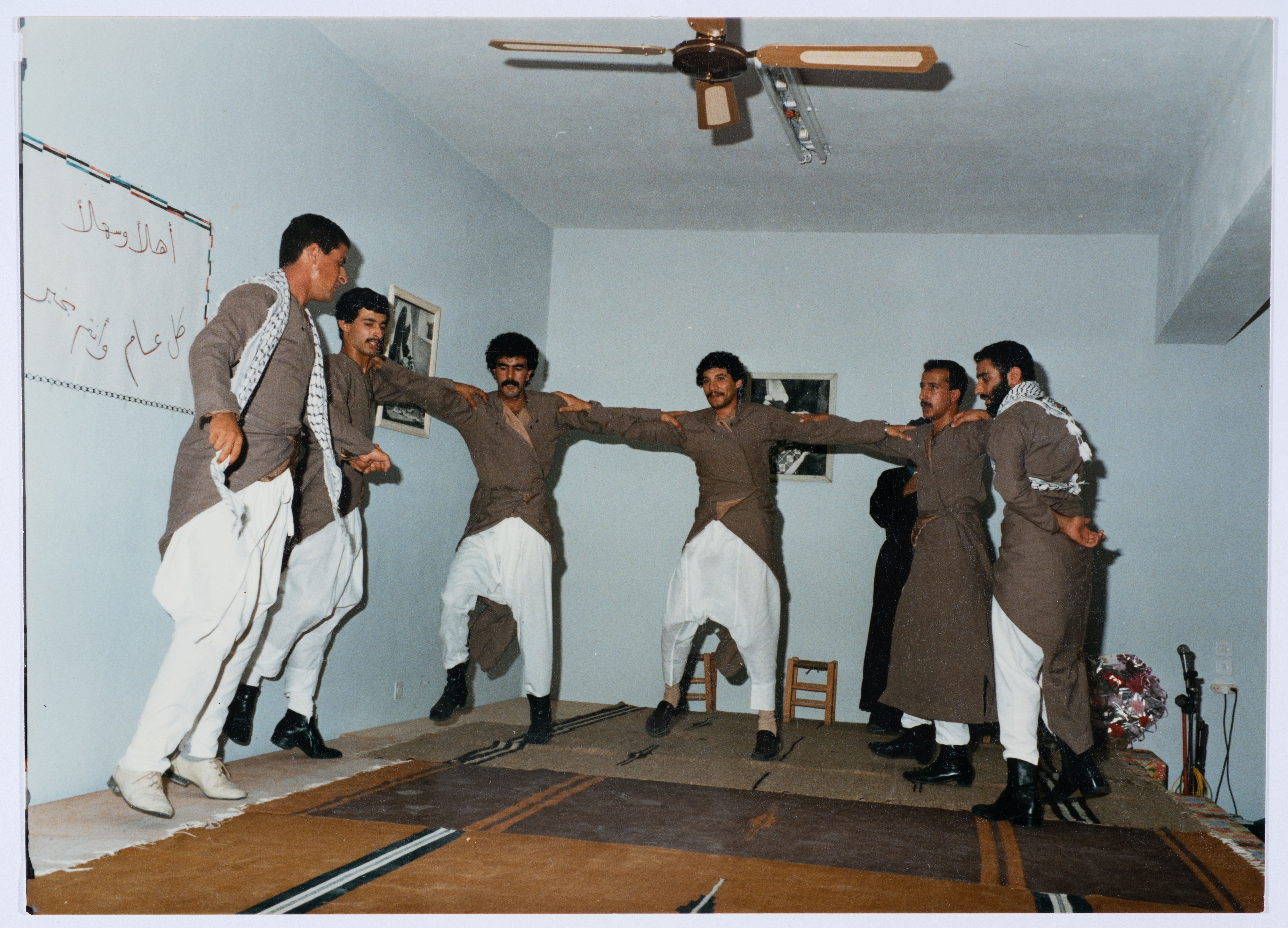صورة ملونة، من مشاركة فرقة الشهيد شرف الطيبي من جامعة بيرزيت باحتفال أُقيم في جمعية مخيم قلنديا النسائية التعاونية، بمناسبة تخرج فوج من طالبات الجمعية.
