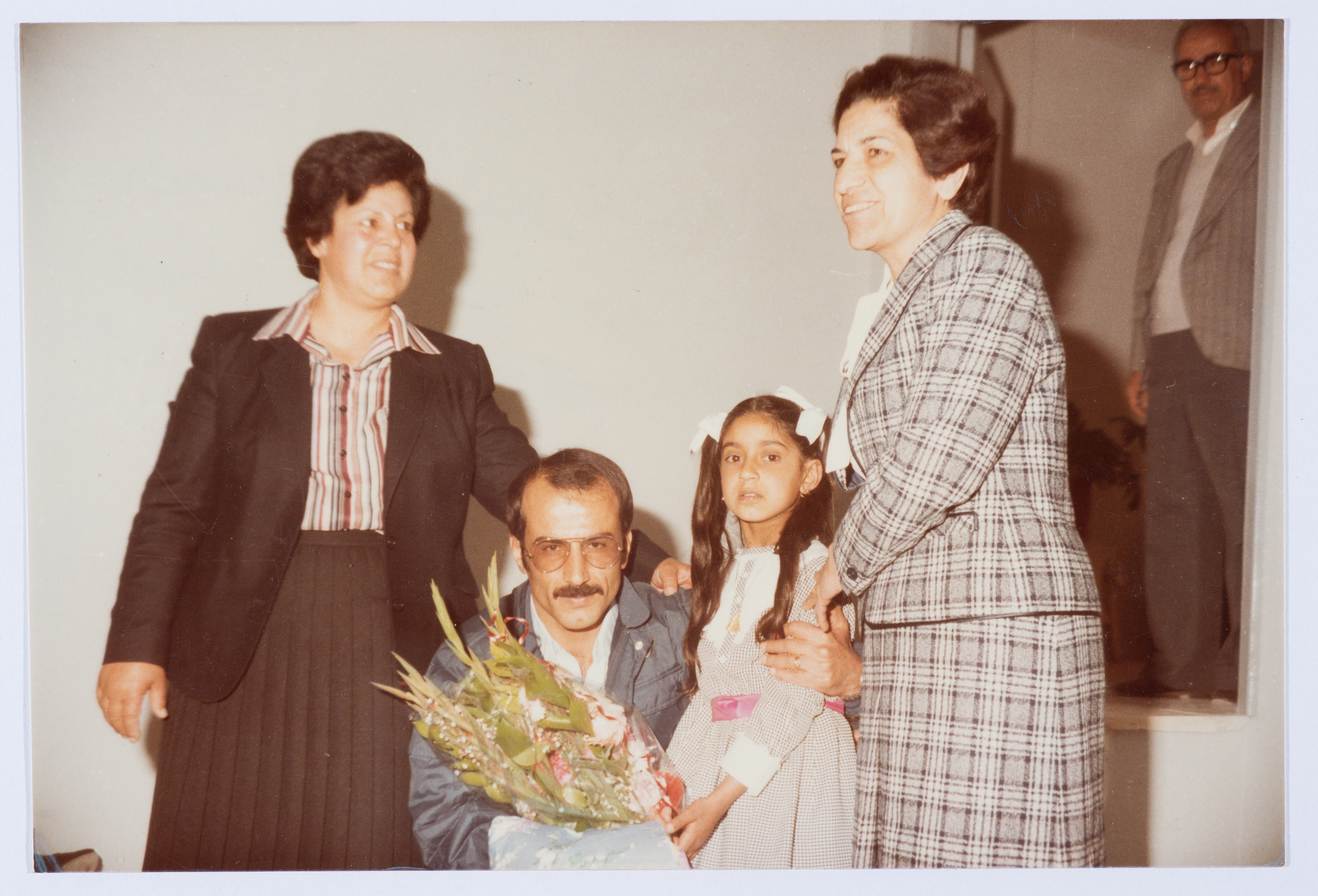 A colour photograph of the members of the Board of Directors of Qalandiya Camp Women Handicraft Cooperative Society participating in a celebration on the release of prisoner Ibrahim Sajdeya; having spent 12 years in Israeli prisons. Laila Terzi and Khadija Farhan are seen in the photo