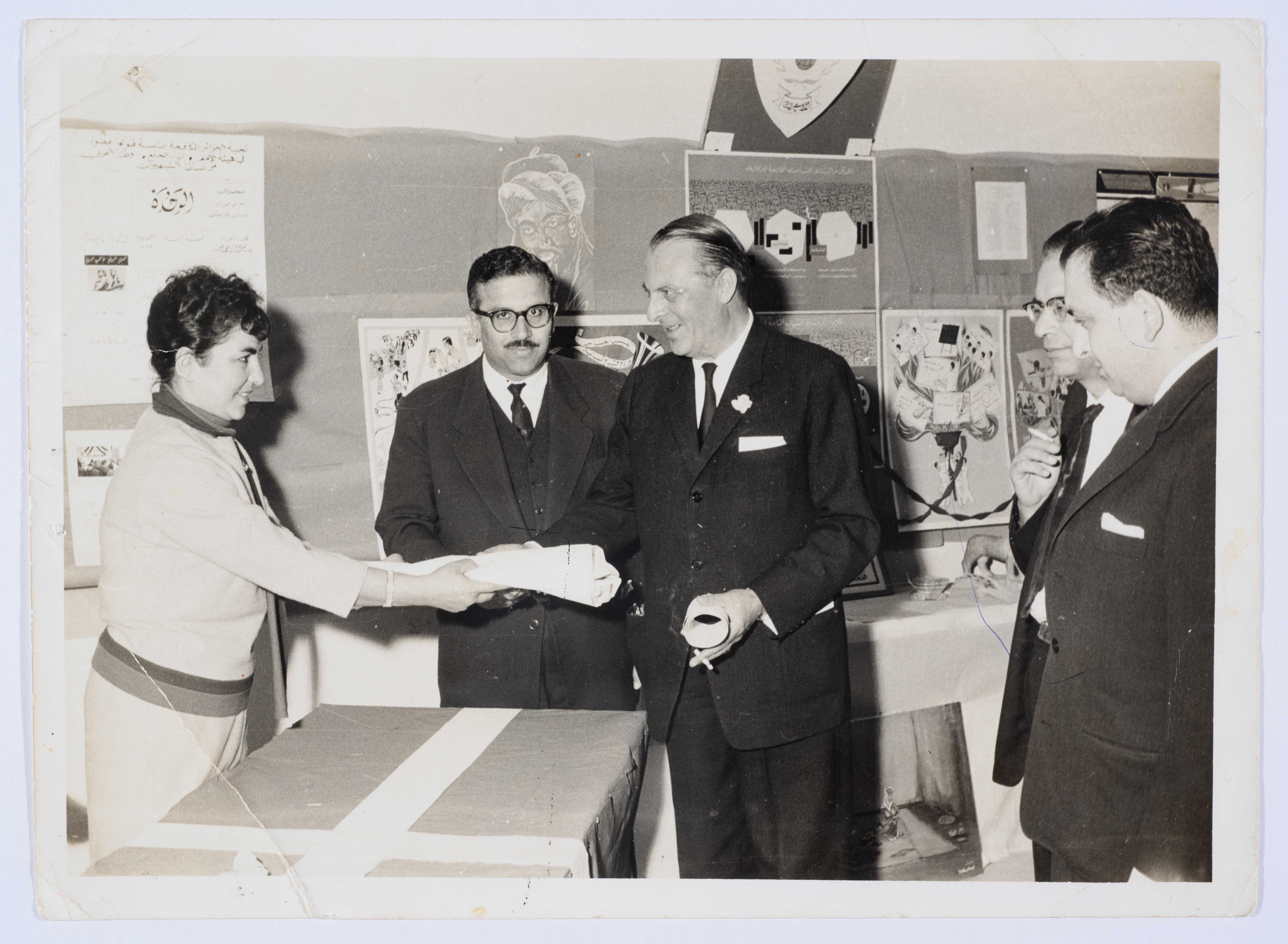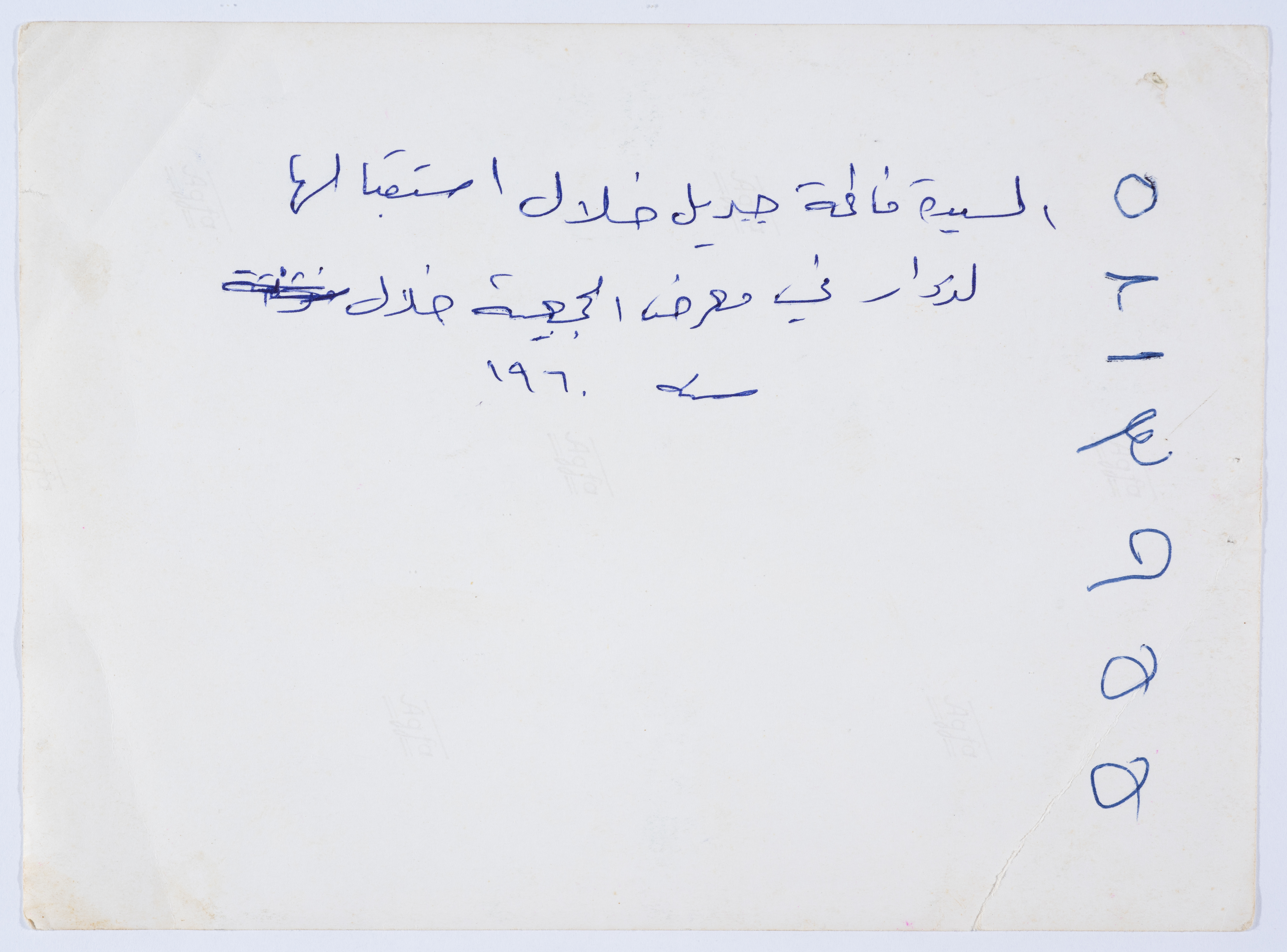 صورة أسود وأبيض، خلال استقبال السيدة فاطمة جبريل عضو الهيئة الادارية في جمعية مخيم قلنديا النسائية التعاونية لضيوف في معرض للمطرزات الفلسطينية في مقر الجمعية.