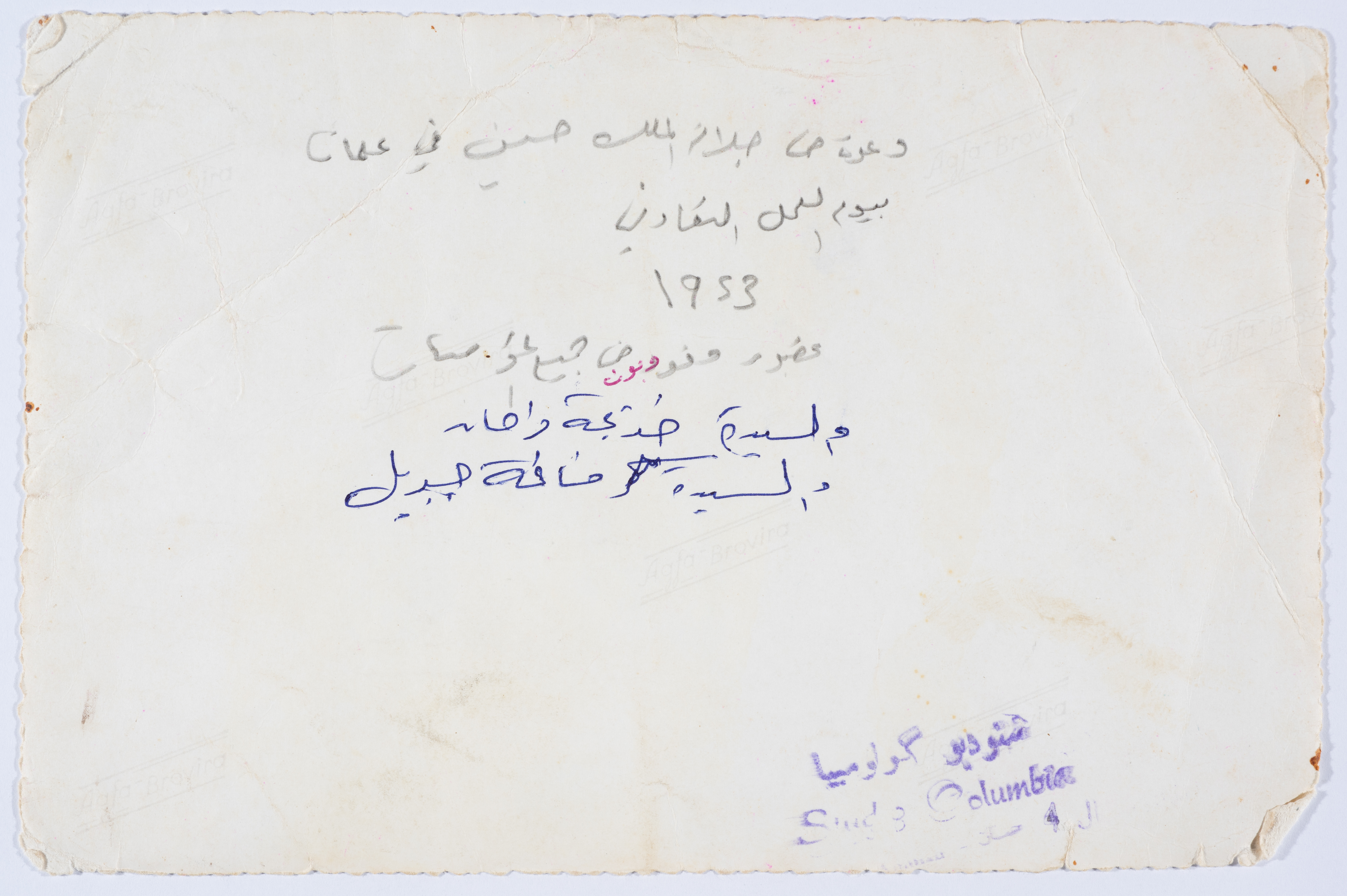 صورة أسود وأبيض، خلال مشاركة عضوات الهيئة الادارية في جمعية مخيم قلنديا النسائية التعاونية كل من السيدة خديجة فرحان والسيدة فاطمة جبريل، في مؤتمر يوم العمل التعاوني بعمان بدعوة من جلالة الملك حسين.