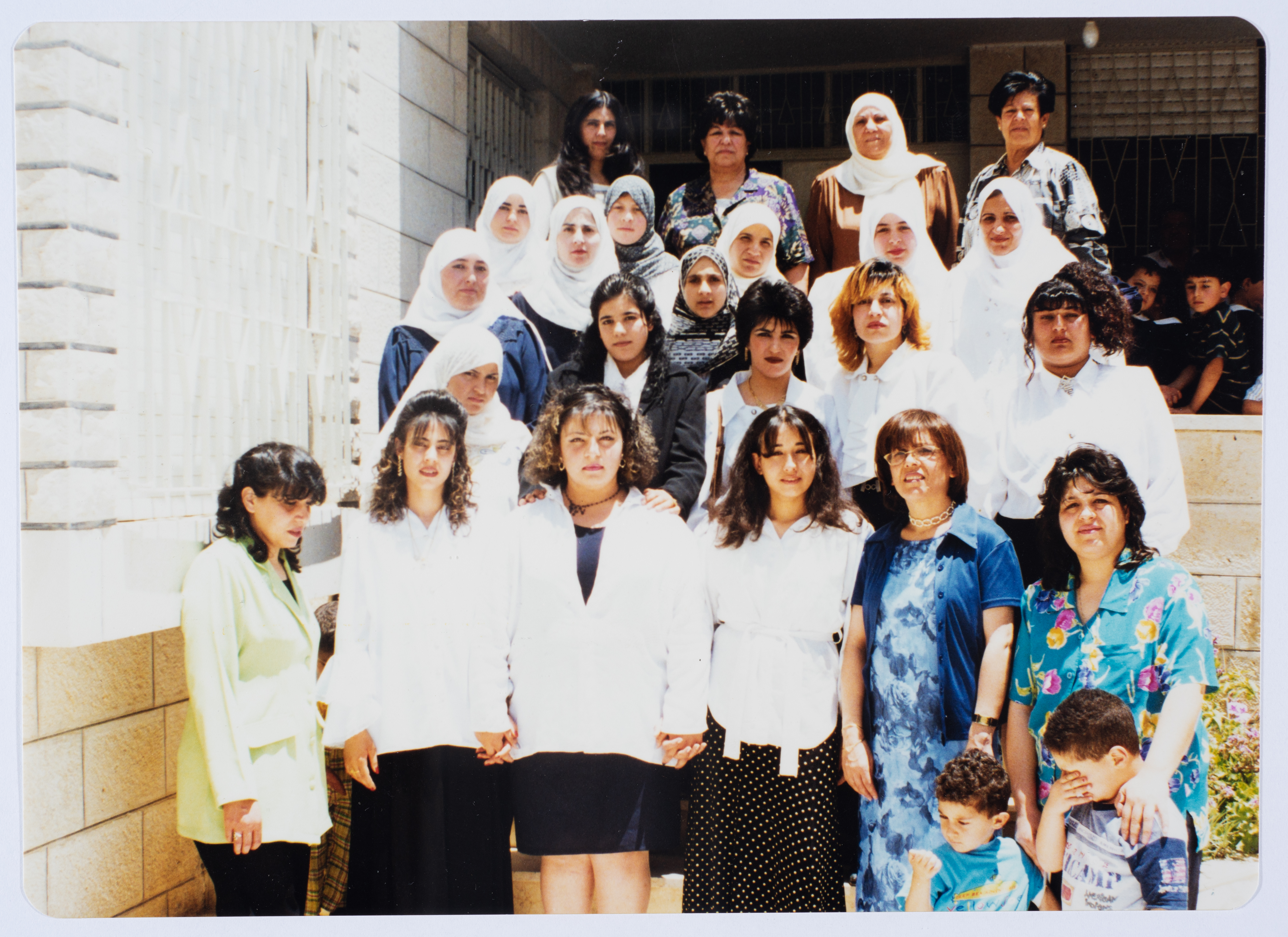 صورة ملونة، من تخريج متدربات في جمعية مخيم قلنديا النسائية التعاونية من دورة فن قص الشعر والتجميل.