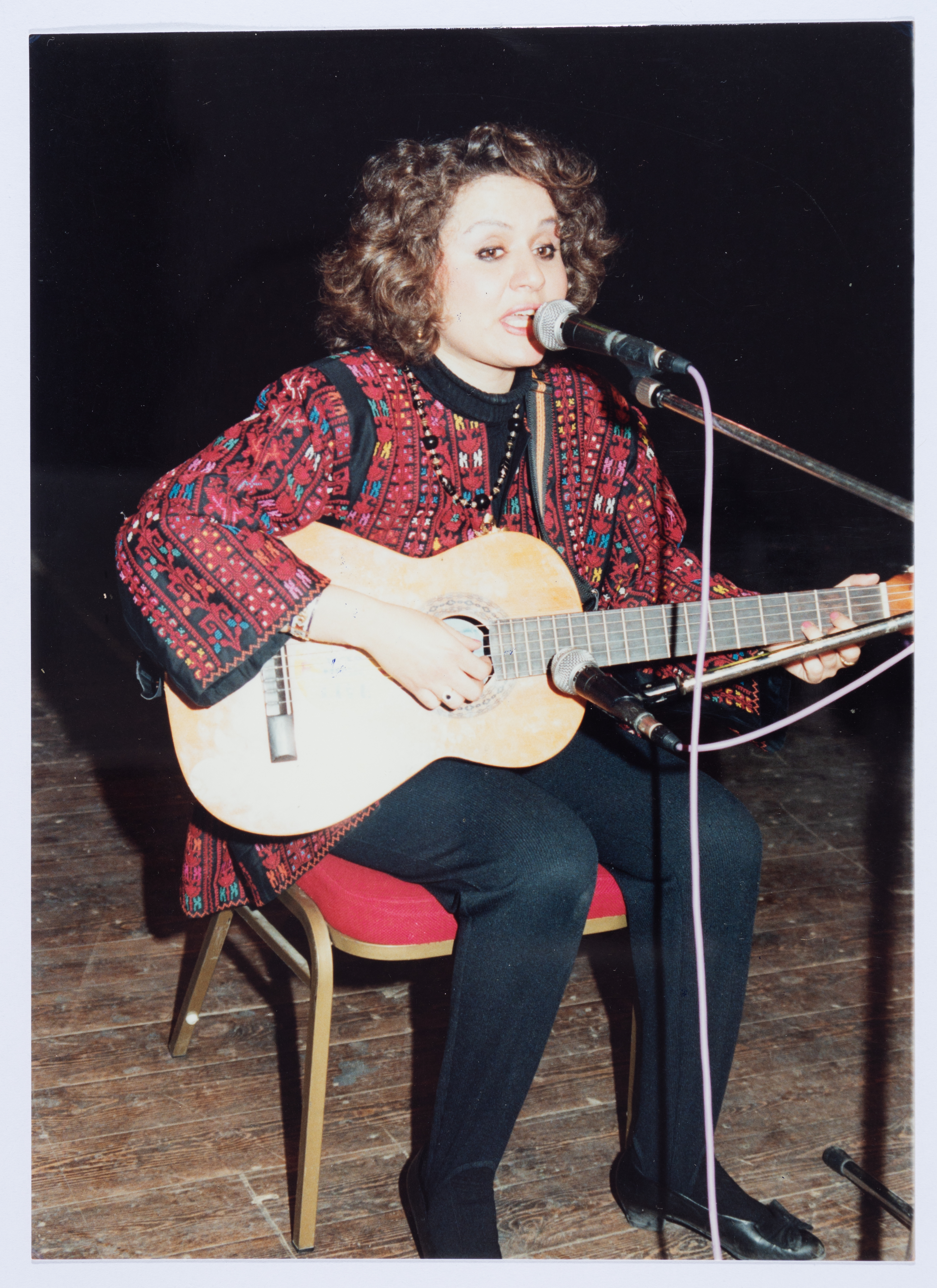 صورة ملونة، من المهرجان الذي اقامته جمعية مخيم قلنديا النسائية التعاونية للفنانة الفلسطينية ريم الكيلاني في الفترة ما بين 2 نيسان إلى 11 نيسان 1993.