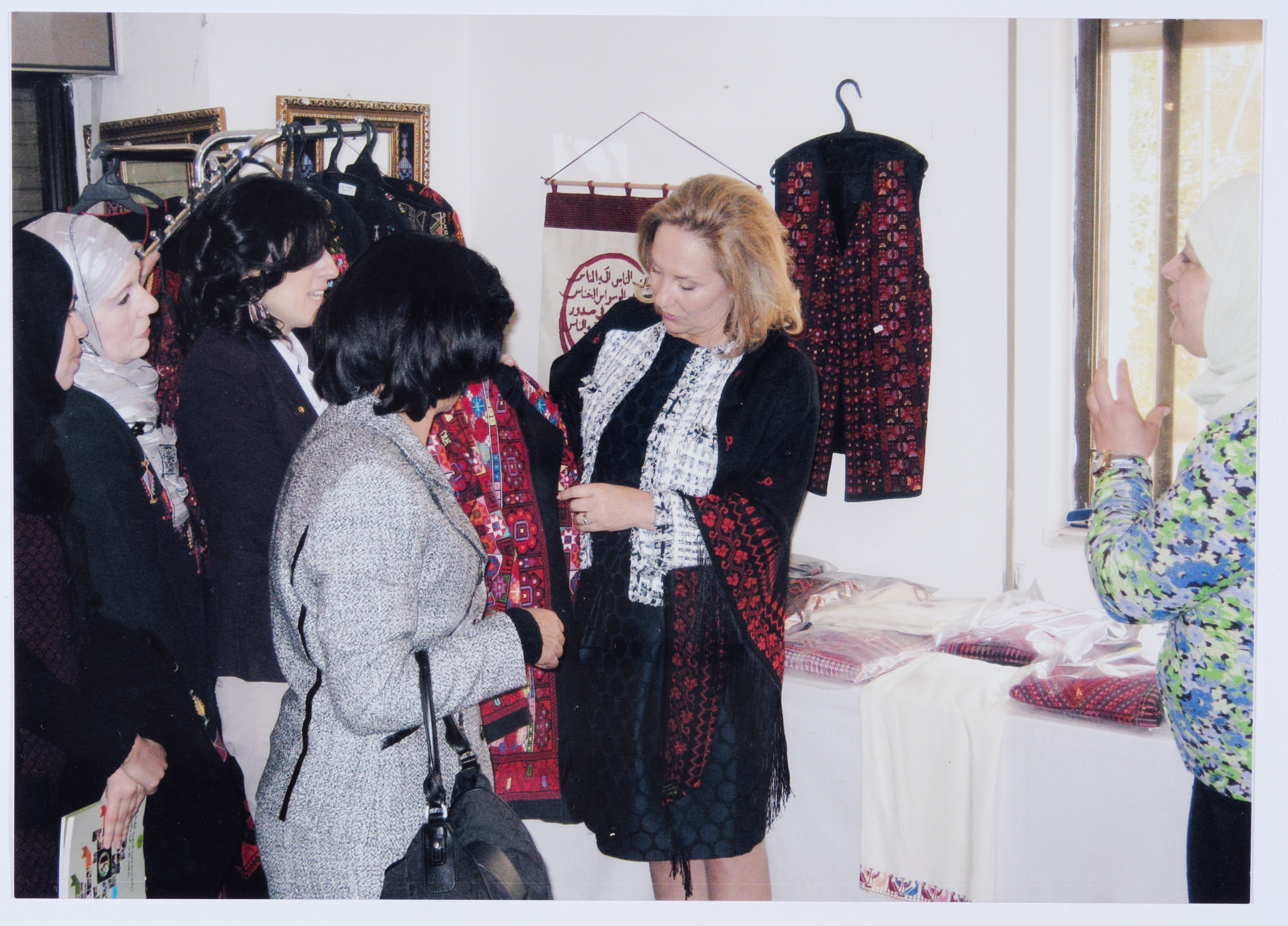 صورة ملونة، من زيارة زوجة الرئيس التشيلي سيسيليا زيفنيارا، لجمعية مخيم قلنديا النسائية التعاونية، بمرافقة السيدة ربيحة ذياب وزيرة شؤون المرأة