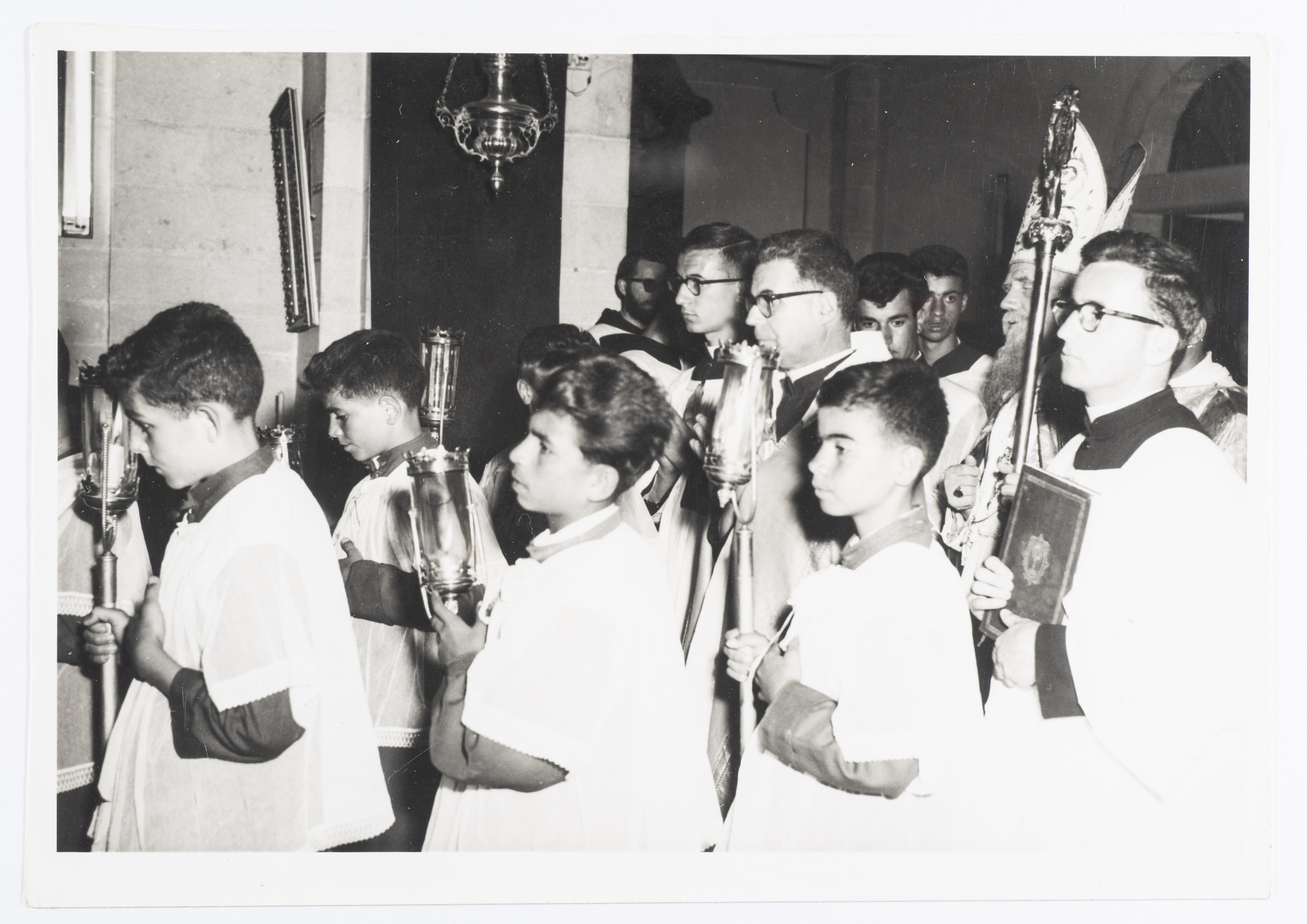 بطاقة بريدية يظهر فيها مسير بمناسبة دينية مسيحية، صدرت عن ستوديو سمعان السحار