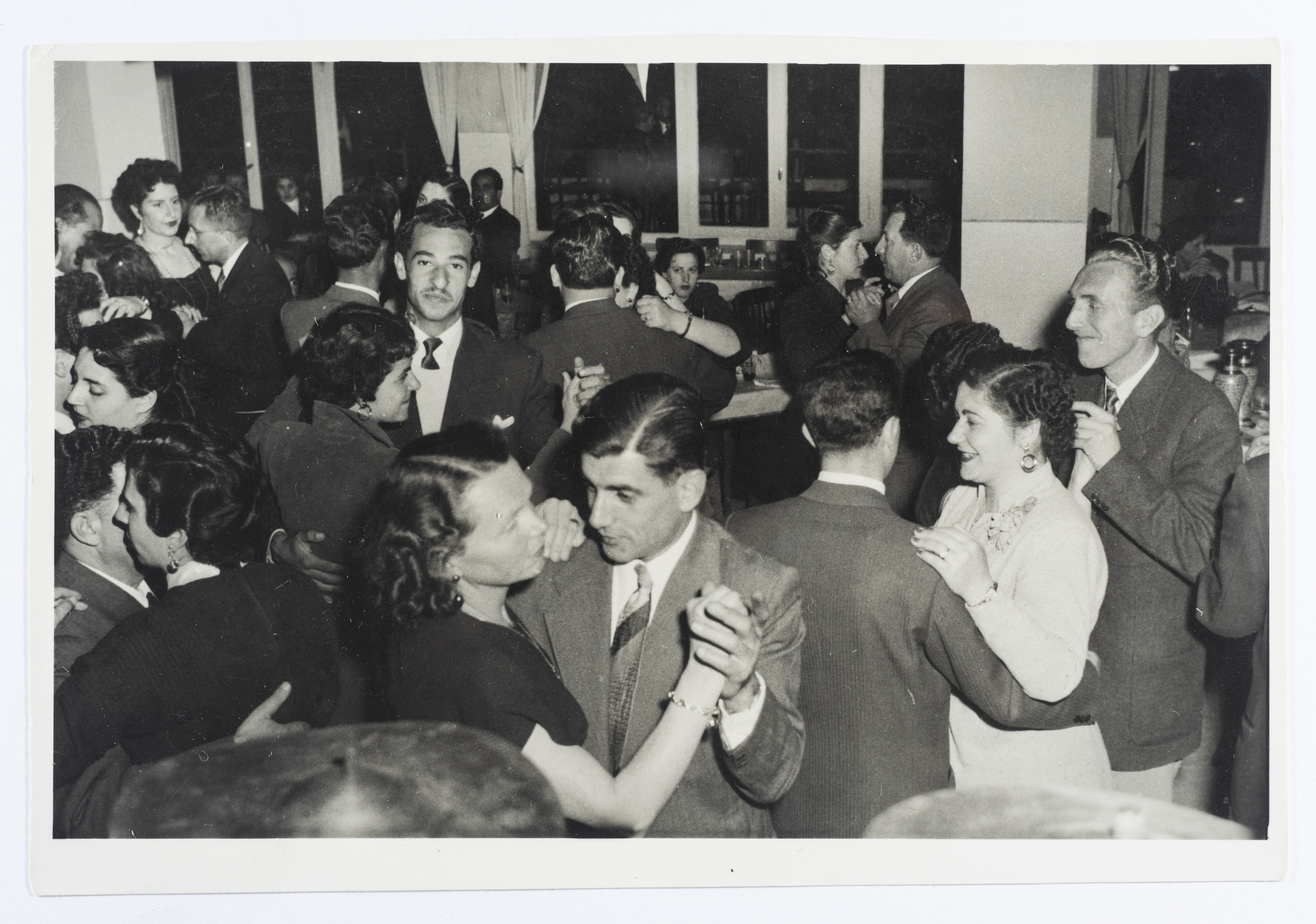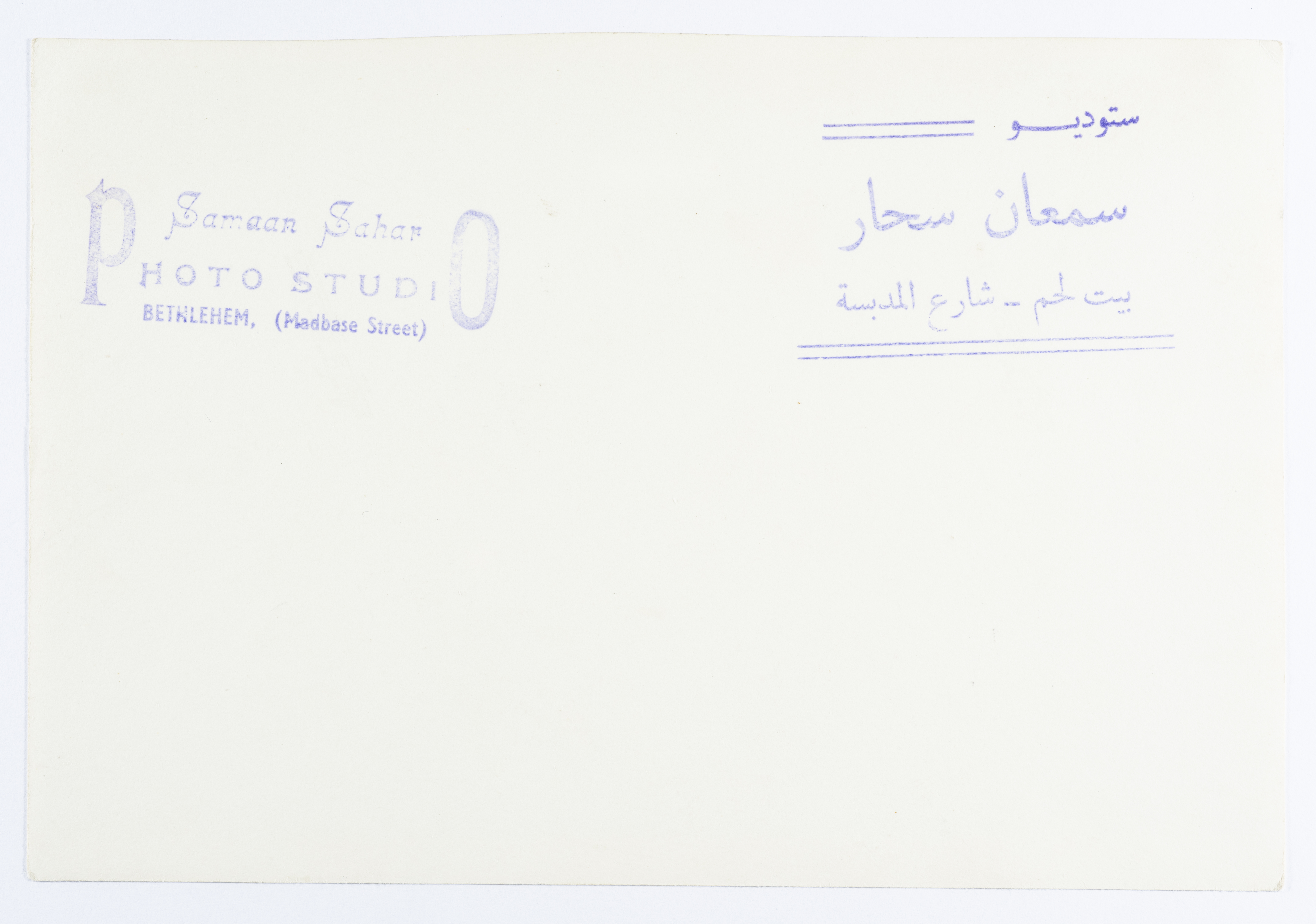 بطاقة بريدية يظهر فيها صورة جماعية لمجموعة من الأشخاص، صدرت عن ستوديو سمعان السحار ولم يتوفر معلومات حول الأشخاص أو المناسبة