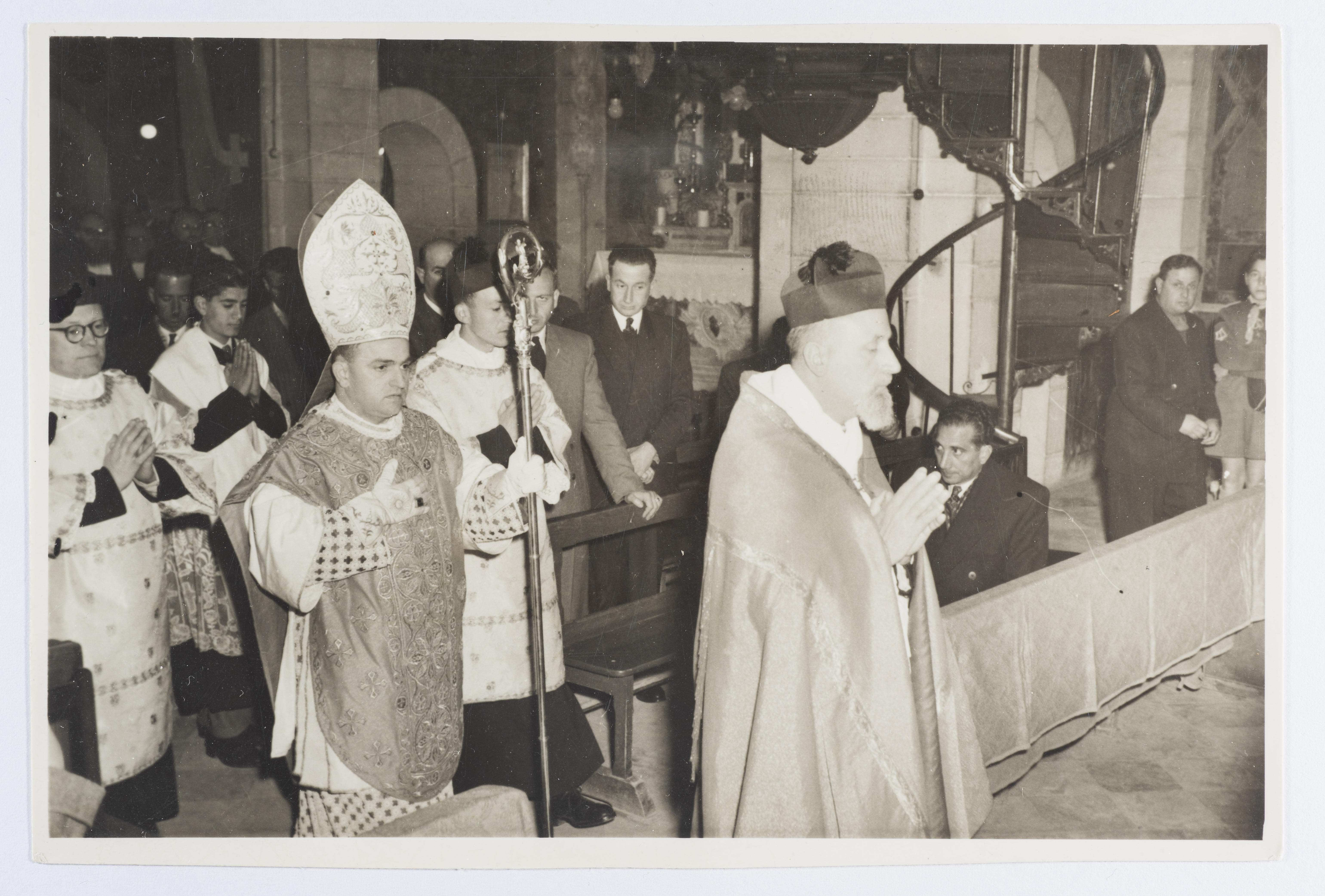 بطاقة بريدية يظهر فيها طقس ديني مسيحي في إحدى الكنائس في فلسطين، صدرت عن ستوديو سمعان السحار