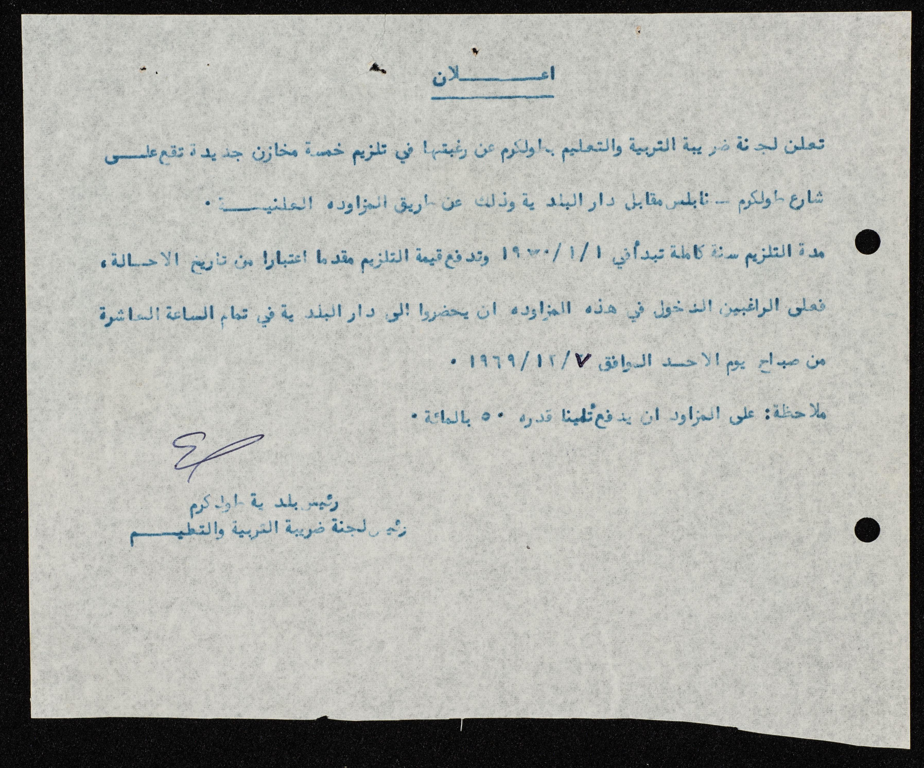 وثيقة مكونة من صفحة واحدة تتضمن إعلان صادر عن لجنة ضريبة التربية والتعليم من أجل تلزيم خمسة مخازن من أملاكها بالمزاد العلني.