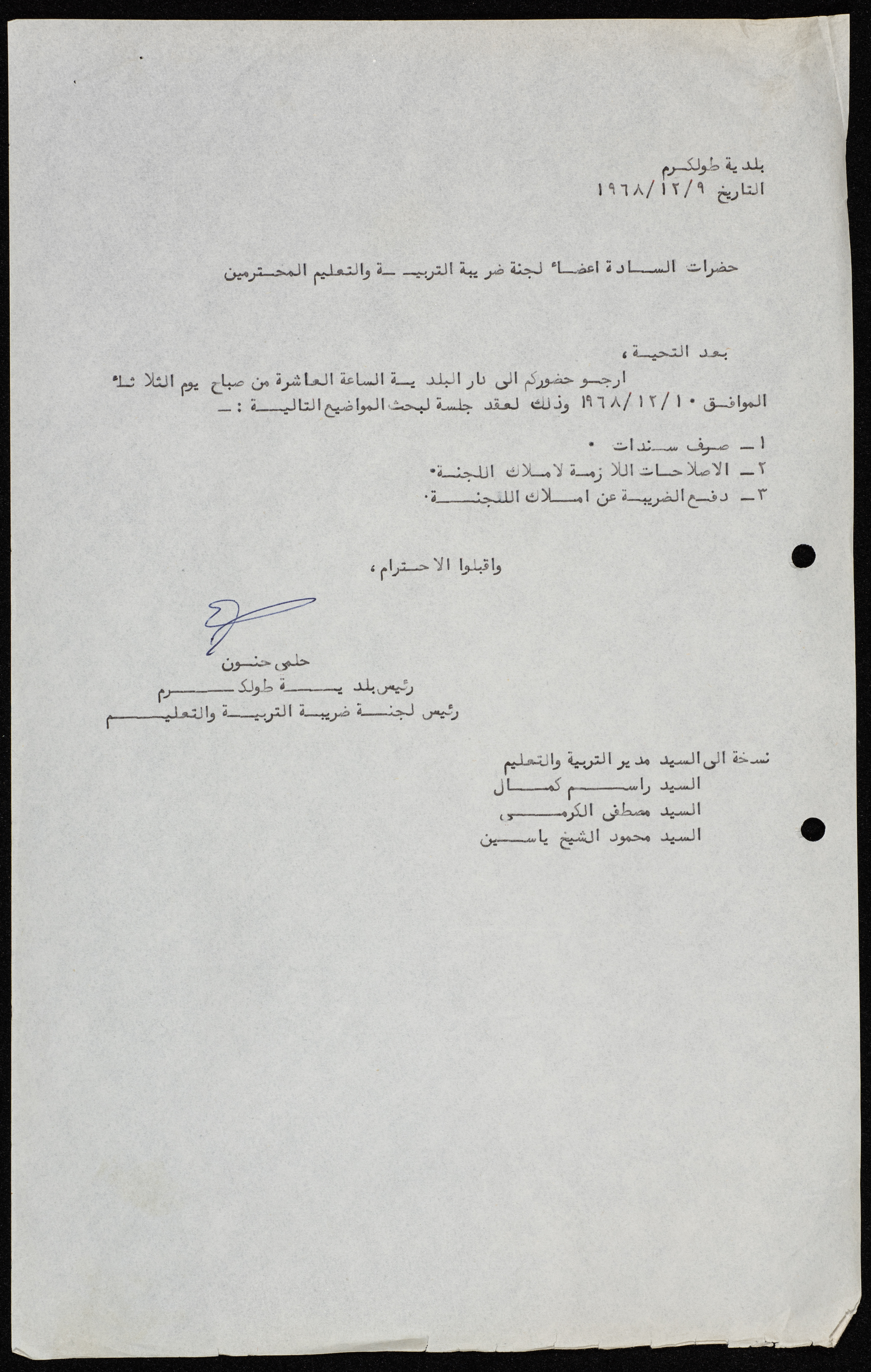 A letter from the mayor of Tulkarm, Hilmy Hannun to the members of the education committee, asking them to hold a session to discuss topics of the jurisdiction of the education tax committee.