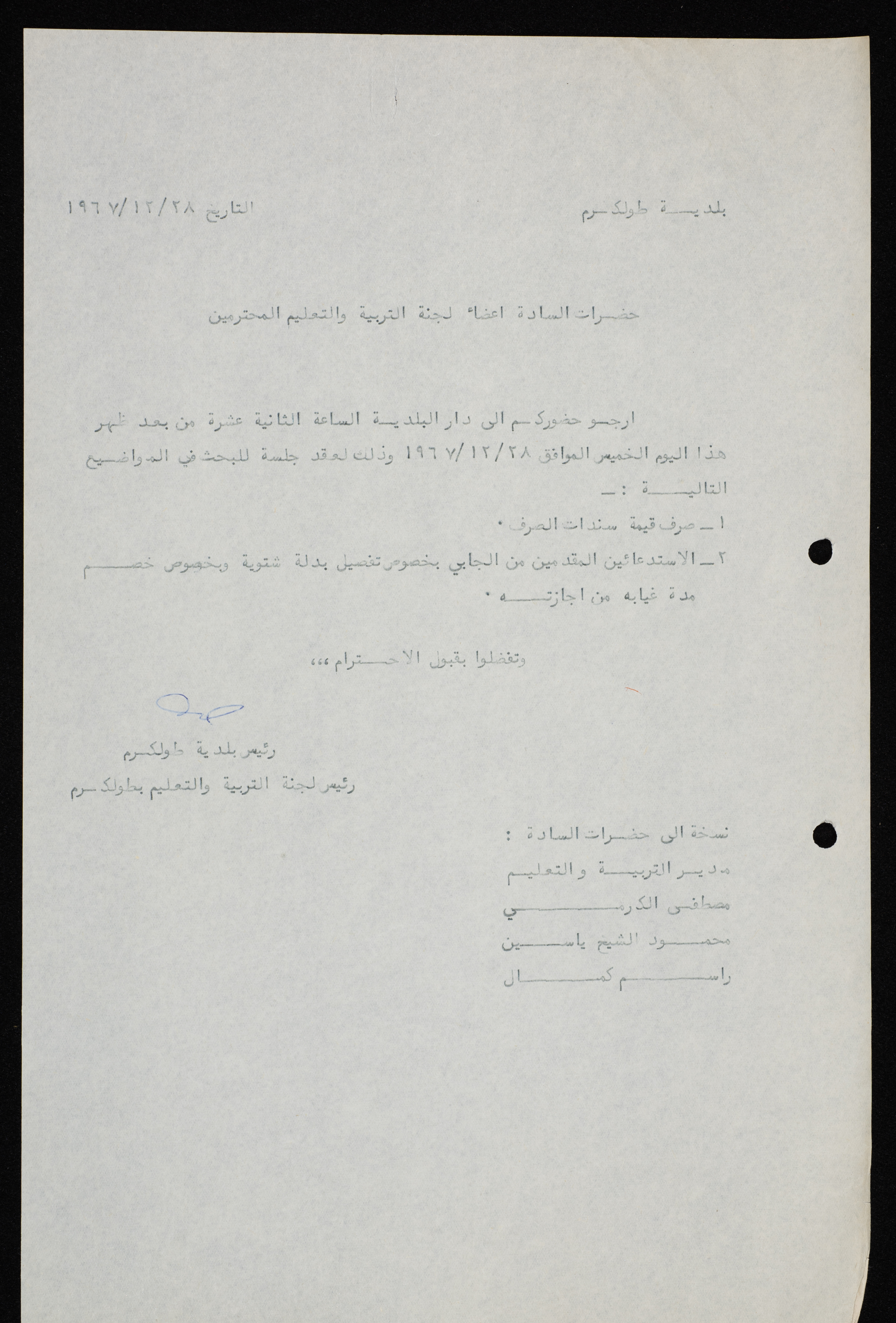 A letter from the mayor of Tulkarm, Hilmy Hannun to the members of the education committee, inviting them to the municipality to discuss some topics.