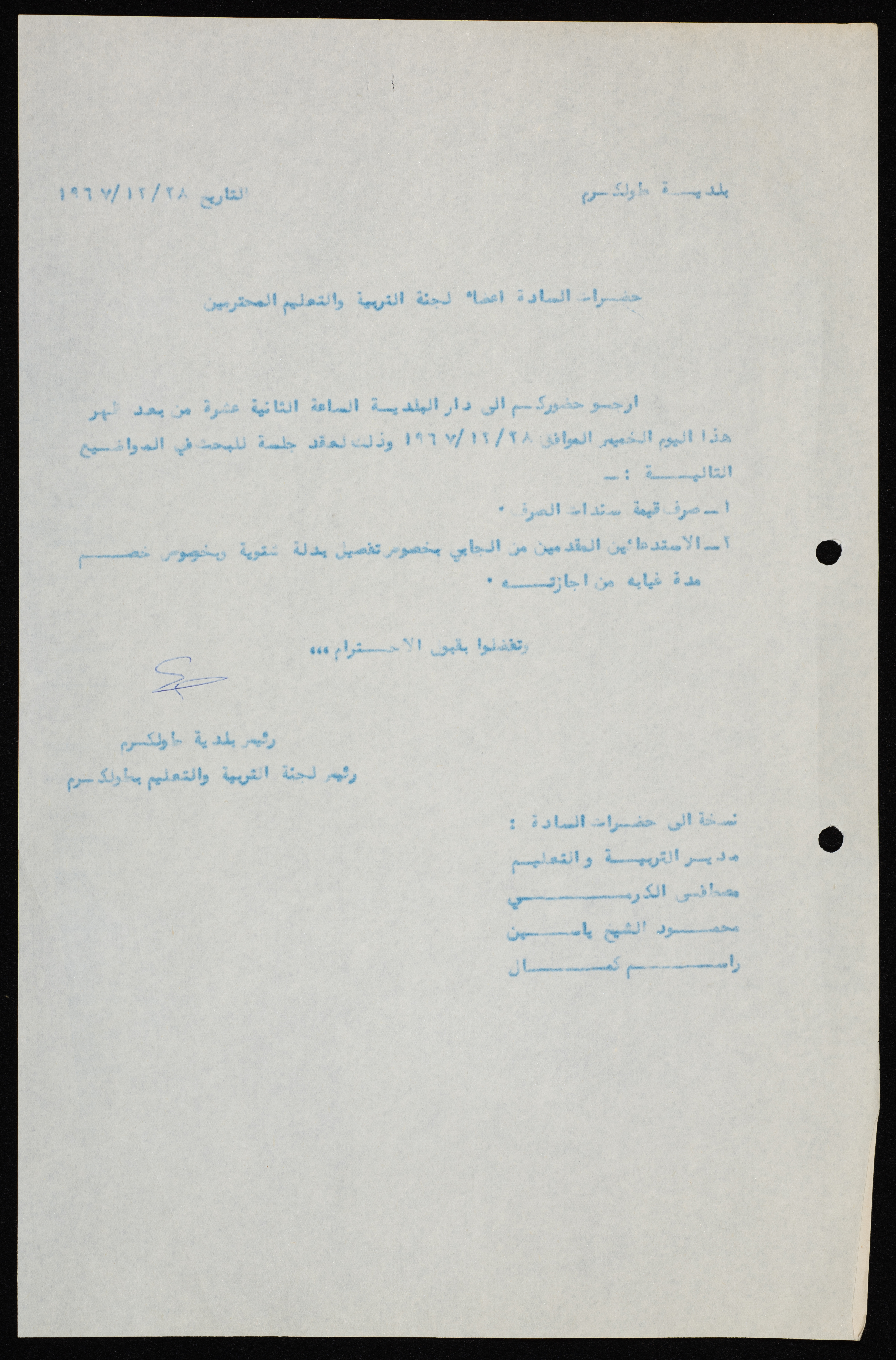 A letter from the mayor of Tulkarm, Hilmy Hannun to the members of the education committee, inviting them to the municipality to discuss some topics.