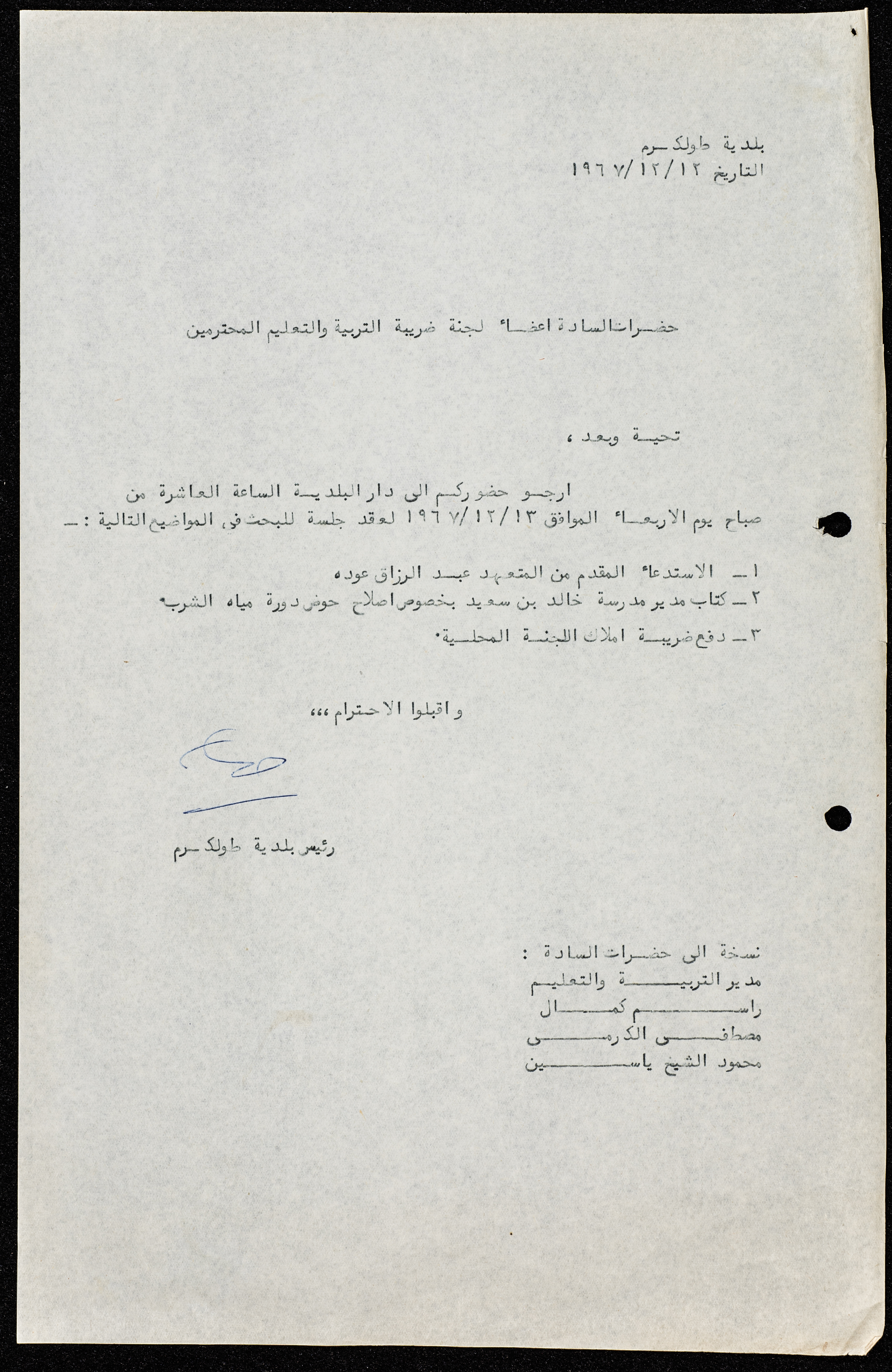 A letter from the mayor of Tulkarm, Hilmy Hannun to the members of the education committee, inviting them to the municipality to discuss some topics.