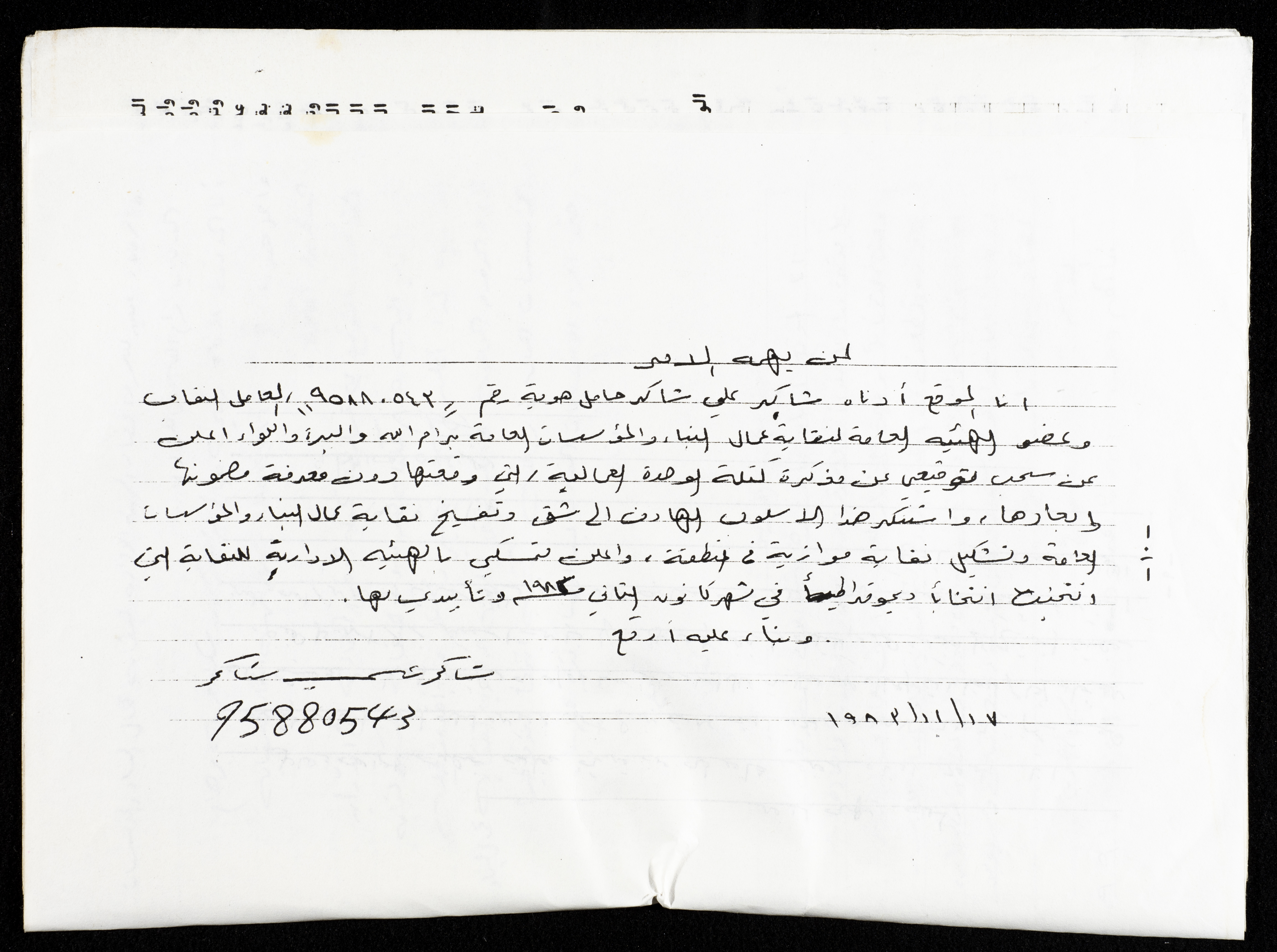 وثيقة صادر عن نقابة عمال البناء والمؤسسات العامة برام الله والبيرة، صادرة في تشرين الثاني 1983، تتناول مجموعة من القضايا والخلافات النقابية.