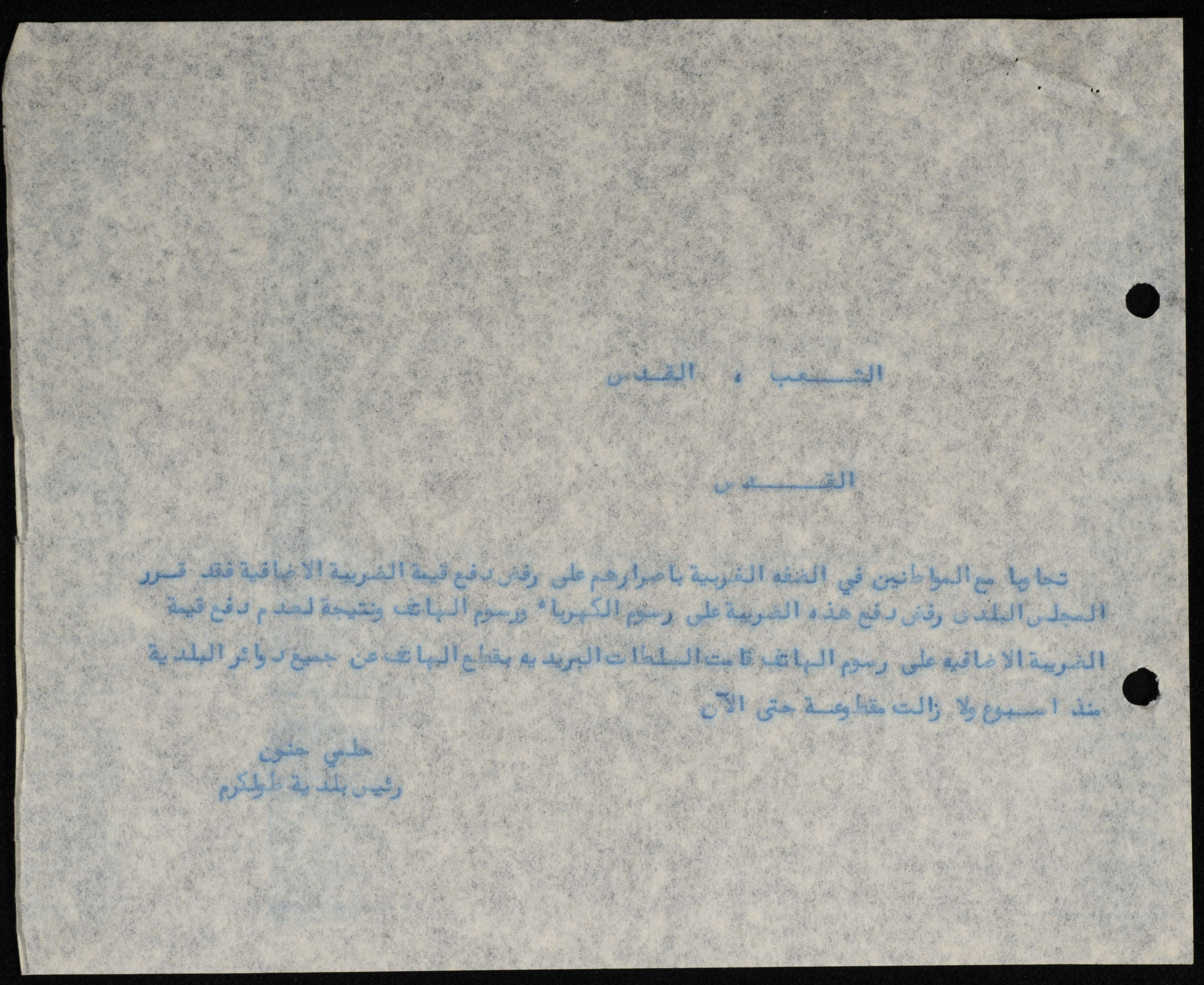 A letter sent to the newspapers ash-Sha'b and al-Quds. The letter is a declaration by the municipality of their refusal to pay the added-value tax to the occupation authorities in accordance with the wishes of the people.
