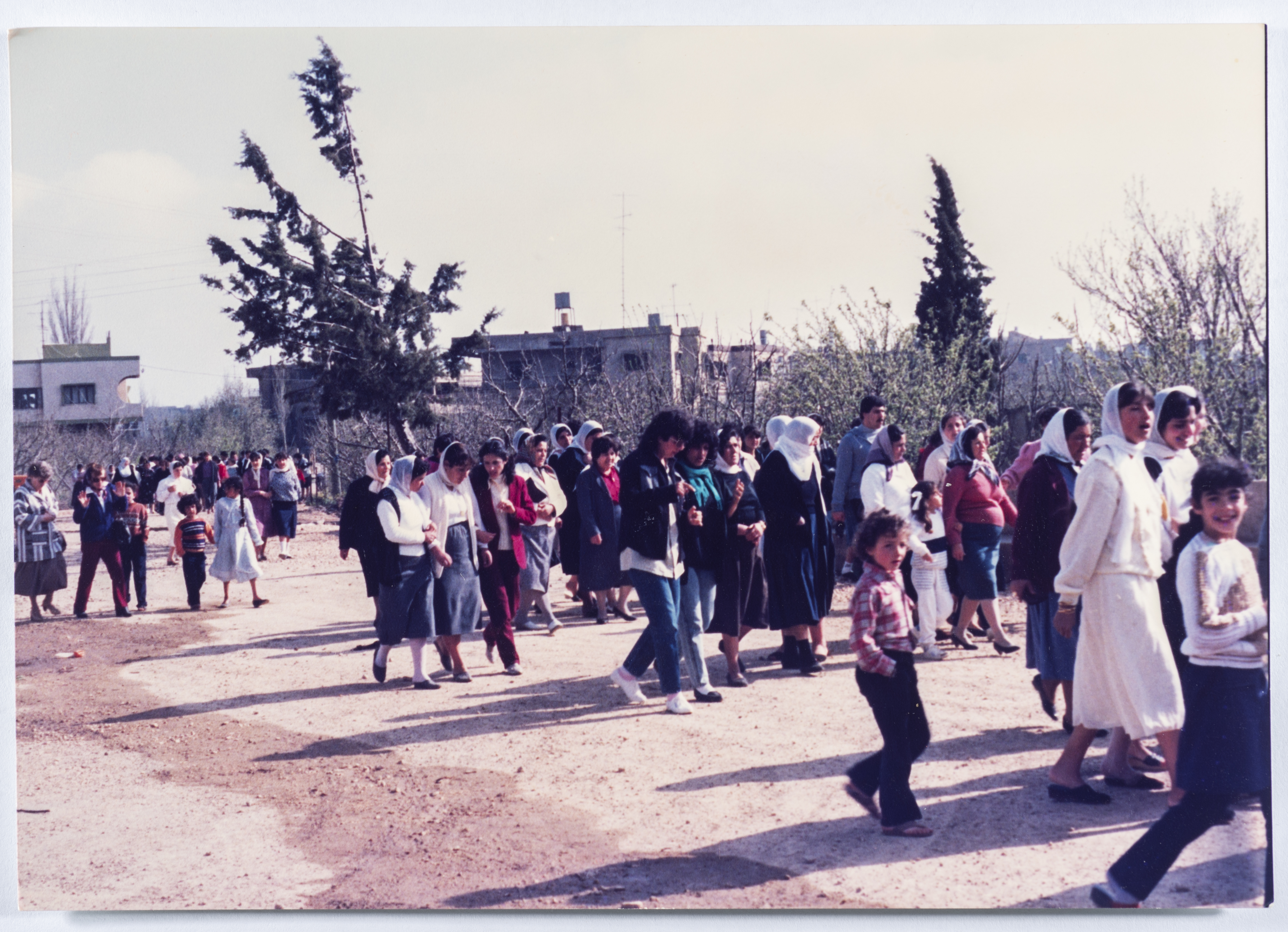 صورة ملونة، يظهر فيها مسيرة وفد قطري من حركة النساء الديمقراطية ونساء من الجولان السوري المحتل اثناء زيارة الضريح الشهيده غاليه فرحات من قرية بقعاثا التي سقطت برصاص جيش الاحتلال الاسرائيلي عام 1987 خلال مظاهرات رفض قبول الهوية الاسرائيلية.