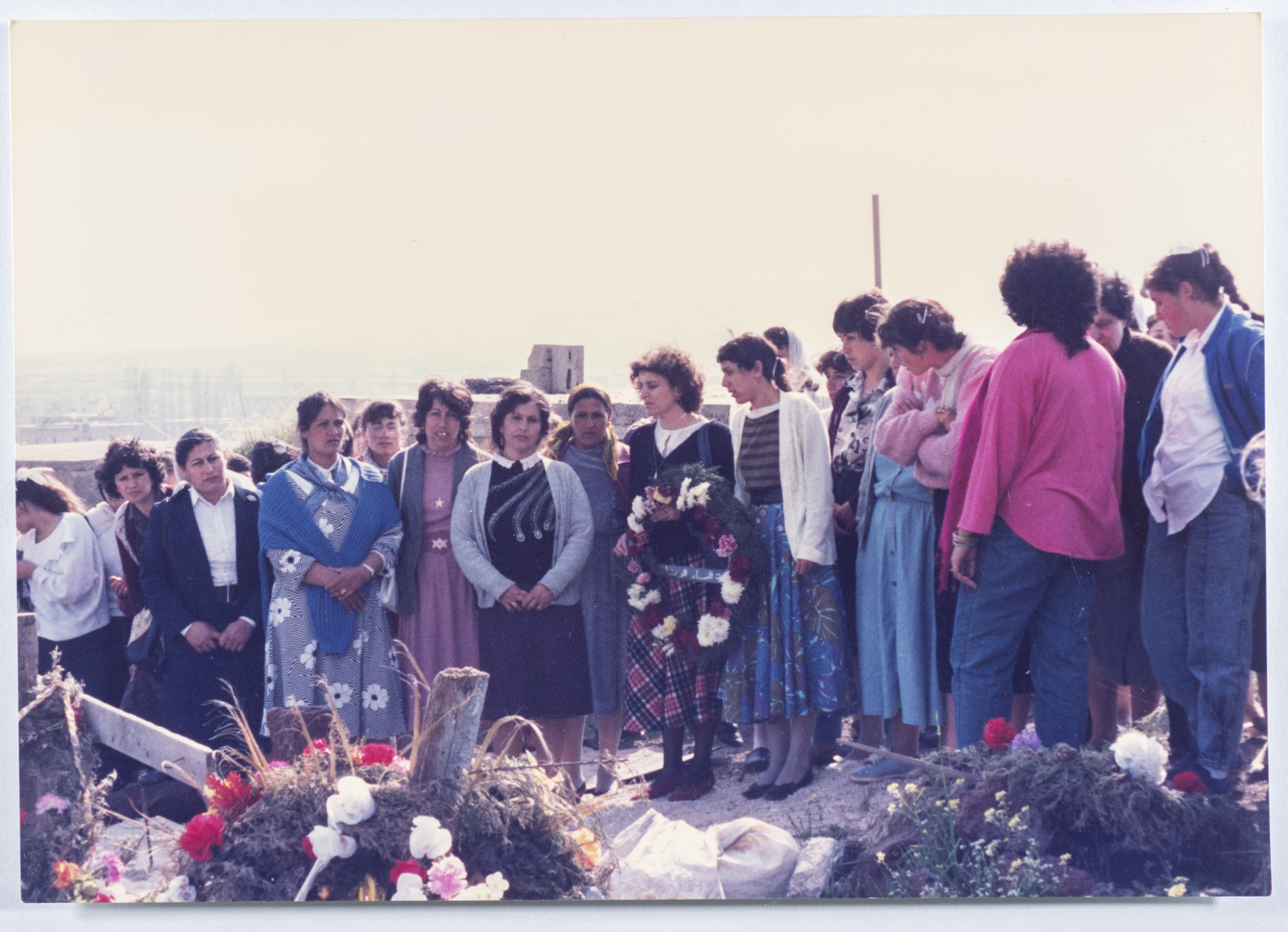 صورة ملونة، يظهر فيها مسيرة وفد قطري من حركة النساء الديمقراطية ونساء من الجولان السوري المحتل اثناء زيارة الضريح الشهيده غاليه فرحات من قرية بقعاثا التي سقطت برصاص جيش الاحتلال الاسرائيلي عام 1987 خلال مظاهرات رفض قبول الهوية الاسرائيلية.