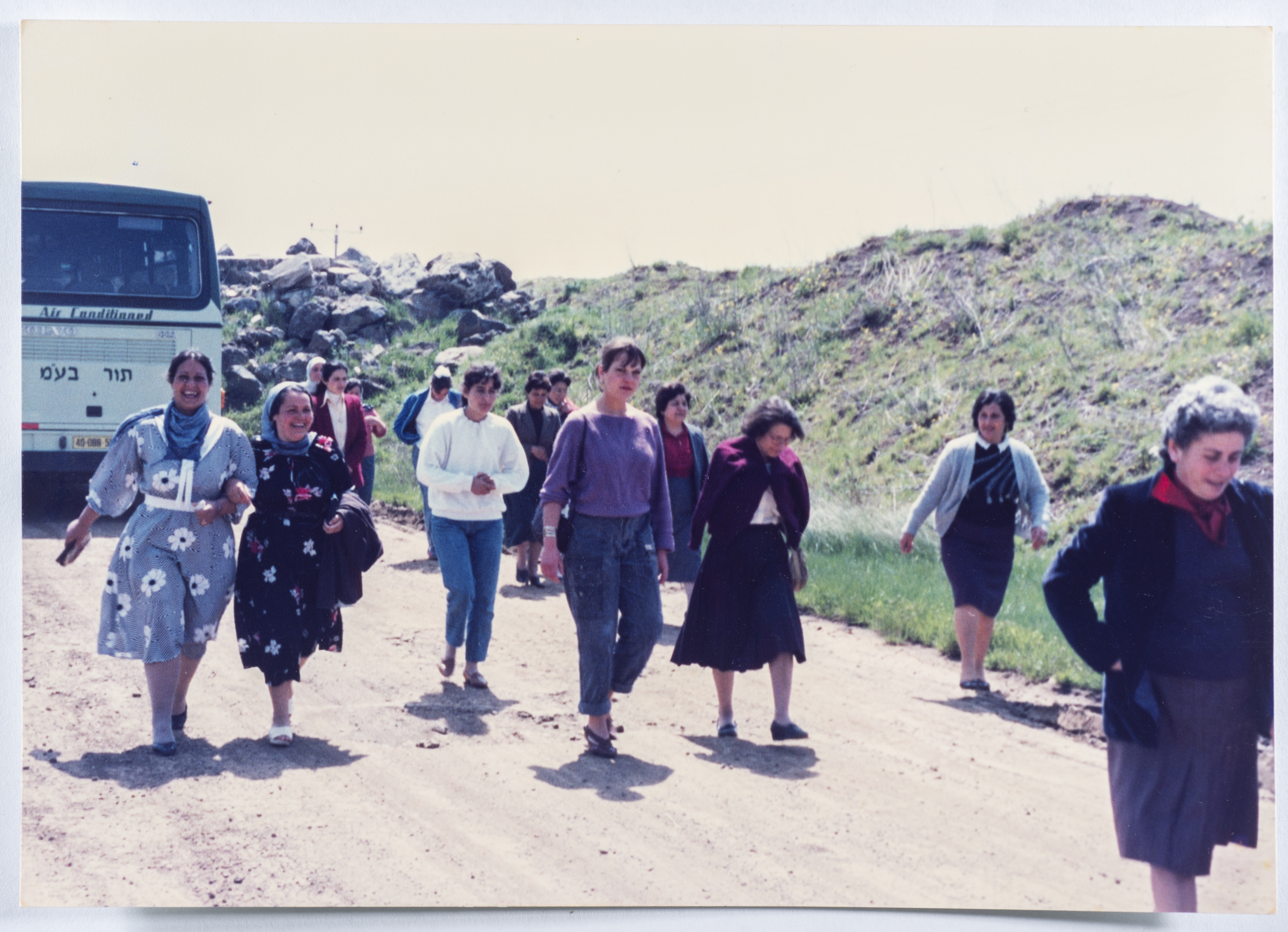 صورة ملونة، يظهر فيها مسيرة وفد قطري من حركة النساء الديمقراطية ونساء من الجولان السوري المحتل اثناء زيارة الضريح الشهيده غاليه فرحات من قرية بقعاثا التي سقطت برصاص جيش الاحتلال الاسرائيلي عام 1987 خلال مظاهرات رفض قبول الهوية الاسرائيلية.