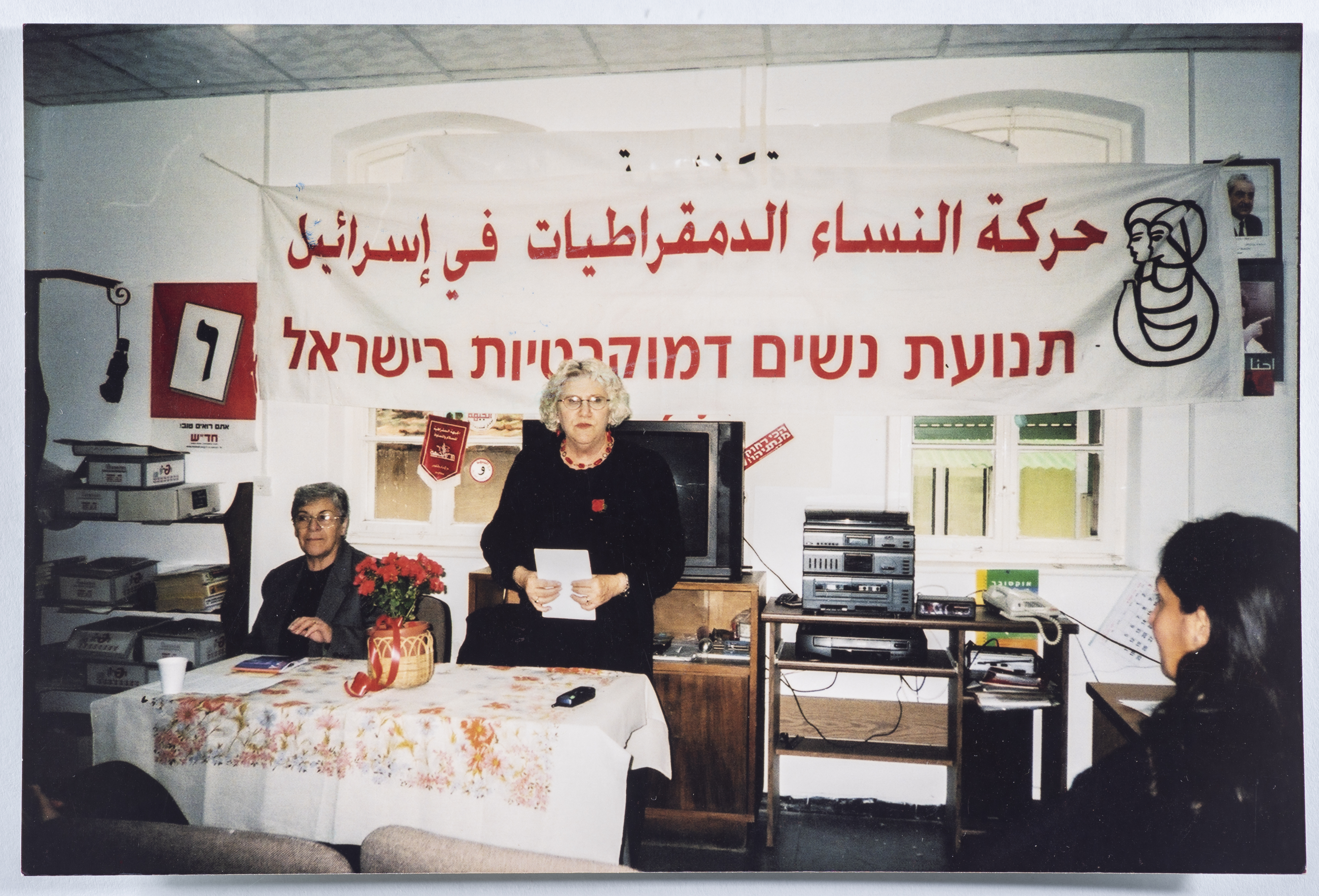 A photograph of Jochived Goten in Haifa leading the Country Council of the Movement of Democratic Women in Israel.