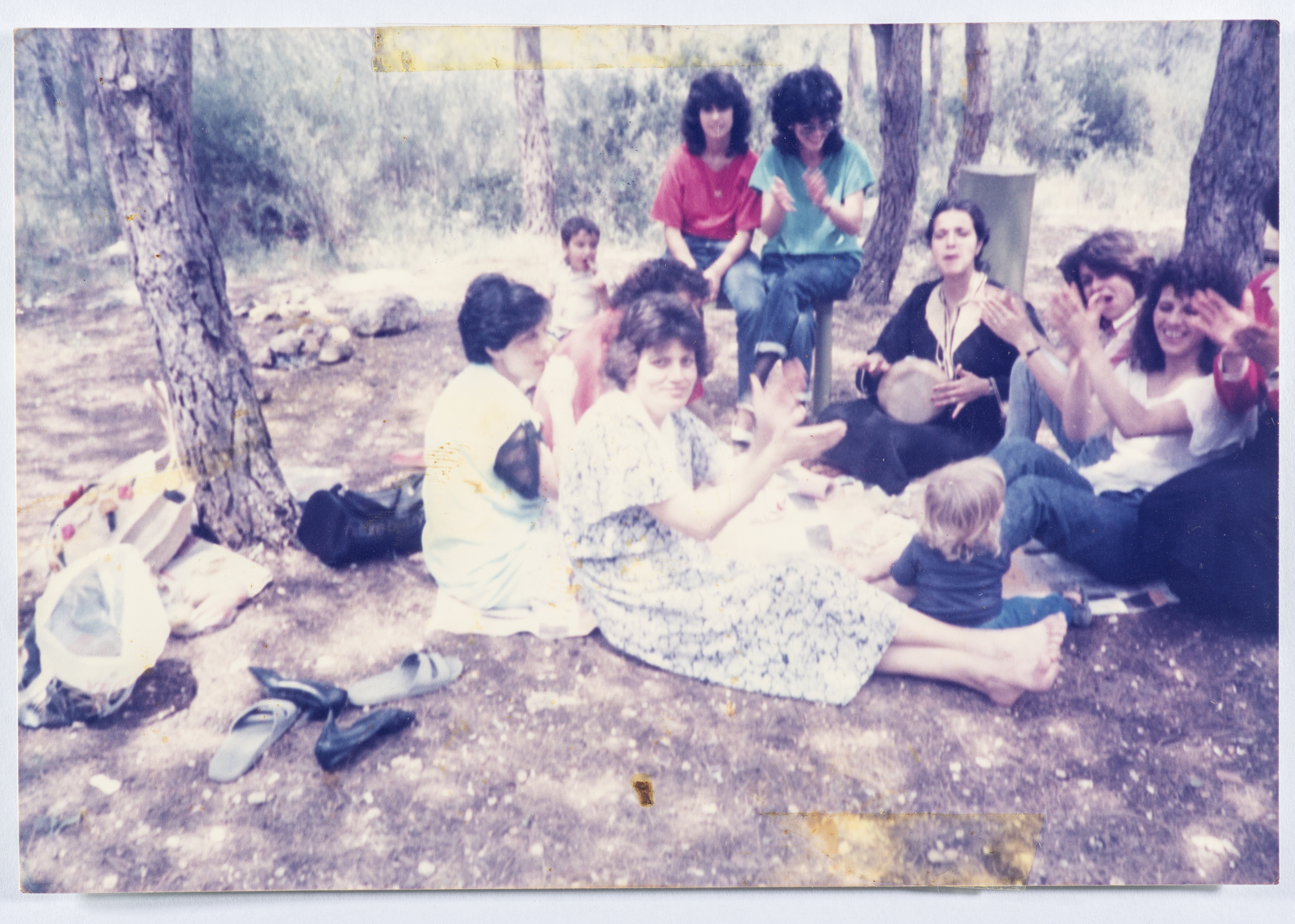 صورة ملونة، يظهر فيها لقاء بين نساء من الرمله يهوديات وعربيات ونساء من شفاعمرو على ارض قريه هويته المهجره في أب 1983