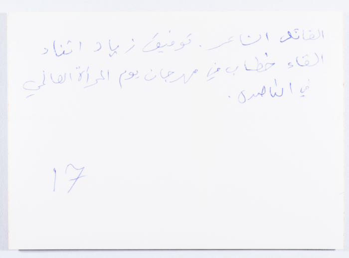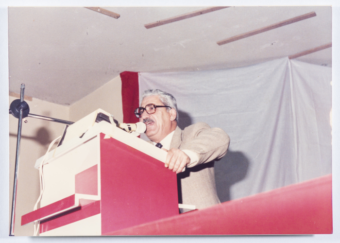 .صوة ملونة، يظهر فيها القائد الشاعر توفيق زياد اثناء القاء خطاب في مهرجان يوم المرأة العالمي في الناصره