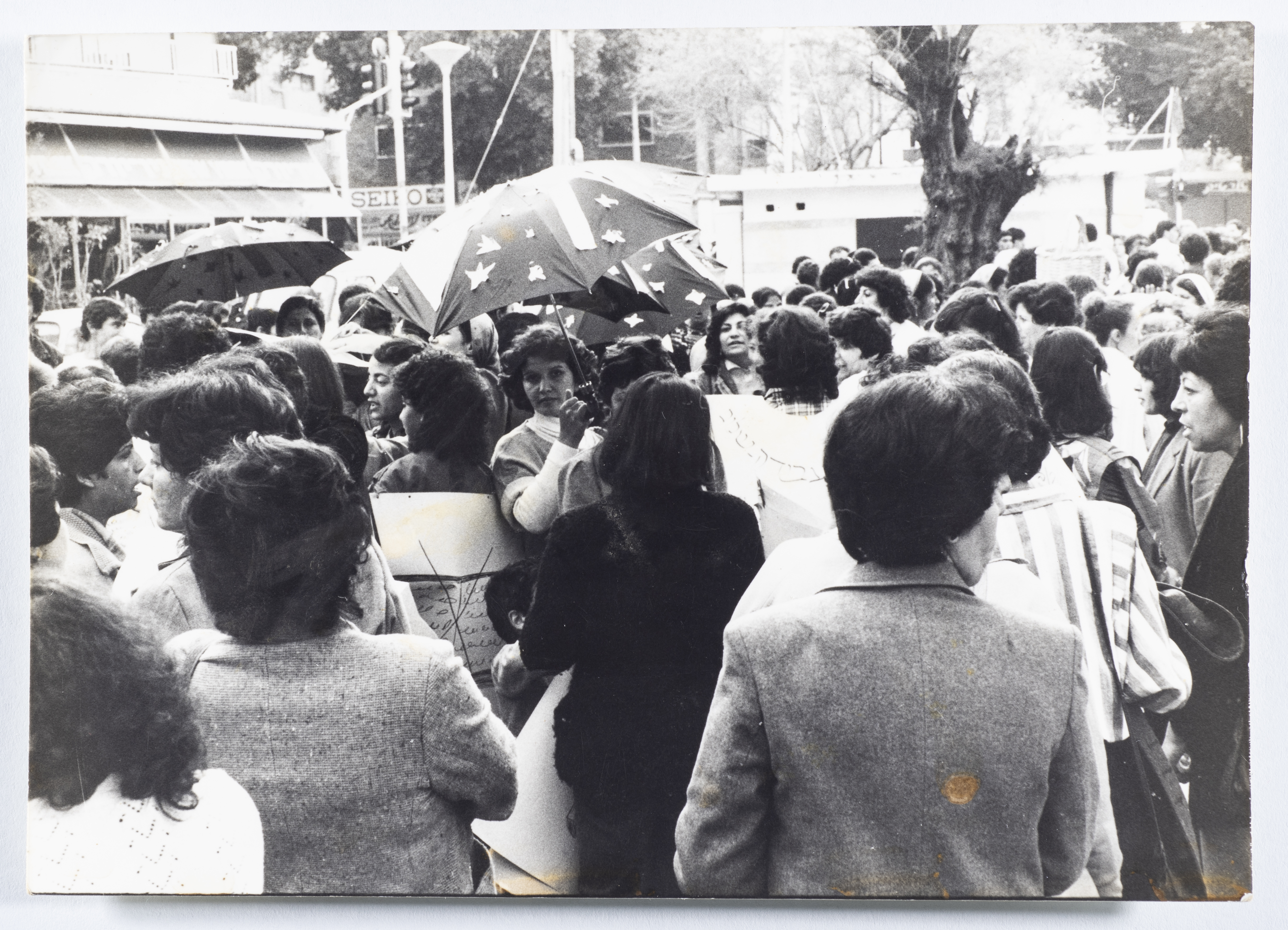 .صورة غير ملونة، تظهر فيها فتيحة الصغير واخرون في مظاهرة بمناسة 8 آذار 1993 بمبادرة حركة النساء الديمقراطيات في مركز تل ابيب;صورة ملونة، تظهر فيها مجموعة من النساء اثناء مظاهر 8 آذار 1986