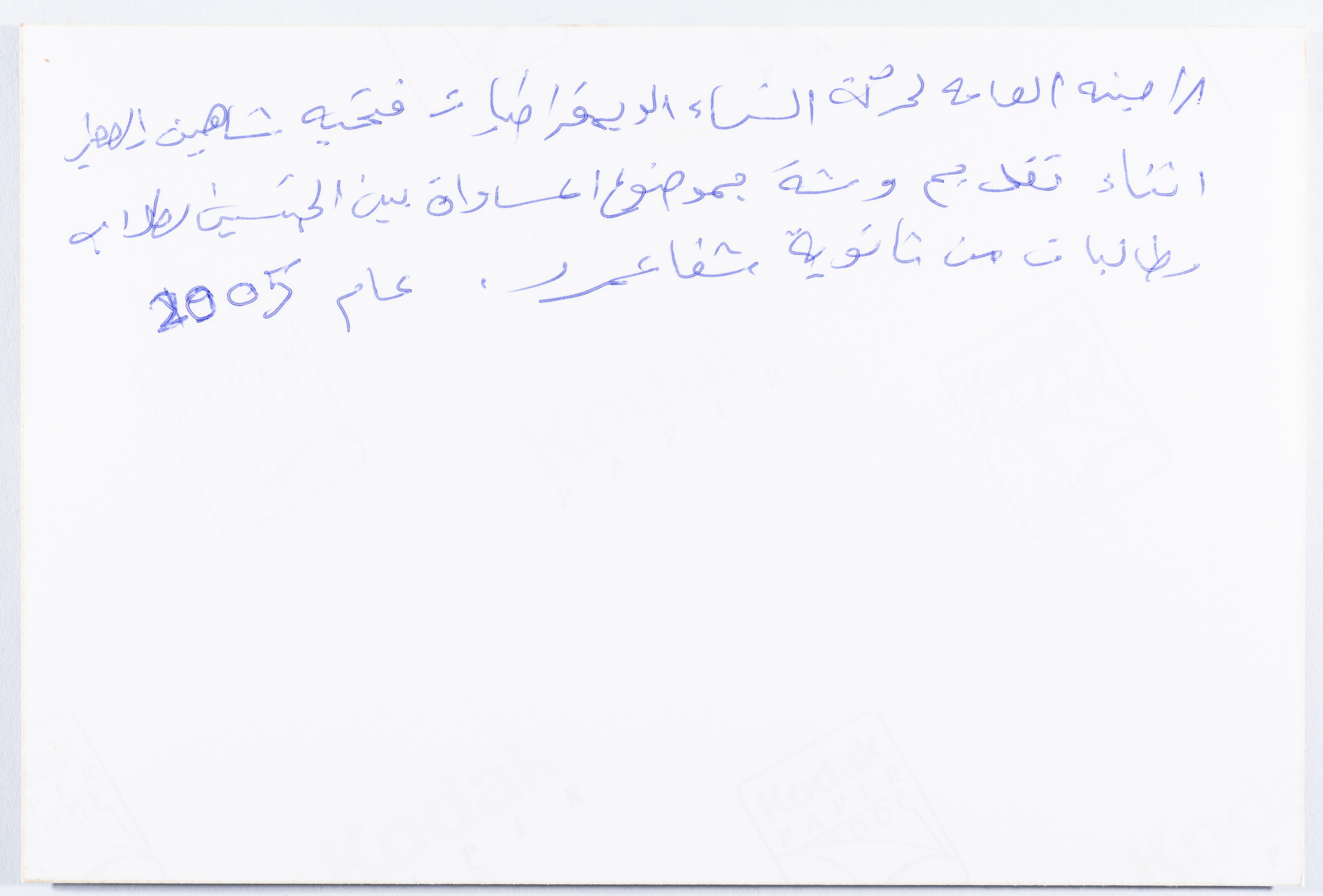 A colour photograph of Fathia Shaheen; Secretary-General of the Movement of Democratic Women during a workshop on gender equality for the students of Shafa Amro High School, 2005
