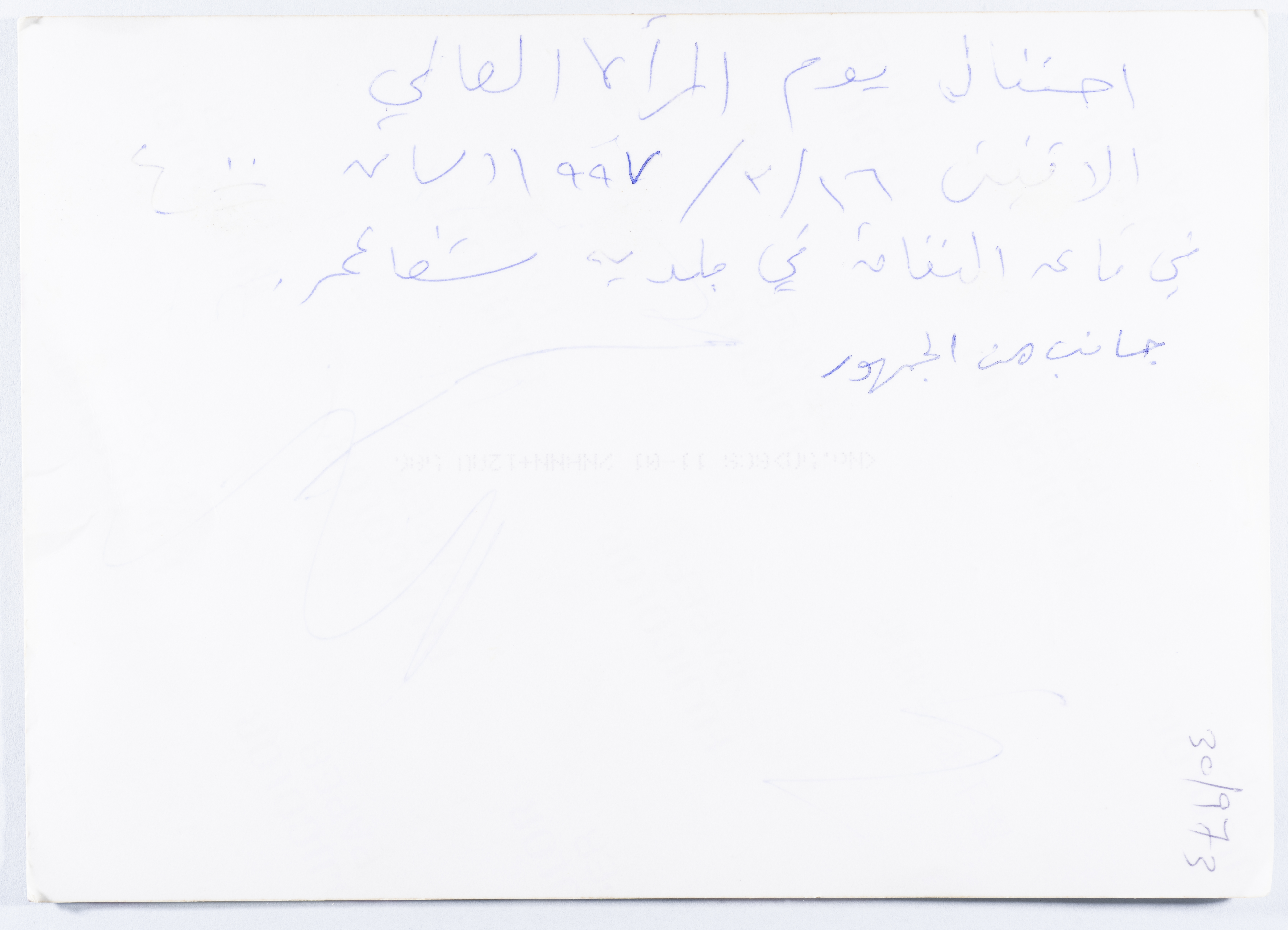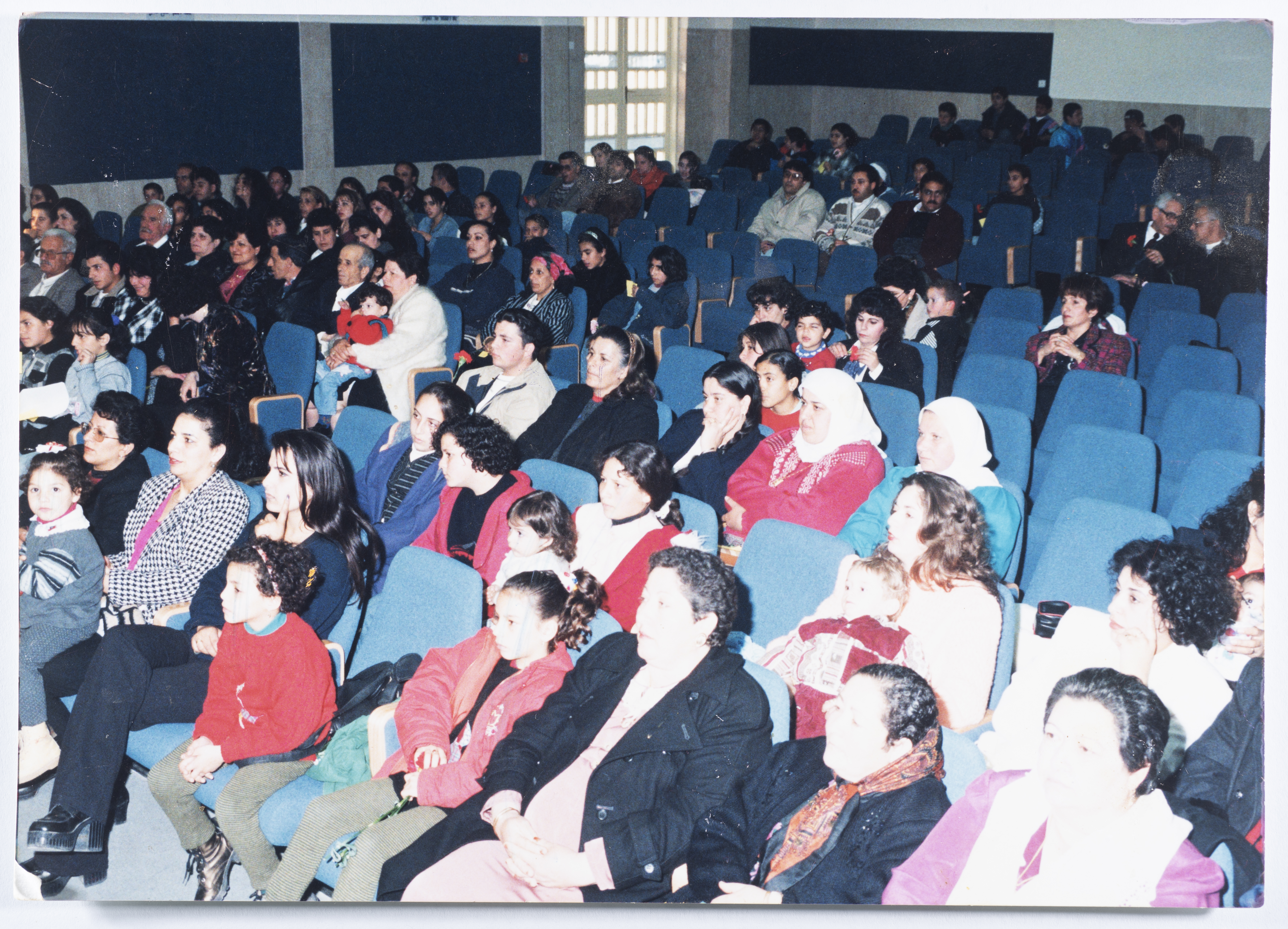 A colour photograph of people during the International Women's Day celebration on 16/3/1997 at the Culture Hall in Shafa Amro