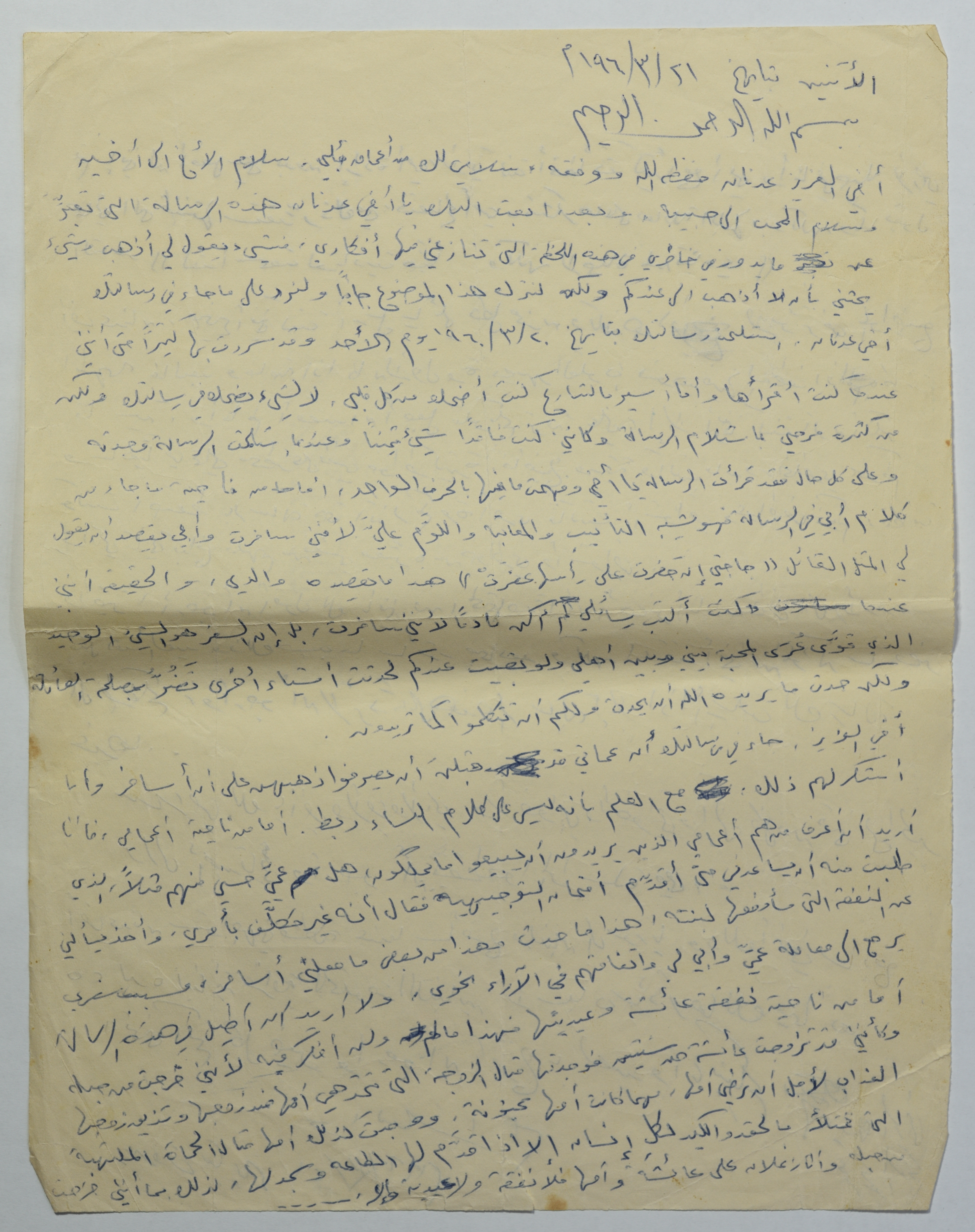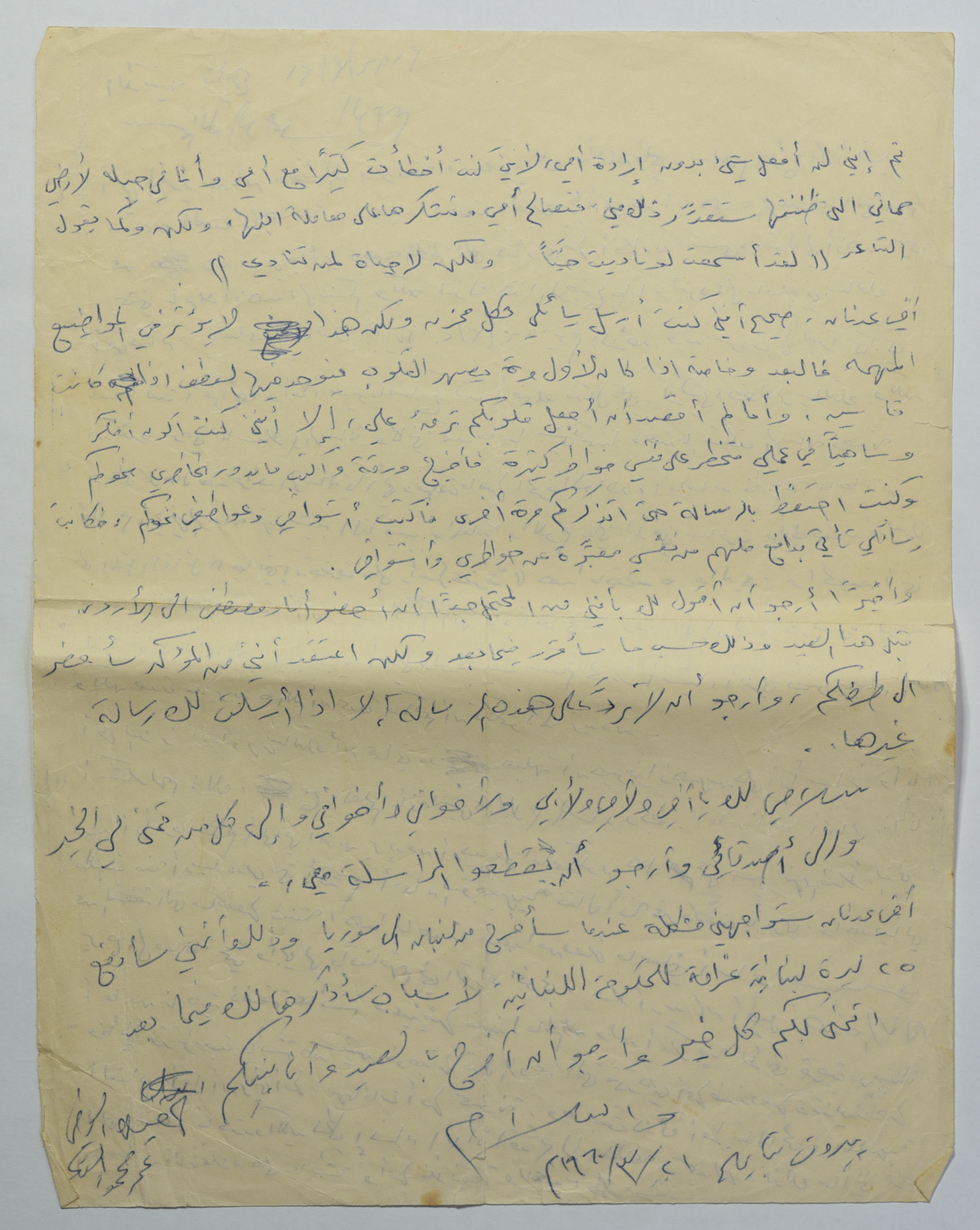 رسالة مؤرخة في 21 آذار 1960، أرسلها عمر القاسم في بيروت لشقيقه عدنان.