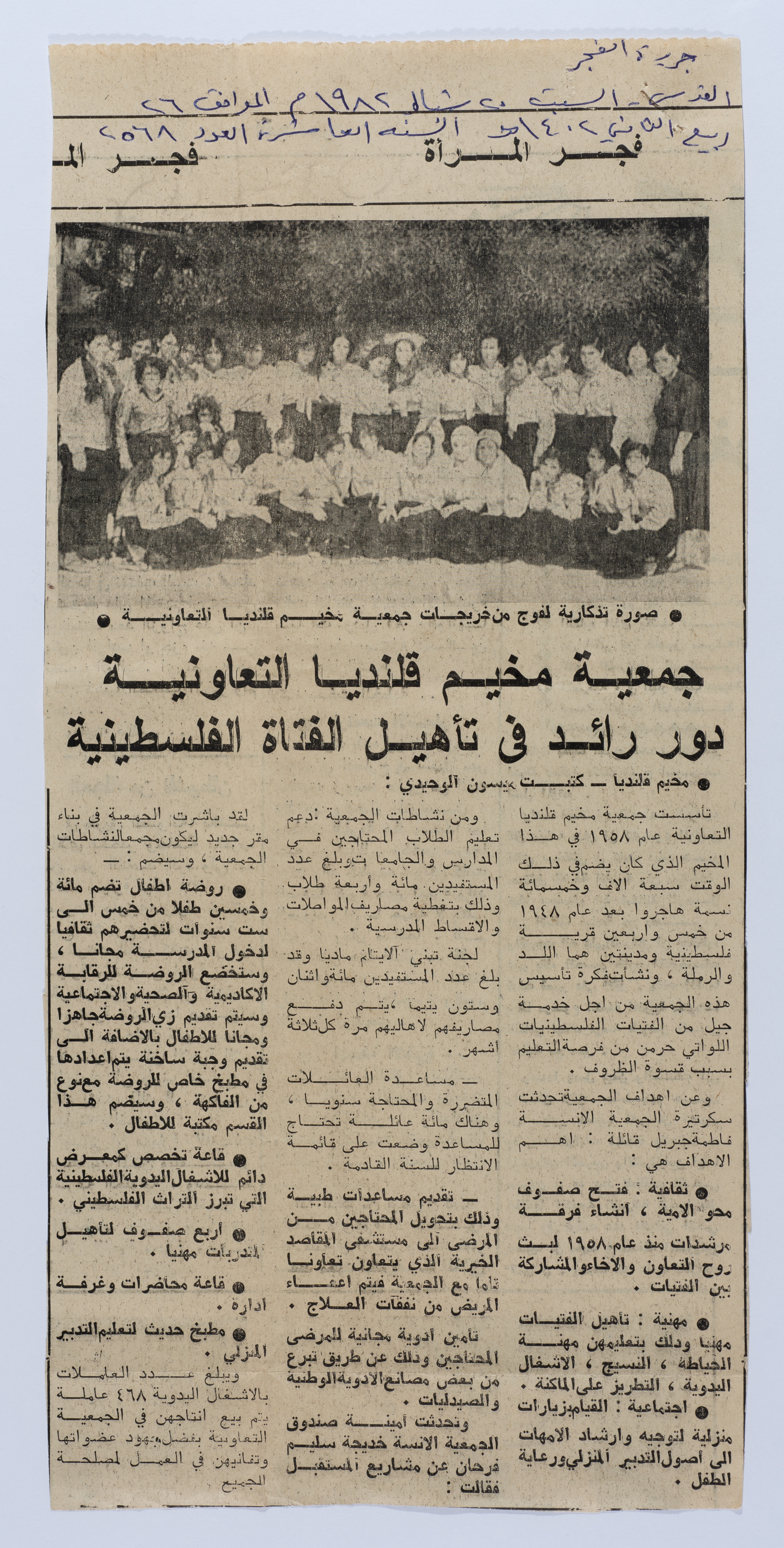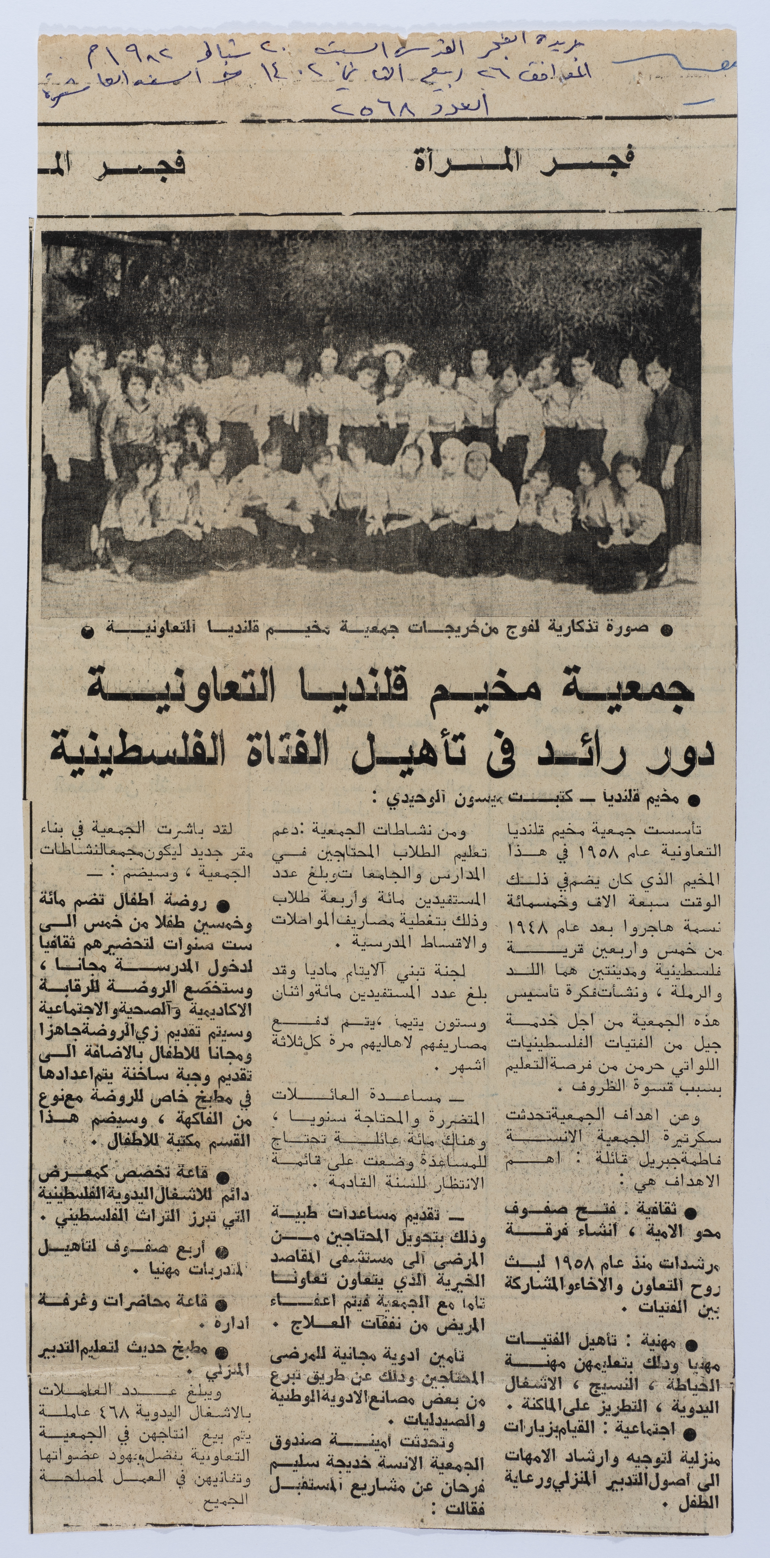 مادة مطبوعة باللغة العربية، وهي من جريدة الفجر، العدد 2568، منشورة بتاريخ 20 شباط 1982، تتناول دور المرأة الفلسطينية والعمل النسوي في المخيم.