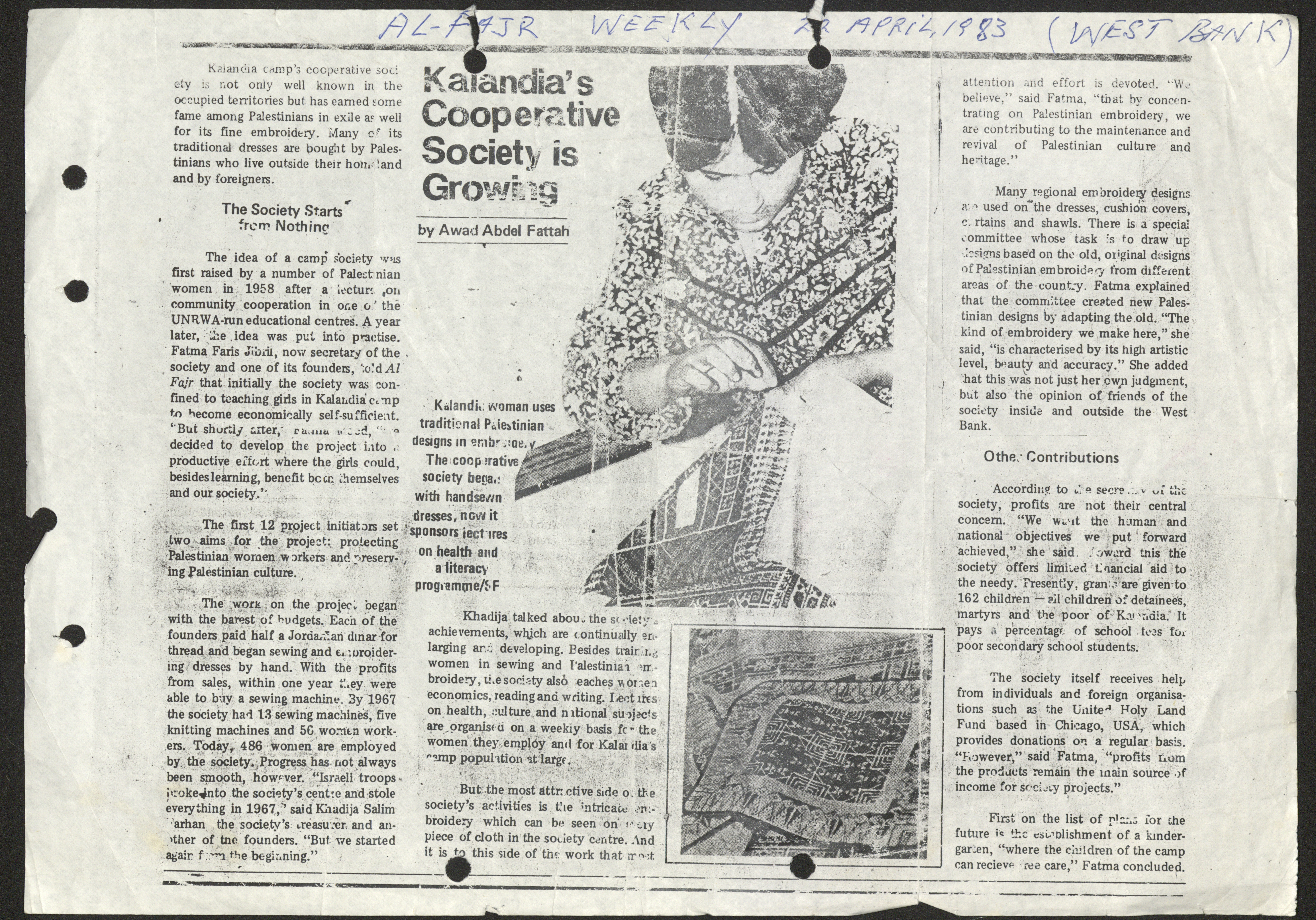A publication of Al-Fajr Newspaper; printed in English on 22/4/1983. The article talks about the role of Qalandia Camp Women Handicraft Cooperative Society in community, women's and cooperative work.