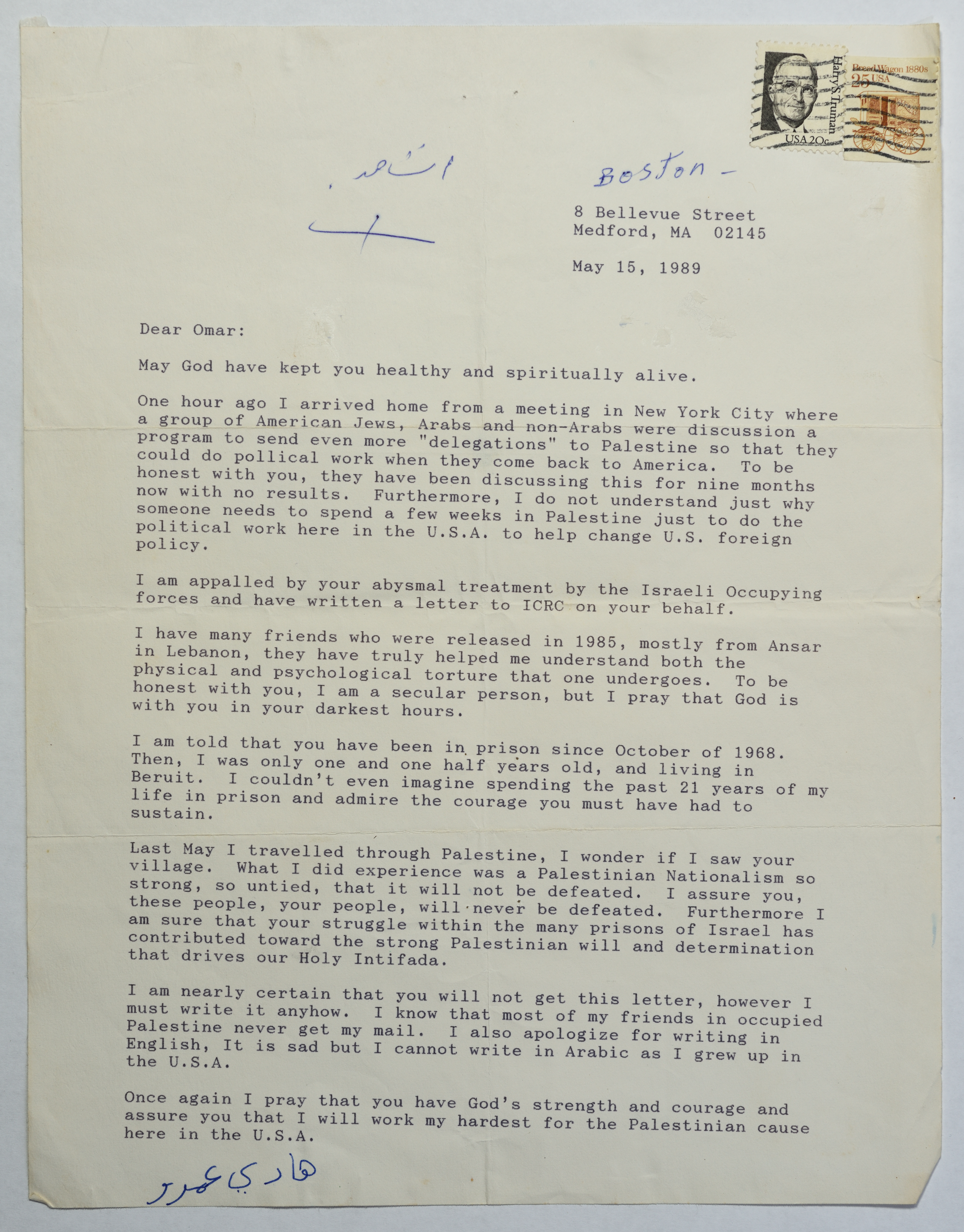 Sent on 15 May 1989, this document shows a letter from Hadi Amr in the American State of Boston to Omar al-Qasim in prison.