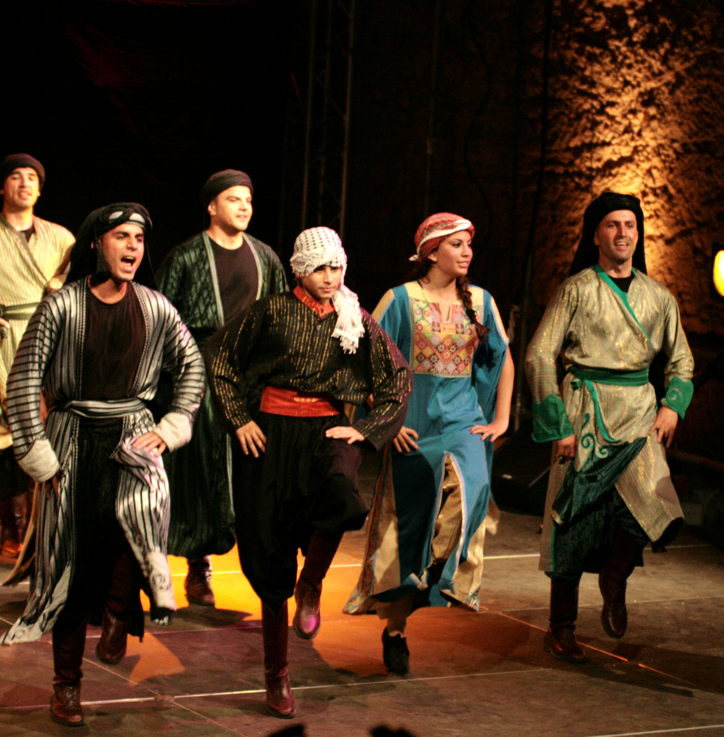 صورة ملونة ترصد ملمحاً من مشاركة فرقة الفنون الشعبية ضمن فعاليات مهرجان القدس 2008 بتنظيمٍ من مؤسسة يبوس في موقع قبور السلاطين الأثري.