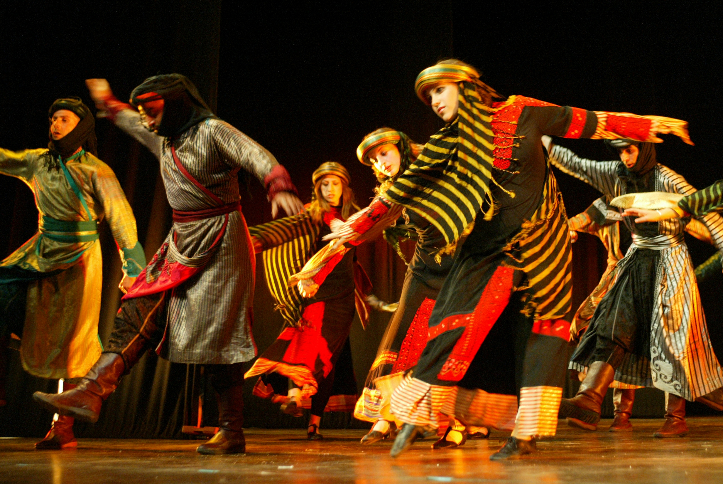 صورة ملونة التقطت في 11 أيار 2006 ترصد لمحة من العروض الراقصة التي قدمتها فرقة الفنون الشعبية على خشبة مسرح القصر الثقافي في رام الله في عيدها السابع والعشرين.