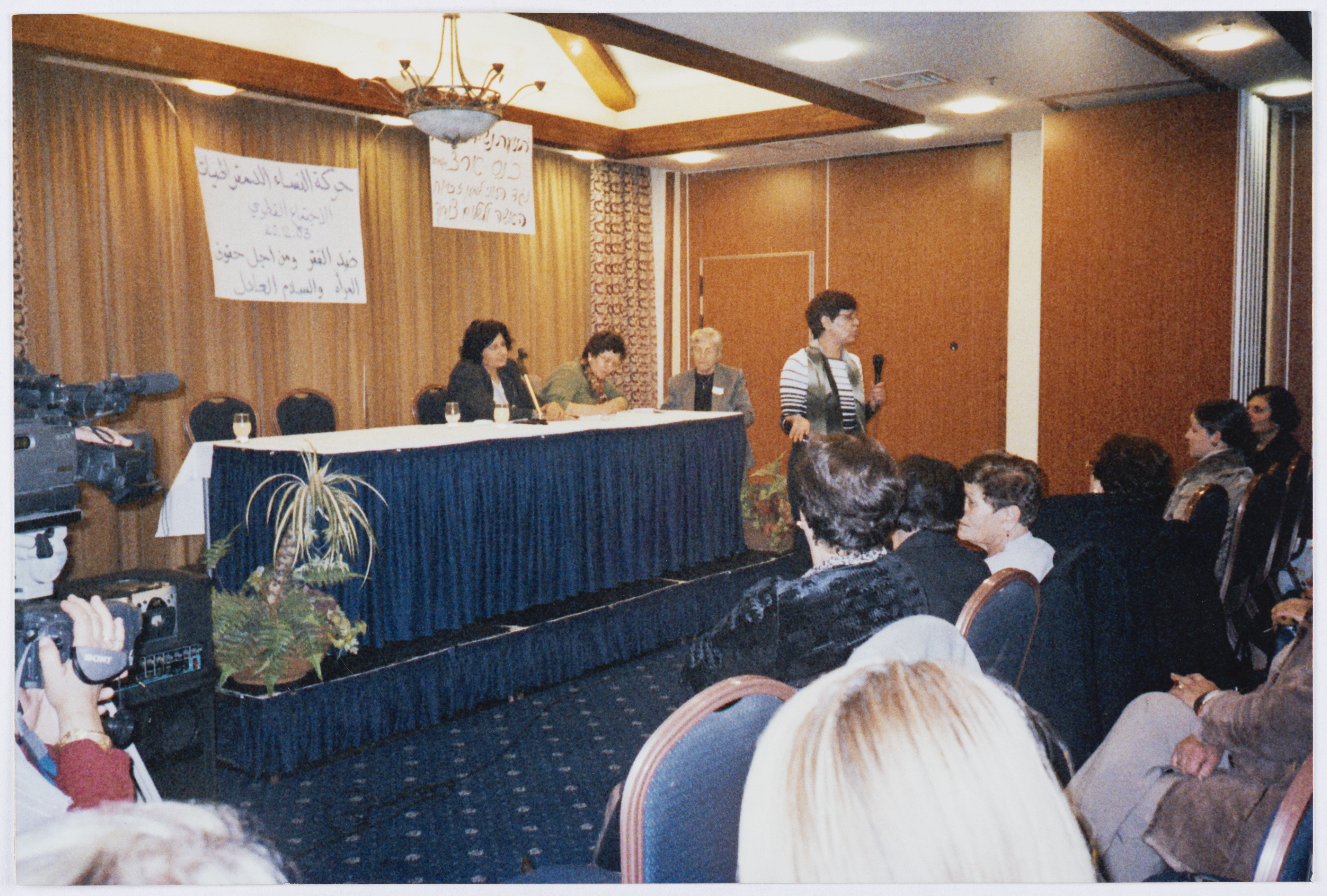 صورة ملونة، تظهر فيها حركة النساء الديمقراطيات اثناء الاجتماع القطري ضد الفقر ومن اجل حقوق المرأه والسلام العادل